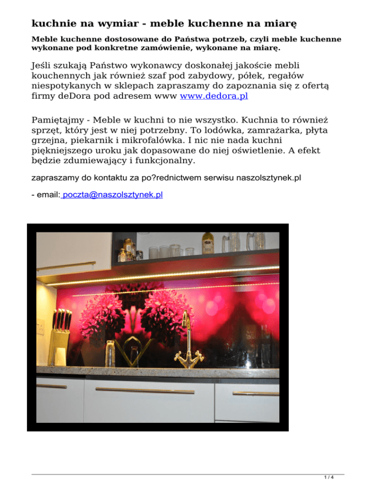 kuchnie na wymiar - meble kuchenne na miarę Meble kuchenne dostosowane do Państwa potrzeb, czyli meble kuchenne wykonane pod konkretne zamówienie, wykonane na miarę. Jeśli szukają Państwo wykonawcy doskonałej jakoście mebli kouchennych jak również szaf pod zabydowy, półek, regałów niespotykanych w sklepach zapraszamy do zapoznania się z ofertą firmy deDora pod adresem www www.dedora.pl Pamiętajmy - Meble w kuchni to nie wszystko. Kuchnia to również sprzęt, który jest w niej potrzebny. To lodówka, zamrażarka, płyta grzejna, piekarnik i mikrofalówka. I nic nie nada kuchni piękniejszego uroku jak dopasowane do niej oświetlenie. A efekt będzie zdumiewający i funkcjonalny. zapraszamy do kontaktu za po?rednictwem serwisu naszolsztynek.pl - email: [email protected] 1/4 2/4 3/4 Article ID: 51 Last updated: 02 Nov, 2016 Revision: 12 OLSZTYNEK -> FIRMY I INSTYTUCJE -> kuchnie na wymiar - meble kuchenne na miarę http://naszolsztynek.pl/entry/51/ 4/4 Powered by TCPDF (www.tcpdf.org)