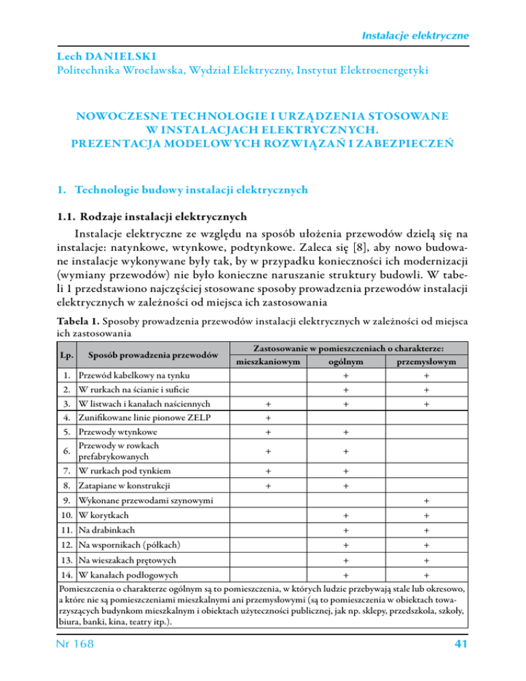 Instalacje elektryczne Lech Danielski Politechnika Wrocławska, Wydział Elektryczny, Instytut Elektroenergetyki Nowoczesne technologie i urządzenia stosowane w instalacjach elektrycznych. Prezentacja modelowych rozwiązań i zabezpieczeń 1. Technologie budowy instalacji elektrycznych 1.1.Rodzaje instalacji elektrycznych Instalacje elektryczne ze względu na sposób ułożenia przewodów dzielą się na instalacje: natynkowe, wtynkowe, podtynkowe. Zaleca się [8], aby nowo budowane instalacje wykonywane były tak, by w przypadku konieczności ich modernizacji (wymiany przewodów) nie było konieczne naruszanie struktury budowli. W tabeli 1 przedstawiono najczęściej stosowane sposoby prowadzenia przewodów instalacji elektrycznych w zależności od miejsca ich zastosowania Tabela 1. Sposoby prowadzenia przewodów instalacji elektrycznych w zależności od miejsca ich zastosowania Lp. Sposób prowadzenia przewodów 1. Przewód kabelkowy na tynku Zastosowanie w pomieszczeniach o charakterze: mieszkaniowym ogólnym przemysłowym + + 2. W rurkach na ścianie i suficie + + + + 3. W listwach i kanałach naściennych + 4. Zunifikowane linie pionowe ZELP + 5. Przewody wtynkowe Przewody w rowkach 6. prefabrykowanych + + + + 7. W rurkach pod tynkiem + + 8. Zatapiane w konstrukcji + + 9. Wykonane przewodami szynowymi + 10. W korytkach + + 11. Na drabinkach + + 12. Na wspornikach (półkach) + + 13. Na wieszakach prętowych + + 14. W kanałach podłogowych + + Pomieszczenia o charakterze ogólnym są to pomieszczenia, w których ludzie przebywają stale lub okresowo, a które nie są pomieszczeniami mieszkalnymi ani przemysłowymi (są to pomieszczenia w obiektach towarzyszących budynkom mieszkalnym i obiektach użyteczności publicznej, jak np. sklepy, przedszkola, szkoły, biura, banki, kina, teatry itp.). Nr 168 41 Instalacje elektryczne 1.2.Instalacje wykonane przewodami kabelkowymi umieszczonymi na tynku Instalacje wykonane przewodami kabelkowymi umieszczonymi na tynku należą do najprostszych w wykonaniu i najstarszych technologicznie instalacji. Przewód instalacyjny osadza się w specjalnych uchwytach zamocowanych do konstrukcji budowlanej. Wszelkie połączenia i rozgałęzienia instalacji powinny być wykonywane wyłącznie w natynkowych puszkach rozgałęźnych. Instalacje takie są bardzo łatwe do wykonania oraz zapewniają możliwość dogodnej konserwacji i remontów. Wadą ich jest niezbyt estetyczny wygląd i dlatego są one stosowane głównie w pomieszczeniach przemysłowych i rzadziej w pomieszczeniach o charakterze ogólnym (np. garaże, piwnice, pralnie, kotłownie itp.). 1.3. Instalacje wykonane przewodami umieszczonymi w rurkach mocowanych na ścianie i suficie Podobnie jak instalacje wykonane przewodami kabelkowymi umieszczonymi na tynku, instalacje wykonane przewodami umieszczonymi w rurkach mocowanych na ścianie i suficie są stosowane głównie w pomieszczeniach przemysłowych i rzadziej w pomieszczeniach o charakterze ogólnym. W systemie tym stosuje się rurki stalowe lub z tworzywa sztucznego, które zapewniają ochronę przewodów przed uszkodzeniami mechanicznymi. Rurki stalowe stosuje się w miejscach występowania szczególnie dużych narażeń mechanicznych. W przypadku dużej agresywności chemicznej środowiska instalacja może być wykonywana jako hermetyczna. Rurki wykonane z twardego polichlorku winylu są przeznaczone do wykonywania instalacji elektrycznych wewnątrz pomieszczeń. Wszelkie połączenia i rozgałęzienia instalacji powinny być wykonywane wyłącznie w natynkowych puszkach rozgałęźnych. Stosowane w tych instalacjach elementy łączące (złączki karbowane-kompensacyjne) i mocujące (uchwyty) pozwalają łatwo i szybko wykonać instalację elektryczną, a współczesna jakość stosowanych tworzyw i staranność wykonania rur mogą zapewnić właściwy efekt estetyczny. Na krajowym rynku dostępny jest nowy system rurek elektroinstalacyjnych, będący kombinacją klasycznych instalacji rurowych i otwartego układania przewodów. Wzdłużny wycinek rurki (około 20% powierzchni) stanowi pokrywę, która przy obrocie rurki w uchwycie zamyka się. Wykonywanie instalacji w tym systemie jest proste. Najpierw montuje się uchwyty na ścianie lub suficie, następnie w uchwyty wciska się rurki, układa w rurkach przewody i obraca się rurki w uchwycie. System rurek uzupełniają specjalne kształtki (mufa, trójnik i łuk), które są dwuczęściowe i mogą być montowane po zakończeniu układania instalacji. 1.4.Instalacje w listwach i kanałach naściennych Od kilkunastu lat produkuje się na świecie systemy instalacji listwowych i kanałowych przeznaczonych do stosowania we wszystkich rodzajach pomieszczeń: mieszkalnych, ogólnych i przemysłowych. Zadaniem tych systemów jest możliwość prowadzenia w nich równocześnie wielu różnych obwodów: np. elektrycznych, tele42 Instalacje elektryczne fonicznych, telewizji kablowej i komputerowych. Zarówno listwy, jak i kanały mają to samo przeznaczenie, są tak samo mocowane do elementów budowlanych. Listwy, nazywane również minikanałami, mają mniejsze wymiary i przekroje poprzeczne niż kanały elektroinstalacyjne, a zatem w kanałach można poprowadzić większą liczbę obwodów lub ułożyć żyły o większych przekrojach. Naścienne kanały elektroinstalacyjne są stosowane w szczególności tam, gdzie wymagane jest zainstalowanie dużej liczby odbiorników i zachodzi konieczność częstej zmiany ich usytuowania przy zachowaniu wysokiej estetyki pomieszczenia. Instalacje elektryczne w listwach i kanałach naściennych nie wymagają żadnego szczególnego przygotowania podłoża w miejscu ich ułożenia i spełniają wszystkie wymagania stawiane nowoczesnym instalacjom elektrycznym, takie jak: • możliwość wymiany instalacji bez naruszania struktury budynku, • wygodny i łatwy montaż bez względu na rodzaj konstrukcji budynku, • łatwość rozbudowy instalacji, • 
