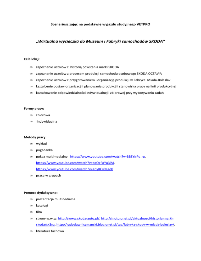 Scenariusz zajęć na podstawie wyjazdu studyjnego VETPRO „Wirtualna wycieczka do Muzeum i Fabryki samochodów SKODA” Cele lekcji: • zapoznanie uczniów z historią powstania marki SKODA • zapoznanie uczniów z procesem produkcji samochodu osobowego SKODA OCTAVIA • zapoznanie uczniów z przygotowaniem i organizacją produkcji w Fabryce Mlada-Boleslav • kształcenie postaw organizacji i planowania produkcji i stanowiska pracy na linii produkcyjnej • kształtowanie odpowiedzialności indywidualnej i zbiorowej przy wykonywaniu zadań Formy pracy: • zbiorowa • indywidualna Metody pracy: • wykład • pogadanka • pokaz multimedialny: https://www.youtube.com/watch?v=BBSYIrPc_-g, https://www.youtube.com/watch?v=qgOgFqYu3lM, https://www.youtube.com/watch?v=XoyRCv9egd0 • praca w grupach Pomoce dydaktyczne: • prezentacja multinedialna • katalogi • film • strony w.w.w: http://www.skoda-auto.pl/, http://moto.onet.pl/aktualnosci/historia-markiskoda/sx2nz, http://radoslaw-liczmanski.blog.onet.pl/tag/fabryka-skody-w-mlada-boleslav/, • literatura fachowa Przebieg lekcji: • powitanie uczniów • prezentacja celów lekcji • podanie tematu lekcji: „Wirtualna wycieczka do Muzeum i Fabryki samochodów SKODA” • wykład wprowadzający w tematykę prezentacji • pokaz multimedialny • omówienie wirtualnej wizyty w muzeum i fabryce • podział uczniów na grupy z przydzieleniem tematu zadania –„ Opisz jeden z etapów produkcji samochodu osobowego marki SKODA.” • prezentacja i ocena pracy uczniów • podanie tematu pracy domowej – „Opisz wrażenia z wizyty z Muzeum” • podsumowanie zajęć