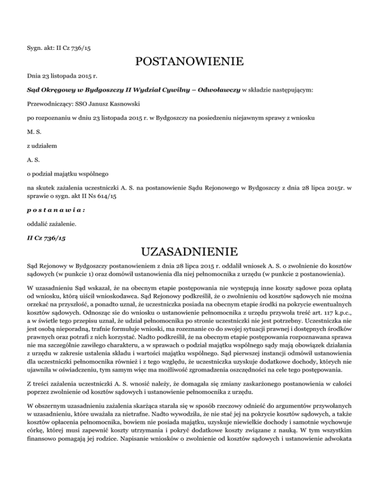 Sygn. akt: II Cz 736/15 POSTANOWIENIE Dnia 23 listopada 2015 r. Sąd Okręgowy w Bydgoszczy II Wydział Cywilny – Odwoławczy w składzie następującym: Przewodniczący: SSO Janusz Kasnowski po rozpoznaniu w dniu 23 listopada 2015 r. w Bydgoszczy na posiedzeniu niejawnym sprawy z wniosku M. S. z udziałem A. S. o podział majątku wspólnego na skutek zażalenia uczestniczki A. S. na postanowienie Sądu Rejonowego w Bydgoszczy z dnia 28 lipca 2015r. w sprawie o sygn. akt II Ns 614/15 postanawia: oddalić zażalenie. II Cz 736/15 UZASADNIENIE Sąd Rejonowy w Bydgoszczy postanowieniem z dnia 28 lipca 2015 r. oddalił wniosek A. S. o zwolnienie do kosztów sądowych (w punkcie 1) oraz domówił ustanowienia dla niej pełnomocnika z urzędu (w punkcie 2 postanowienia). W uzasadnieniu Sąd wskazał, że na obecnym etapie postępowania nie występują inne koszty sądowe poza opłatą od wniosku, którą uiścił wnioskodawca. Sąd Rejonowy podkreślił, że o zwolnieniu od kosztów sądowych nie można orzekać na przyszłość, a ponadto uznał, że uczestniczka posiada na obecnym etapie środki na pokrycie ewentualnych kosztów sądowych. Odnosząc sie do wniosku o ustanowienie pełnomocnika z urzędu przywoła treść art. 117 k.p.c., a w świetle tego przepisu uznał, że udział pełnomocnika po stronie uczestniczki nie jest potrzebny. Uczestniczka nie jest osobą nieporadną, trafnie formułuje wnioski, ma rozeznanie co do swojej sytuacji prawnej i dostępnych środków prawnych oraz potrafi z nich korzystać. Nadto podkreślił, że na obecnym etapie postępowania rozpoznawana sprawa nie ma szczególnie zawiłego charakteru, a w sprawach o podział majątku wspólnego sądy mają obowiązek działania z urzędu w zakresie ustalenia składu i wartości majątku wspólnego. Sąd pierwszej instancji odmówił ustanowienia dla uczestniczki pełnomocnika również i z tego względu, że uczestniczka uzyskuje dodatkowe dochody, których nie ujawniła w oświadczeniu, tym samym więc ma możliwość zgromadzenia oszczędności na cele tego postępowania. Z treści zażalenia uczestniczki A. S. wnosić należy, że domagała się zmiany zaskarżonego postanowienia w całości poprzez zwolnienie od kosztów sądowych i ustanowienie pełnomocnika z urzędu. W obszernym uzasadnieniu zażalenia skarżąca starała się w sposób rzeczowy odnieść do argumentów przywołanych w uzasadnieniu, które uważała za nietrafne. Nadto wywodziła, że nie stać jej na pokrycie kosztów sądowych, a także kosztów opłacenia pełnomocnika, bowiem nie posiada majątku, uzyskuje niewielkie dochody i samotnie wychowuje córkę, której musi zapewnić koszty utrzymania i pokryć dodatkowe koszty związane z nauką. W tym wszystkim finansowo pomagają jej rodzice. Napisanie wniosków o zwolnienie od kosztów sądowych i ustanowienie adwokata zajęło jej wiele czasu i odbyło się kosztem zaniedbania obowiązków domowych, rodzicielskich i rodzinnych. W tych okolicznościach uważa pomoc adwokata za potrzebną (zażalenie uczestniczki – k.121 do 125). Sąd Okręgowy zważył, co następuje Zażalenie nie podlegało uwzględnieniu. znajduje uzasadnienia. Zgodnie z art. 102 ust. 1 ustawy z dnia 28 lipca 2005 r. o kosztach sądowych w sprawach cywilnych zwolnienia od kosztów sądowych może domagać się osoba fizyczna, która złożyła oświadczenie, że nie jest w stanie ich ponieść bez uszczerbku utrzymania koniecznego dla siebie i rodziny. Sytuacja majątkowa i finansowa uczestniczki rzeczywiście nie jest najłatwiejsza, ale na tym – wstępnym – etapie postępowania nie ma ona obowiązku ponoszenia jakichkolwiek kosztów sądowych, przeto zgodzić się należy z Sądem Rejonowym, że takie zwalnianie uczestniczki na przyszłość od ich ponoszenia nie znajduje uzasadnienia (tj. nie jest celowe). W sytuacji, gdyby jednak okazało się, że pojawi się w sprawie konieczność uiszczenia kosztów sądowych przez uczestniczkę, to będzie miała otwartą drogę do ponowienia swojego wniosku i przekonania Sądu, że nie jest w stanie ich ponieść. W części dotyczącej żądania uczestniczki o ustanowienie pełnomocnika z urzędu, Sąd Okręgowy również przychylił się do stanowiska Sądu Rejonowego, że brak uzasadnionych podstaw do ustanowienia dla niej adwokata z urzędu. Sąd w sposób klarowny wyjaśnił, że ustanowienie adwokata lub radcy prawnego do reprezentowania strony uzależnione jest od tego, czy jego udział w sprawie jest potrzebny (jak wymaga art.117&5 k.p.c.). O takiej potrzebie udziału adwokata lub radcy prawnego decyduje charakter sprawy, a więc jej przedmiot, jej skomplikowanie od strony faktycznej i prawnej – z jednej strony, a z drugiej umiejętność samodzielnego działania (radzenia sobie) strony. Ta sprawa, na tym jej etapie, nie jest skomplikowania ani od strony faktycznej, ani prawnej, a pozwana, która w sposób właściwy redaguje pisma, wnioski i przedstawia argumenty na ich uzasadnienie, nie jest osobą nieporadną. Zatem nie mogły odnieść skutku wywody uczestniczki, że potrzebuje więcej czasu na sformułowanie pism kierowanych do sądu i że czyni to kosztem zaniedbania obowiązków rodzicielskich i innych. Wiadomym bowiem jest, że każda sprawa zainicjowana przed sądem, w tym o podział wspólnego majątku, wymaga zaangażowania stron postępowania i poświęcenia przez nich własnego czasu. Skarżąca posiada wystarczającą orientację w regułach rządzących postępowaniem cywilnym, w związku z czym można zasadnie oczekiwać, że pouczenia Sądu udzielane w trybie art. 5 k.p.c. będą wystarczające dla zapewnienia jej odpowiedniej wiedzy o możliwych i celowych czynnościach procesowych. Zwrócić uwagę należy, że we wniosku o ustanowienie pełnomocnika z urzędu z dnia 10 czerwca 2015 r., uczestniczka wskazała jakie okoliczności w niniejszej sprawie pragnie wykazać i z pomocą jakich dowodów (k.34 - 35). Będzie musiała je jedynie dop