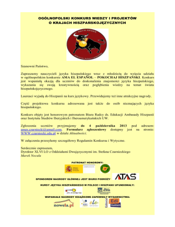 OGÓLNOPOLSKI KONKURS WIEDZY I PROJEKTÓW O KRAJACH HISZPAŃSKOJĘZYCZNYCH Szanowni Państwo, Zapraszamy nauczycieli języka hiszpańskiego wraz z młodzieżą do wzięcia udziału w ogólnopolskim konkursie AMA EL ESPAÑOL – POKOCHAJ HISZPAŃSKI. Konkurs jest wspaniałą okazją dla uczniów do doskonalenia znajomości języka hiszpańskiego, wykazania się swoją kreatywnością oraz pogłębienia wiedzy na temat świata hiszpańskojęzycznego. Laureaci wyjadą do Hiszpanii na kurs językowy. Przewidujemy też inne atrakcyjne nagrody. Część projektowa konkursu adresowana jest także do osób nieznających języka hiszpańskiego. Konkurs objęty jest honorowym patronatem Biura Radcy ds. Edukacji Ambasady Hiszpanii oraz Instytutu Studiów Iberyjskich i Iberoamerykańskich UW. Zgłoszenia uczniów przyjmujemy do 4 października 2013 pod adresem: [email protected]. Formularz zgłoszeniowy dostępny jest na stronie: WWW.czarniecki.edu.pl w dziale Aktualności. W załączeniu przesyłamy szczegółowy Regulamin Konkursu i Wytyczne. Serdecznie zapraszam, Dyrektor XLVI LO z Oddziałami Dwujęzycznymi im. Stefana Czarnieckiego Marek Nocuła PATRONAT HONOROWY: SPONSOREM NAGRODY GŁÓWNEJ JEST BIURO PODRÓŻY KURSY JĘZYKA HISZPAŃSKIEGO W POLSCE I HISZPANII UFUNDOWAŁY: WSPANIAŁE NAGRODY KSIĄŻKOWE ZAPEWNIŁY WYDAWNICTWA: