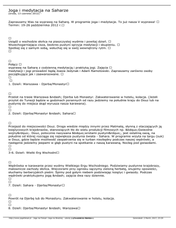 Joga i medytacja na Saharze (środa, 13 czerwiec 2012) - Zapraszamy Was na wyprawę na Saharę. W programie joga i medytacje. To już nasza V wyprawa! Termin: 19-26 października 2012 r. Usiądź o wschodzie słońca na piaszczystej wydmie i powitaj dzień. Wszechogarniająca cisza, bezkres pustyni sprzyja medytacji i skupieniu. Spotkaj się z samym sobą, wsłuchaj się w swój wewnętrzny rytm. Połącz wyprawę na Saharę z codzienną medytacją i praktyką jogi. Zajęcia medytacji i jogi prowadzić będą Joasia Jedynak i Adam Ramotowski. Zapraszamy zarówno osoby początkujące jak i zaawansowane. 1. Dzień: Warszawa - Djerba/Monastyr Przelot na trasie Warszawa – Djerba lub Monastyr. Zakwaterowanie w hotelu, kolacja. (Jeżeli przylot do Tunezji będzie w godzinach porannych od razu jedziemy na południe kraju do Douz lub na pustynię do miejsca skąd wyrusza nasza karawana). 2. Dzień: Djerba/Monastyr – Sahara Przejazd do miejscowości Douz. Droga wiedzie między innymi przez Matmatę, słynną z otaczających ją księżycowych krajobrazów, stanowiących tło do wielu produkcji filmowych np. „Gwiezdne wojny”. Douz, potocznie nazywana „wrotami pustyni”, jest ostatnią oazą, na południe od której rozciąga się największa pustynia świata - Sahara. W programie wizyta na targu (suk) w Douz, gdzie będzie możliwość zaopatrzenia się w turban niezbędny podczas naszej wędrówki, a następnie jedziemy jeepami w głąb pustyni na spotkanie z naszą karawaną. Nocleg pod gwiazdami. 3-6. Dzień: Wielki Erg Wschodni Wędrówka w karawanie przez wydmy Wielkiego Ergu Wschodniego. Podziwiamy pustynne krajobrazy, malownicze zachody słońca. Wieczorami przy ognisku sączymy zieloną herbatę, snujemy opowieści, słuchamy berberyjskich pieśni. Śpimy pod gołym niebem podziwiając księżyc i gwiazdy. Podczas wędrówki praktykujemy jogę – zajęcia dwa razy dziennie. 7. Dzień: Sahara - Djerba/Monastyr Powrót na Djerbę lub do Monastyru. Zakwaterowanie w hotelu, kolacja. 8. Dzień: Djerba/Monastyr – Warszawa http://www.jogafoksal.pl - Joga na Foksal i Joga na Brackiej - szkoły jogiPowered w centrum by Mambo Warszawy Generated: 2 March, 2017, 23:29 Wizyta na lokalnym souku - o ile czas pozwoli; transfer na lotnisko i przelot do Warszawy. Terminy i cena: - 1 tydzień: 19-26 września; cena: 899 EUR - Cena: 899 EUR od osoby Cena obejmuje: - koszty przelotu na trasie Warszawa – Djerba/Monastyr – Warszawa, - transfery do i z hotelu, - przejazdy do miejsca rozpoczęcia i z miejsca zakończenia wędrówki, - noclegi w hotelach klasy turystycznej (pierwszy i ostatni nocleg), - 3 posiłki dziennie, w trakcie wędrówki 3 posiłki biwakowe (śniadanie: kawa, mleko, herbata, chleb, konfitura, ser topiony; posiłek południowy: lekka sałatka na bazie warzyw, ryżu itp., chleb, owoce sezonowe, zielona herbata; posiłek wieczorny: zupa, kuskus, ryż, makaron z warzywami, chleb, owoce sezonowe, zielona herbata), - zajęcia jogi - medytacja, pranajama, dwie sesje jogi dziennie na pustyni, - wyposażenie: materace, koce, namioty beduińskie, wyposażenie kuchenne, talerze, miski, kubki, sztućce, - opieka pilota Aslema Tours w trakcie całej podróży, - ubezpieczenie KL i NW. Cena nie zawiera zwyczajowych napiwków oraz napojów do posiłków pierwszego i ostatniego dnia podróży. http://www.jogafoksal.pl - Joga na Foksal i Joga na Brackiej - szkoły jogiPowered w centrum by Mambo Warszawy Generated: 2 March, 2017, 23:29 http://www.jogafoksal.pl - Joga na Foksal i Joga na Brackiej - szkoły jogiPowered w centrum by Mambo Warszawy Generated: 2 March, 2017, 23:29