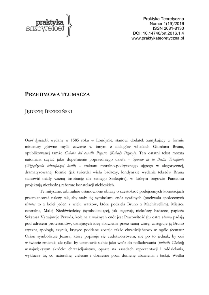 Praktyka Teoretyczna Numer 1(19)/2016 ISSN 2081-8130 DOI: 10.14746/prt.2016.1.4 www.praktykateoretyczna.pl PRZEDMOWA TŁUMACZA JĘDRZEJ BRZEZIŃSKI Osioł kyleński, wydany w 1585 roku w Londynie, stanowi dodatek zamykający w formie miniatury główne myśli zawarte w innym z dialogów włoskich Giordana Bruna, opublikowanej tamże Cabala del cavallo Pegaseo (Kabały Pegaza). Ten ostatni tekst można natomiast czytać jako dopełnienie poprzedniego dzieła – Spaccio de la Bestia Trionfante (Wypędzenia triumfującej bestii) – traktatu moralno-politycznego ujętego w alegorycznej, dramatyzowanej formie (jak twierdzi wielu badaczy, londyńskie wydania tekstów Bruna stanowić miały ważną inspirację dla samego Szekspira), w którym bogowie Panteonu projektują niezbędną reformę konstelacji niebieskich. Te mityczne, arbitralnie ustanowione obrazy o częstokroć podejrzanych konotacjach przemianować należy tak, aby stały się symbolami cnót cywilnych (pochwała społecznych virtutes to z kolei jeden z wielu wątków, które podziela Bruno z Machiavellim). Miejsce centralne, Małej Niedźwiedzicy (symbolizującej, jak sugerują niektórzy badacze, papieża Sykstusa V) zajmuje Prawda, kolejną z ważnych cnót jest Pracowitość (tu ostre słowa padają pod adresem protestantów, uznających ideę zbawienia przez samą wiarę; zastępuje ją Bruno etyczną apologią czynu), krytyce poddane zostaje także chrześcijaństwo w ogóle (centaur Orion symbolizuje Jezusa, który popisuje się cudotwórstwem, nie po to jednak, by coś w świecie zmienić, ale tylko by ustanowić siebie jako wzór do naśladowania [imitatio Christi]; w największym skrócie: chrześcijaństwo, oparte na zasadach reprezentacji i oddzielania, wyklucza to, co naturalne, cielesne i doczesne poza domenę zbawienia i łaski). Wielka Praktyka Teoretyczna 1(19)/2016 Niedźwiedzica tymczasem zastąpiona zostaje przez „oślość” (asinità) i to tej kwestii poświęca Bruno osobny dialog – właśnie Kabałę Pegaza. Na ten wcale nieprosty temat napisano dużo, ujmując jednak rzecz najbardziej skrótowo, powiedzieć można, że wyróżnia Bruno dwie, przeciwstawne sobie ośle natury 1. Pierwsza, negatywna, to powolność, lenistwo, nieróbstwo, tępy upór i wąskie horyzonty; druga, pozytywna, to wytrwałość, pracowitość, determinacja i upór heroiczny. Kabała Pegaza – poza wieloma innymi wątkami, których nie będziemy tu streszczać – dostarcza piętrowej egzegezy tej symbolicznej figury, w której ambiwalencji doszukać się można echa koncepcji współistnienia przeciwieństw (coincidentia oppositorum) Mikołaja z Kuzy, kolejnego heretyka, który stosu uniknął prawdopodobnie tylko dlatego, że sam był biskupem. Zamiast sferycznej stratyfikacji albo epikurejskiego paralelizmu, o którym pisze Althusser (2016), mamy tu wszechświat bez obwodu i środka, ruchem wielkiego kołowrotu (vicissitudo) dopiero wytwarzający swoje formy. Także w koncepcji vicissitudo słychać echa idei Awerroesa, który organizowanie i reorganizowanie się materii kojarzył z „obrotowym ruchem nieba”. Idea ta, choć stłumiona przez „linearną” nowożytność, przetrwa i znajdzie swój nowy wyraz w pismach Nietzschego i Deleuze’a (różnicujące powtórzenie). Księża nie są jednak jedynymi z przeciwników Bruna, choć to ich zemsta skończy się dlań tragicznie – wieloletnim więzieniem i śmiercią w ogniu. Jego druzgocące krytyki dosięgną również choćby filozofów akademickich (zwanych tu pedantami; to ich przykładem są pitagorejczycy), kolonizatorów Ameryki (zob. Bruno 1956) i przede wszystkim arystotelejskich scholastyków. Filozofia Bruna to dojrzała dekonstrukcja usankcjonowanej przez nich pojęciowości (mysteria platonica et peripatetica) przypisującej podrzędną i podległą pozycję materii, przyczyny celowe i formy gatunkowe sytuującej na czele (Bruno: „Do licha z nieruchomymi poruszycielami i z wszystkimi limitami, jakie narzucają niebu!”). Z samego pojęcia materii, już przez Arystotelesa definiowanej jako niestworzona, wyciąga Bruno najdalsze konsekwencje, zdolne na gruncie materializmu wywołać spekulatywną rewolucję, antycypującą w jej najważniejszych zrębach Spinozjańską teorię immanencji. Nieskończona kreatywność materii obejmuje zdolność wytwarzania samych form2, co całkowicie wywraca założenia scholastycznej metafizyki, a wraz z nimi wynikające z niej koncepcje politycznej wspólnoty. W kontekście przedstawianego dialogu antyarystotelejska kampania Bruna obnaża chimeryczną (jeśli nie wręcz ideologiczną) naturę definicji, jakie przypisuje Stagiryta np. życiu ludzkiemu, określając je przez różnicę specyficzną/gatunkową na tle życia animalnego. Nie tylko scholastyka jednak, ale także 1 Wspomnieć można choćby książkę La cabala dell'asino. Asinità e conoscenza in Giordano Bruno (Ordine 1996; Kabała osła. Osłowatość i poznanie u Giordana Bruna). To już idea Awicebrona i Awerroesa, jeśli nie wcześniejszych „arystotelejskich lewicowców”, o których w swej książce pisze Ernst Bloch (1952). 2 64 Jędrzej Brzeziński: Przedmowa tłumacza rodzący się renesansowy humanizm ulega u Bruna swoistemu „zniesieniu” (podobnie dzieje się z kopernikańskim heliocentryzmem), do tego stopnia, że nie byłoby przesadne nazwanie autora naszego tekstu jednym z pierwszych posthumanistów. Tak jak zamknięty, podzielony systemem sfer świata zastępuje wizja nieskończonego wszechświata bez obwodu i bez centrum, tak wszelkie rozważania o „naturze ludzkiej” z góry unieważnia szersza teoria „natury jako boga w rzeczach”, czyli natury jako wyrastającej ze wspólnej przyczyny (materii), nieskończenie aktywnej substancji połączonej przenikającą wszystko i pozbawioną limitów mocą metamorfozy. Z teorią tą łączą się jeszcze dwie, niezbędne dla zrozumienia prezentowanego dialogu teorie. Pierwsza to koncepcj