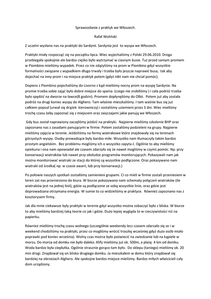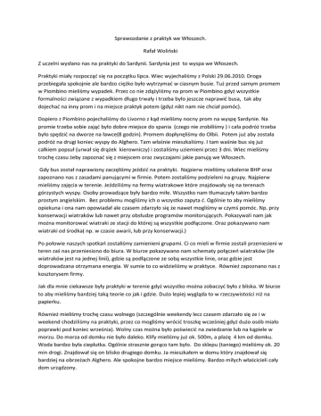 Sprawozdanie z praktyk we Włoszech. Rafał Woliński Z uczelni wysłano nas na praktyki do Sardynii. Sardynia jest to wyspa we Włoszech. Praktyki miały rozpocząć się na początku lipca. Wiec wyjechaliśmy z Polski 29.06.2010. Droga przebiegała spokojnie ale bardzo ciężko było wytrzymać w ciasnym busie. Tuż przed samym promem w Piombino mieliśmy wypadek. Przez co nie zdążyliśmy na prom w Piombino gdyż wszystkie formalności związane z wypadkiem długo trwały i trzeba było jeszcze naprawić busa, tak aby dojechać na inny prom i na miejsce praktyk potem (gdyż nikt nam nie chciał pomóc). Dopiero z Piombino pojechaliśmy do Livorno z kąd mieliśmy nocny prom na wyspę Sardynie. Na promie trzeba sobie zająć było dobre miejsce do spania (czego nie zrobiliśmy ) i cała podróż trzeba było spędzić na dworze na ławce(8 godzin). Promem dopłynęliśmy do Olbii. Potem już aby została podróż na drugi koniec wyspy do Alghero. Tam właśnie mieszkaliśmy. I tam waśnie bus się już całkiem popsuł (urwał się drążek kierowniczy) i zostaliśmy uziemieni przez 3 dni. Wiec mieliśmy trochę czasu żeby zapoznać się z miejscem oraz zwyczajami jakie panują we Włoszech. Gdy bus został naprawiony zaczęliśmy jeździć na praktyki. Najpierw mieliśmy szkolenie BHP oraz zapoznano nas z zasadami panującymi w firmie. Potem zostaliśmy podzieleni na grupy. Najpierw mieliśmy zajęcia w terenie. Jeździliśmy na fermy wiatrakowe które znajdowały się na terenach górzystych wyspy. Osoby prowadzące były bardzo miłe. Wszystko nam tłumaczyły takim bardzo prostym angielskim. Bez problemu mogliśmy ich o wszystko zapyta ć. Ogólnie to aby mieliśmy opiekuna i ona nam opowiadał ale czasem zdarzyło się że nawet mogliśmy w czymś pomóc. Np. przy konserwacji wiatraków lub nawet przy obsłudze programów monitorujących. Pokazywali nam jak można monitorować wiatraki ze stacji do której są wszystkie podłączone. Oraz pokazywano nam wiatraki od środka( np. w czasie awarii, lub przy konserwacji.) Po połowie naszych spotkań zostaliśmy zamienieni grupami. Ci co mieli w firmie zostali przeniesieni w teren zaś nas przeniesiono do biura. W biurze pokazywano nam schematy połączeń wiatraków (ile wiatraków jest na jednej linii), gdzie są podłączone ze sobą wszystkie linie, oraz gdzie jest doprowadzana otrzymana energia. W sumie to co widzieliśmy w praktyce. Również zapoznano nas z kosztorysem firmy. Jak dla mnie ciekawsze były praktyki w terenie gdyż wszystko można zobaczyć było z bliska. W biurze to aby mieliśmy bardziej taką teorie co jak i gdzie. Dużo lepiej wygląda to w rzeczywistości niż na papierku. Również mieliśmy trochę czasu wolnego (szczególnie weekendy lecz czasem zdarzało się ze i w weekend chodziliśmy na praktyki, przez co mogliśmy wrócić troszkę wcześniej gdyż dużo osób miało poprawki pod koniec września). Wolny czas można było poświecić na zwiedzanie lub na kąpiele w morzu. Do morza od domku nie było daleko. Klify mieliśmy już ok. 500m, a plażę 4 km od domku. Woda bardzo była cieplutka. Ogólnie strasznie gorąco tam było. Do sklepu (taniego) mieliśmy ok. 20 min drogi. Znajdował się on blisko drugiego domku. Ja mieszkałem w domu który znajdował się bardziej na obrzeżach Alghero. Ale spokojne bardzo miejsce mieliśmy. Bardzo miłych właścicieli cały dom urządzony. Droga powrotna przebiegła już spokojnie i bez problemu. Wszystko poszło zgodnie z planem. Promem płynęliśmy znowu cała noc (ok. 9 godzin). Do polski wróciliśmy 22.09.2010. Powodem powrotu było to iż dużo osób miało jeszcze zaplanowane poprawki. Ogólnie wyjazd bardzo interesujący i udany. Bardzo podobało mi się gdyż zobaczyłem jak ludzie żyją w innych krajach, podszkoliłem się trochę w angielskim. Ale mówiąc szczerze to mało Włochów mówi po angielsku. Wyjazd nauczył nas jak sobie radzić w razie problemów, w obcym kraju i jak załatwić różnego rodzaju sprawy. Polecam pojechać zobaczyć i przeżyć to co my.