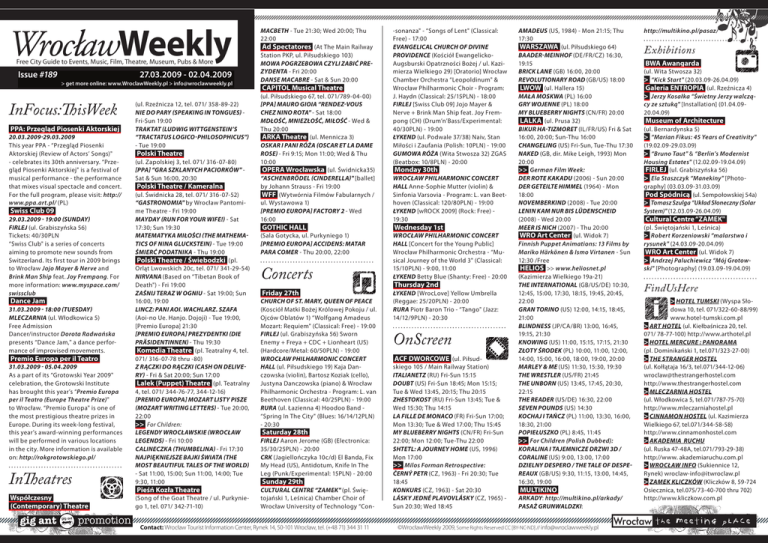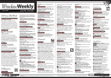 WrocławWeekly Free City Guide to Events, Music, Film, Theatre, Museum, Pubs & More Issue #189 27.03.2009 - 02.04.2009 > get more online: www.WroclawWeekly.pl > [email protected] InFocus:ThisWeek PPA: Przegląd Piosenki Aktorskiej 20.03.2009-29.03.2009 This year PPA - “Przegląd Piosenki Aktorskiej (Review of Actors’ Songs)" - celebrates its 30th anniversary. “Przegląd Piosenki Aktorskiej" is a festival of musical performance - the performance that mixes visual spectacle and concert. For the full program, please visit: http:// www.ppa.art.pl/ (PL) Swiss Club 09 29.03.2009 - 19:00 (Sunday) FIRLEJ (ul. Grabiszyńska 56) Tickets: 40/30PLN “Swiss Club" is a series of concerts aiming to promote new sounds from Switzerland. Its first tour in 2009 brings to Wrocław Jojo Mayer & Nerve and Brink Man Ship feat. Joy Frempong. For more information: www.myspace.com/ swissclub Dance Jam 31.03.2009 - 18:00 (Tuesday) MLECZARNIA (ul. Włodkowica 5) Free Admission Dancer/instructor Dorota Radwańska presents “Dance Jam," a dance performance of improvised movements. Premio Europa per il Teatro 31.03.2009 - 05.04.2009 As a part of its “Grotowski Year 2009" celebration, the Grotowski Institute has brought this year’s “Premio Europa per il Teatro (Europe Theatre Prize)" to Wrocław. “Premio Europa" is one of the most prestigious theatre prizes in Europe. During its week-long festival, this year’s award-winning performances will be performed in various locations in the city. More information is available on: http://rokgrotowskiego.pl/ InTheatres Współczesny (Contemporary) Theatre (ul. Rzeźnicza 12, tel. 071/ 358-89-22) Nie do pary (Speaking in Tongues) Fri-Sun 19:00 Traktat (Ludwig Wittgenstein’s “Tractatus logico-philosophicus") - Tue 19:00 Polski Theatre (ul. Zapolskiej 3, tel. 071/ 316-07-80) [PPA] “Gra szklanych paciorków" Sat & Sun 16:00, 20:30 Polski Theatre / Kameralna (ul. Świdnicka 28, tel. 071/ 316-07-52) “Gastronomia" by Wrocław Pantomime Theatre - Fri 19:00 Mayday (Run for Your Wife!) - Sat 17:30; Sun 19:30 Matematyka Miłości (The Mathematics of Nina Gluckstein) - Tue 19:00 Śmierć podatnika - Thu 19:00 Polski Theatre / Świebodzki (pl. Orląt Lwowskich 20c, tel. 071/ 341-29-54) Nirvana (Based on “Tibetan Book of Death") - Fri 19:00 Zaśnij teraz w ogniu - Sat 19:00; Sun 16:00, 19:00 LINCZ: Pani Aoi. Wachlarz. Szafa (Aoi-no Ue. Hanjo. Dojoji) - Tue 19:00, [Premio Europa] 21:30 [Premio Europa] Prezydentki (Die Präsidentinnen) - Thu 19:30 Komedia Theatre (pl. Teatralny 4, tel. 071/ 316-07-78 thru -80) Z rączki do rączki (Cash On Delivery) - Fri & Sat 20:00; Sun 17:00 Lalek (Puppet) Theatre (pl. Teatralny 4, tel. 071/ 344-76-77, 344-12-16) [Premio Europa] Mozart listy pisze (Mozart Writing Letters) - Tue 20:00, 22:00 >> For Children: Legendy Wrocławskie (Wrocław Legends) - Fri 10:00 Calineczka (Thumbelina) - Fri 17:30 Najpiękniejsze bajki świata (The Most Beautiful Tales Of The World) - Sat 11:00, 15:00; Sun 11:00, 14:00; Tue 9:30, 11:00 Pieśń Kozła Theatre (Song of the Goat Theatre / ul. Purkyniego 1, tel. 071/ 342-71-10) Macbeth - Tue 21:30; Wed 20:00; Thu 22:00 Ad Spectatores (At The Main Railway Station PKP, ul. Piłsudskiego 103) Mowa pogrzebowa czyli zabić Prezydenta - Fri 20:00 Danse Macabre - Sat & Sun 20:00 CAPITOL Musical Theatre (ul. Piłsudskiego 67, tel. 071/789-04-00) [PPA] Mauro Gioia “Rendez-Vous Chez Nino Rota" - Sat 18:00 Mdłość, Mniezłość, Miłość - Wed & Thu 20:00 ARKA Theatre (ul. Mennicza 3) Oskar i Pani Róża (Oscar et la dame rose) - Fri 9:15; Mon 11:00; Wed & Thu 10:00 OPERA Wrocławska (ul. Świdnicka35) “Aschenbrödel (Cinderella)" [ballet] by Johann Strauss - Fri 19:00 WFF (Wytwórnia Filmów Fabularnych / ul. Wystawowa 1) [Premio Europa] Factory 2 - Wed 16:00 GOTHIC HALL (Sala Gotycka, ul. Purkyniego 1) [Premio Europa] ACCIDENS: Matar para comer - Thu 20:00, 22:00 Concerts Friday 27th CHURCH OF ST. MARY, QUEEN OF PEACE (Kosciół Matki Bożej Królowej Pokoju / ul. Ojców Oblatów 1) “Wolfgang Amadeus Mozart: Requiem" (Classical: Free) - 19:00 FIRLEJ (ul. Grabiszyńska 56) Sworn Enemy + Freya + CDC + Lionheart (US) (Hardcore/Metal: 60/50PLN) - 19:00 WROCŁAW PHILHARMONIC CONCERT HALL (ul. Piłsudskiego 19) Kaja Danczowska (violin), Bartosz Koziak (cello), Justyna Danczowska (piano) & Wrocław Philharmonic Orchestra - Program: L. van Beethoven (Classical: 40/25PLN) - 19:00 RURA (ul. Łazienna 4) Hoodoo Band “Spring In The City" (Blues: 16/14/12PLN) - 20:30 Saturday 28th FIRLEJ Aaron Jerome (GB) (Electronica: 35/30/25PLN) - 20:00 CRK (Jagiellończyka 10c/d) El Banda, Fix My Head (US), Antidotum, Knife In The Leg (Punk/Experimental: 15PLN) - 20:00 Sunday 29th CULTURAL CENTRE “ZAMEK" (pl. Świętojański 1, Leśnica) Chamber Choir of Wrocław University of Technology “Con- Contact: Wrocław Tourist Information Center, Rynek 14, 50-101 Wrocław, tel. (+48 71) 344 31 11 -sonanza" - “Songs of Lent" (Classical: Free) - 17:00 EVANGELICAL CHURCH OF DIVINE PROVIDENCE (Kościół EwangelickoAugsburski Opatrzności Bożej / ul. Kazimierza Wielkiego 29) [Oratorio] Wrocław Chamber Orchestra “Leopoldinum" & Wrocław Philharmonic Choir - Program: J. Haydn (Classical: 25/15PLN) - 18:00 FIRLEJ [Swiss Club 09] Jojo Mayer & Nerve + Brink Man Ship feat. Joy Frempong (CH) (Drum’n’Bass/Experimental: 40/30PLN) - 19:00 ŁYKEND (ul. Podwale 37/38) Naiv, Stan Miłości i Zaufania (Polish: 10PLN) - 19:00 GUMOWA RÓŻA (Wita Stwosza 32) ZGAS (Beatbox: 10/8PLN) - 20:00 Monday 30th WROCŁAW PHILHARMONIC CONCERT HALL Anne-Sophie Mutter (violin) & Sinfonia Varsovia - Program: L. van Beethoven (Classical: 120/80PLN) - 19:00 ŁYKEND [wROCK 2009] (Rock: Free) 19:30 Wednesday 1st WROCŁAW PHILHARMONIC CONCERT HALL [Concert for the Young Public] Wrocław Philharmonic Orchestra - “Musical Journey of the World 3" (Classical: 15/10PLN) - 9:00, 11:00 ŁYKEND Betty Blue (Shanty: Free) - 20:00 Thursday 2nd ŁYKEND [WrocLove] Yellow Um