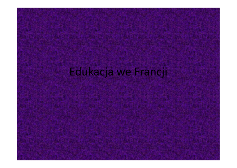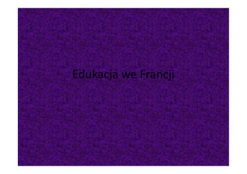 Edukacja we Francji Francja Źródło: http://pl.wikipedia.org/wiki/Francja [10.05.2010] Francja • Republika (obecnie piąta), • Oprócz obszaru kontynentalnego, posiada też terytoria zależne: m.in.: Nowa Kaledonia, Polinezja Francuska, Gwadelupa, Martynika, • Podzielona jest administracyjnie na 22 regiony i 96 departamentów, jednym z regionów jest Korsyka, • Językiem urzędowym jest francuski, ale używanych jest kilka jego odmian np. prowansalski, bretoński, kataloński itp. • Zamieszkiwana jest przez ok. 63 mln ludzi, najliczniejsze mniejszości narodowe to Arabowie (3%), Niemcy (2%), Bretończycy (1%) • Pod względem religijnym ok. 50% to katolicy, ok. 8% muzułmanie. Źródło: http://pl.wikipedia.org/wiki/Francja [10.05.2010] Francja Nicolas Sarkozy (Nicolas Paul Stéphane Sarközy de Nagy-Bocsa) 23 prezydent Republiki Francuskiej, współksiążę Andory Źródło: http://pl.wikipedia.org/wiki/Nicolas_Sarkozy [10.05.2010] Francja Joanna D’Arc (1412-31) Źródło: http://pl.wikipedia.org/wiki/Joanna_d'Arc [10.05.2010] Francja Napoleon I Bonaparte (1769-1821) w latach 1804-1814 oraz 1815 - cesarz Francji Źródło: http://pl.wikipedia.org/wiki/Napoleon_I [10.05.2010] Francja Ludwik Pasteur (1822-1895) Źródło: http://pl.wikipedia.org/wiki/Ludwik_Pasteur [10.05.2010] Francja Gabrielle Bonheur „Coco” Chanel (1883-1971) Źródło: http://en.wikipedia.org/wiki/Coco_Chanel [10.05.2010] Francja Wiktor Hugo (1802-1885) Źródło: http://pl.wikipedia.org/wiki/Victor_Hugo [10.05.2010] Francja Honoré de Balzac (1799-1850) Źródło: http://pl.wikipedia.org/wiki/Honor%C3%A9_de_Balzac [10.05.2010] Francja Maurice Ravel (1875-1937) Źródło: http://pl.wikipedia.org/wiki/Maurice_Ravel [10.05.2010] Francja Gérard Xavier Marcel Depardieu ur. w 1948 Źródło: http://en.wikipedia.org/wiki/Depardieu [10.05.2010] Francja Édith Piaf (1915-1963) (wł. Édith Giovanna Gassion) Źródło: http://en.wikipedia.org/wiki/Piaf [10.05.2010] Francja Brigitte Bardot ur. w 1934 Źródło: http://pl.wikipedia.org/wiki/Brigitte_Bardot [10.05.2010] Francja Hilaire-Germain-Edgar De Gas (1834-1917) Źródło: http://en.wikipedia.org/wiki/Edgar_Degas [10.05.2010] Francja Bob Sinclar (wł. Christophe le Friant) Źródło: http://en.wikipedia.org/wiki/Bob_Sinclar [10.05.2010] Francja Jean-Michele Jarre ur. w 1948 Źródło: http://pl.wikipedia.org/wiki/Jean_Michele_Jarre [10.05.2010] Edukacja we Francji • System edukacji jest scentralizowany, • Nadrzędną rolę spełnia Ministerstwo Edukacji Narodowej, • Kraj jest podzielony na 27 okręgów szkolnych (akademii), • Najniższym szczeblem decyzyjnym jest dyrektor instytucji edukacyjnej. Edukacja we Francji Po 18 r.ż. Szkolnictwo wyższe 2 /3 lata Szkoły średnie II stopnia 1115 r.ż. Szkoły średnie I stopnia 611 r.ż. Szkoły podstawowe 3-6 r.ż. Wychowanie przedszkolne Edukacja we Francji Przedszkola: • Przyjmują dzieci w wieku 3-6 lat, • Wskaźnik upowszechnienia wychowania przedszkolnego jest wysoki (97% wśród pięciolatków), • Edukacja jest bezpłatna i nieobowiązkowa, • Realizują model szkolny. Edukacja we Francji Szkoły podstawowe: • Nauka trwa 5 lat, • Istnieje podział na 3 cykle: 1. Przygotowawczy (CP), 2. Elementarny (CE1 oraz CE2), 3. Średni (CM1 oraz CM2), • 98% dzieci rozpoczyna naukę szkolną w 6 roku życia. Edukacja we Francji Szkoły średnie I stopnia (kolegia): • Nauka trwa 4 lata, • Istnieje podział na 2 cykle: 1. Obserwacji (klasa VI i V), 2. Orientacji (klasa III i II), • Program kształcenia obejmuje 9 przedmiotów obowiązkowych i przedmioty fakultatywne. Edukacja we Francji Szkoły średnie II stopnia: • Nauczanie długie – trwa 3 lata, ma charakter ogólny lub techniczno-zawodowy, kończy się uzyskaniem matury i daje możliwość kontynuacji nauki na studiach; • Nauczanie krótkie – trwa 2 lata, ma charakter zawodowy, kończy się przyznaniem świadectwa zawodowego; istnieje też możliwość uzupełnienia wykształcenia i zdania matury. Edukacja we Francji Szkolnictwo specjalne: • Uczniowie niepełnosprawni kształceni są w modelu integracyjnym, włączani są do szkolnictwa masowego, • W szkołach podstawowych organizowane są klasy integracyjne, w szkołach średnich sekcje programów specjalnych, • Istnieją też szkoły specjalne, za które odpowiada Ministerstwo Edukacji Narodowej. Edukacja we Francji Kształcenie nauczycieli: • Przebiega dwuetapowo: 1. Studia z zakresu przedmiotowego (co najmniej 2 lata), 2. Studia pedagogiczne (2 lub 3 lata), • Istnieje rozbudowany system dokształcania i doskonalenia nauczycieli, • Nauczyciele mają status urzędnika państwowego. Edukacja we Francji Kształcenie dorosłych: • Dominuje kształcenie zawodowe, ale rozwinięte jest też kształcenie ogólne i dla własnych zainteresowań, • Ze szkoleń zawodowych korzysta ¼ pracujących, • Najczęściej edukację dorosłych organizują centra szkoleniowe, Instytuty Wyższego Wykształcenia, związki zawodowe, Krajowe Stowarzyszenie Edukacji Zawodowej Dorosłych.