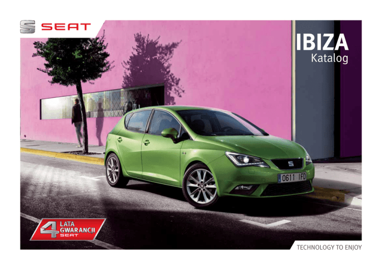 IBIZA Katalog TECHNOLOGY TO ENJOY Młodzieńczy duch był zawsze siłą napędową Ibizy – auta, które aż kipi radością i imponuje osiągami. Projektując nową Ibizę, stanęliśmy przed wielkim i pasjonującym wyzwaniem: jak poprawić to, co jest już doskonałe? IDEALNIE NASTROJONA Śmiało poprowadzone linie nadwozia nowej Ibizy dodają jej dynamiki. Zdecydowanie zarysowane kontury odpowiadają jej sportowemu charakterowi, a zmienione przednie reflektory zyskują intrygujący błysk. Wnętrze sprawia równie obiecujące wrażenie. Obsesyjna wręcz dbałość o detale i ich jakość oraz najnowocześniejsze rozwiązania technologiczne dodatkowo potęgują oszałamiające doznania w czasie jazdy. Nonszalanckie 3-drzwiowe SC, ambitny 5-drzwiowy hatchback i uniwersalne kombi ST napędzane są supernowoczesnymi silnikami, które łączą imponującą dbałość o środowisko z czystą euforią płynącą z prowadzenia auta. Pasja w połączeniu z innowacją sprawią, iż SEAT Ibiza wyda Ci się idealnie dostrojony do Twojego stylu życia. MAGNETYCZNA IBIZA W NOWEJ ODSŁONIE Nadal klasyczna Czyż to nie wspaniale, że wszystko jest tak, jak powinno być? Nowa 5-drzwiowa Ibiza idealnie łączy wszechstronność i atrakcyjną stylistykę. Po jej modernizacji pewne elementy pozostały bez zmian, idealnie zestrajając się z reflektorami biksenonowymi i dodatkowymi światłami LED z przodu1, tylnymi lampami LED2, zmienionymi liniami nadwozia, nowymi zderzakami, nowym kształtem wlotu powietrza oraz gamą nowych kolorów nadwozia i felg z lekkich stopów. Wszystkie te zmiany mogą sugerować, że to całkiem inne auto, jednak w rzeczywistości jest to ta sama Ibiza, choć po liftingu. Mimo licznych innowacyjnych rozwiązań, wyższych parametrów technicznych jest to znana od ponad 25 lat sportowa, praktyczna i uniwersalna Ibiza. 1 W standardzie dla wersji FR i CUPRA. 2 W standardzie dla wersji STYLE, FR I CUPRA. WIĘCEJ UDERZEŃ NA MINUTĘ Oto, co oznacza SC SC oznacza Sport Coupé, czyli porywające osiągi i efektowną stylistykę. Ibiza SC z pewnością zasługuje na swoją nazwę. Szersze krawędzie nadwozia, ostre linie i poszerzone nadkola stanowią idealne tło dla nowych, żywych kolorów i gamy alufelg z lekkich stopów o średnicy 15, 16 lub 17 cali. Kompaktowe, 3-drzwiowe nadwozie doskonale podkreśla dynamiczny styl. Nowy grill o fakturze plastra miodu, obniżony przedni wlot powietrza i bardziej drapieżne w kształcie reflektory nadają Ibizie charakterystyczny wygląd, podkreślający jej osobowość. Nowa wersja oznaczona logo FR jeszcze silniej przemawia do wyobraźni dzięki wyraźnie zaakcentowanym liniom nadwozia i dodatkowym detalom, takim jak duże przednie światła przeciwmgielne z funkcją doświetlania zakrętów. Ibiza SC sprawi, że Twoje serce zabije mocniej i szybciej. WŁAŚNIE TU PASUJESZ Wyjątkowo dobrze Wnętrze Ibizy zawsze było przyjemne, a po zmianie wystroju jest jeszcze przytulniejsze. Wprowadzono innowacyjne zmiany, takie jak nowa obudowa zestawu wskaźników na panelu centralnym, przeprojektowana kierownica, przyciski sterowania, nowe rodzaje tapicerki oraz podświetlany schowek o pojemności 10,7 l. Projektując wnętrze wersji FR, poszliśmy o krok dalej, oferując efektowną skórzaną tapicerkę oraz sportową, obszytą skórą kierownicę i dźwignię skrzyni biegów. Klimatyzacja automatyczna Climatronic pozwala, zależnie od sytuacji, podgrzewać lub schładzać nastroje podróżnych. Opcjonalny zestaw słuchawkowy ze zintegrowanym modułem Bluetooth ® umożliwia połączenie telefonu komórkowego ze standardowym systemem audio z czterema głośnikami. Nowa Ibiza oferuje jeszcze jedno udogodnienie: wejście AUX, które pozwala podłączyć odtwarzacz iPod ® lub MP3, dzięki czemu możesz prowadzić auto przy akompaniamencie swoich ulubionych utworów. JESZCZE WIĘCEJ IBIZY Więcej tego, co kochasz Masz ochotę na spontaniczny wyjazd? Ibiza ST jest zawsze gotowa do drogi. Dysponuje jeszcze większą przestrzenią, abyś mógł zabrać ze sobą wszystko to, co czyni życie ciekawszym. Niezależnie od tego, czy planujesz weekendowy wypad, wielką przygodę czy krótki wyjazd dla przyjemności, ST zawsze pomieści wszystkie potrzebne rzeczy. W przypadku nowej Ibizy ST, większe wciąż jest piękne. Odrobina uwagi należy się także sportowemu wyglądowi i stylowym elementom nowej wersji FR. Nie daj się zwieść wytwornej linii nadwozia – FR nie tylko zaskarbi sobie Twoje względy, ale też pomieści cały dodatkowy bagaż. ODDYCHAJĄC PEŁNĄ PIERSIĄ Dla tych, którzy żyją pełnią życia Być może wiesz, co zrobić, aby wycisnąć z dnia jak najwięcej. Dlatego nie musisz się już martwić o to, jak zmieścić cały bagaż w przestronnej Ibizie. Pojemność bagażnika coupe SC wynosi 284 litry, modelu 5-drzwiowego – 292 litry, a kombi ST – nawet 430 litrów. A wszystko po to, abyś w życiu nie musiał sobie niczego odmawiać. Dzięki inteligentnie rozplanowanym schowkom, w tym bardziej przestrzennemu, podświetlanemu schowkowi w desce rozdzielczej po stronie pasażera, Ibiza jest niczym mobilny, osobisty organizer. Także dla pasażerów przewidziano wystarczającą ilość miejsca – każda podróż będzie wygodna po odchyleniu oparcia fotela do tyłu. IDEALNA DO JAZDY W MIEŚCIE IBIZA CUPRA – szybka, zwinna, zwrotna Całkiem nowa CUPRA zwraca na siebie uwagę, nawet kiedy stoi na parkingu. Wzrok przyciąga unikatowy design sylwetki i wyraziste linie nadwozia, które dodają jej gracji i stylistycznej równowagi. 17-calowe felgi ze stopów lekkich, przednie i tylne reflektory z diodami LED uzupełniają pozostałe zalety. To, co znajduje się pod maską, także wywołuje emocje. Dwie turbosprężarki w połączeniu z szybką zmianą biegów, jaką zapewniają łopatki przy kierownicy, z łatwością pozwalają rozwinąć prędkość do 100 km/h w ciągu 6,9 s. Opcjonalne sportowe zaciski hamulcowe umożliwią zatrzymani