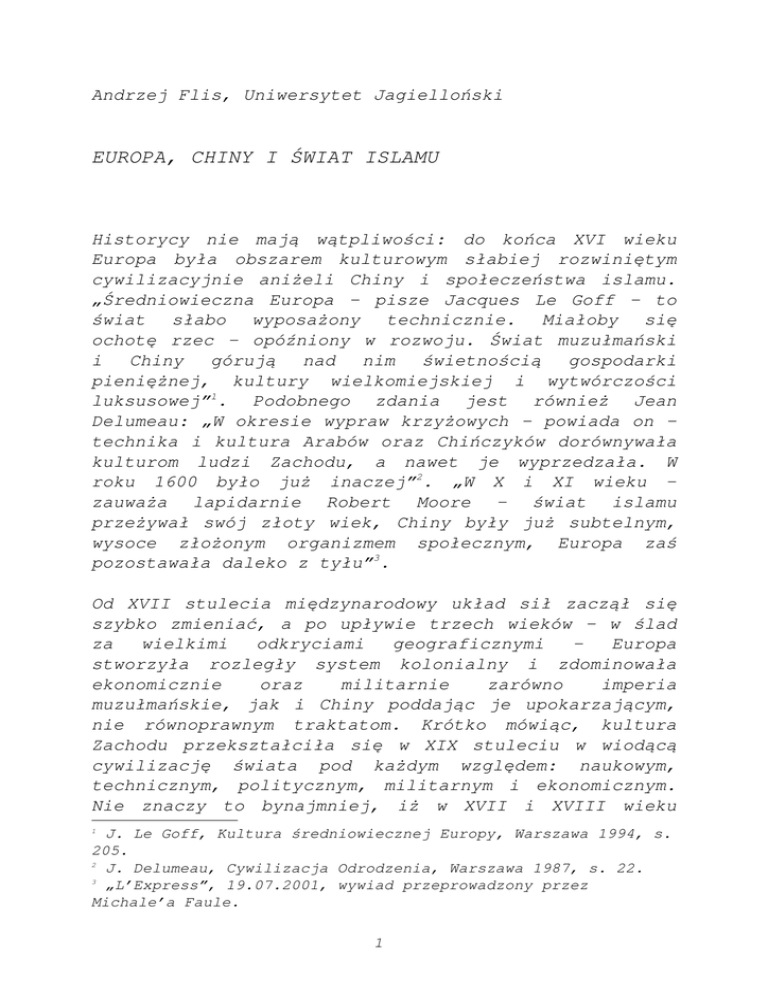 Andrzej Flis, Uniwersytet Jagielloński EUROPA, CHINY I ŚWIAT ISLAMU Historycy nie mają wątpliwości: do końca XVI wieku Europa była obszarem kulturowym słabiej rozwiniętym cywilizacyjnie aniżeli Chiny i społeczeństwa islamu. „Średniowieczna Europa – pisze Jacques Le Goff – to świat słabo wyposażony technicznie. Miałoby się ochotę rzec – opóźniony w rozwoju. Świat muzułmański i Chiny górują nad nim świetnością gospodarki pieniężnej, kultury wielkomiejskiej i wytwórczości luksusowej”1. Podobnego zdania jest również Jean Delumeau: „W okresie wypraw krzyżowych – powiada on – technika i kultura Arabów oraz Chińczyków dorównywała kulturom ludzi Zachodu, a nawet je wyprzedzała. W roku 1600 było już inaczej”2. „W X i XI wieku – zauważa lapidarnie Robert Moore – świat islamu przeżywał swój złoty wiek, Chiny były już subtelnym, wysoce złożonym organizmem społecznym, Europa zaś pozostawała daleko z tyłu”3. Od XVII stulecia międzynarodowy układ sił zaczął się szybko zmieniać, a po upływie trzech wieków – w ślad za wielkimi odkryciami geograficznymi – Europa stworzyła rozległy system kolonialny i zdominowała ekonomicznie oraz militarnie zarówno imperia muzułmańskie, jak i Chiny poddając je upokarzającym, nie równoprawnym traktatom. Krótko mówiąc, kultura Zachodu przekształciła się w XIX stuleciu w wiodącą cywilizację świata pod każdym względem: naukowym, technicznym, politycznym, militarnym i ekonomicznym. Nie znaczy to bynajmniej, iż w XVII i XVIII wieku J. Le Goff, Kultura średniowiecznej Europy, Warszawa 1994, s. 205. 2 J. Delumeau, Cywilizacja Odrodzenia, Warszawa 1987, s. 22. 3 „L’Express”, 19.07.2001, wywiad przeprowadzony przez Michale’a Faule. 1 1 państwo chińskie czy też społeczeństwa muzułmańskie pogrążone były w stagnacji i z tego powodu przegrały „wyścig ku nowoczesności”. Po prostu Europa rozwijała się szybciej i stała się obszarem bezprecedensowej dynamiki społecznej. Dynamikę tę wyzwoliły dwa potężne ruchy kulturowe: Renesans i Reformacja. Renesans doprowadził od rewolucji naukowej i przemysłowej, Reformacja stworzyła z kolei dogodny klimat umysłowy dla rozwoju gospodarki kapitalistycznej i narodzin nowożytnych instytucji demokratycznych. Do końca XVIII wieku kraje europejskie wciągnęły w orbitę swoich wpływów połowę lądów świata i poddały efektywnej kontroli politycznej jedną trzecią wszystkich zamieszkałych ziem. Na półkuli zachodniej, w byłej kolonii brytyjskiej, pojawiły się wówczas nowe ośrodki cywilizacji łacińskiej ukształtowane przez religię protestancką, na południu zaś wyłoniły się społeczeństwa iberoamerykańskie stworzone przez hiszpańskie i portugalskie instytucje katolickie. Na gęściej zaludnionej półkuli wschodniej państwa europejskie nie forsowały osadnictwa kolonialnego, – z wyjątkiem Australii i Nowej Zelandii – ale były na niej obecne poprzez liczne placówki handlowe we wschodniej i południowej Afryce, w Persji oraz Indiach, na Malajach, Indonezji i Filipinach. Kontakty pomiędzy Europą i światem zewnętrznym miały w XVIII wieku charakter jednokierunkowy: Europejczycy aktywnie penetrowali świat cały, podczas gdy świat nie usiłował nawet dotrzeć do Europy. Stany Zjednoczone narodziły się jako produkt uboczny ekspansji europejskiej, dzięki czemu Europa i jej dawna kolonia protestancka objawiły się światu jako wspólny obszar kulturowy nazwany z czasem cywilizacją Zachodu. Był to obszar, który rozwijał się w zawrotnym tempie. W roku 1800 większość – dokładnie 57% – światowej produkcji wytworzonej pochodziło z Azji, a na kraje zachodnie przypadało jedynie 29%. 2 Sto lat później wkład Azji w produkcję światową spadł do 10%, a udział Zachodu wzrósł do 86%! W rezultacie pierwsza połowa XX wieku była okresem absolutnej dominacji Zachodu nie tylko w dziedzinie handlu, lecz także w sferze politycznej i militarnej, a europejski system kolonialny – po rozpadzie imperium osmańskiego4 – sięgnął zenitu. Dominacja Zachodu nad światem była oczywistą konsekwencją jego ustroju ekonomicznego: podczas gdy większość społeczeństw ludzkich pozostawało w XIX wieku w systemie gospodarki rolnej, kraje zachodnie – w następstwie rewolucji przemysłowej – stworzyły potężny aparat wytwórczy oparty na produkcji fabrycznej i złożonych technologiach testowanych w laboratoriach. Aparat ten zapewnił państwom atlantyckim miażdżącą przewagę militarną i absolutny prymat w dziedzinie handlu międzynarodowego. Przewaga militarna i handlowa pozwoliła z kolei Europie i Stanom Zjednoczonym narzucić światu kolonialne stosunki ekonomiczne, które dodatkowo stymulowały rozwój gospodarki zachodniej. W drugiej połowie XX wieku na arenie międzynarodowej pojawiły się dwa podmioty, które rzuciły wyzwanie Zachodowi i które przeciwstawiły mu swoje alternatywne modele życia i systemy wartości: Chiny i świat islamu. Ściślej rzecz biorąc, podmioty te nie tyle się pojawiły, ile wyłoniły na nowo po długim okresie marginalizacji. Tradycje, z których czerpały – i czerpią nadal – swoje inspiracje były bogate i uświęcone patyną wieków, ale przede wszystkim własne i stworzone w okresie przewagi nad cywilizacją europejską. Mogą więc stanowić atrakcyjny układ odniesienia i skuteczną przeciwwagę dla instytucji zachodnich i zachodniego ładu narzuconego światu. Wyzwanie chińskie ma par excellence charakter Jako sprzymierzeniec Niemiec i AustroWęgier podczas I wojny światowej, imperium osmańskie zostało zlikwidowane po klęsce państw centralnych, w 1920 roku na mocy traktatu w Sèvres. 4 3 ekonomiczny i militarny: zachodniej „gospodarce konsumentów” Chiny przeciwstawiły „gospodarkę producentów” i rosnącą potęgę wojskową sięgającą kosmosu. Wyzwanie muzułmańskie posiada natomias