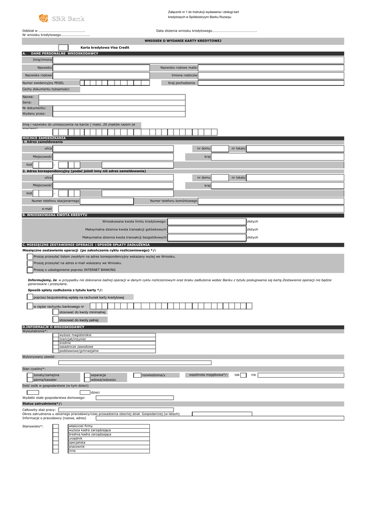 Załącznik nr 1 do Instrukcji wydawania i obsługi kart kredytowych w Spółdzielczym Banku Rozwoju Oddział w ………………………………………………. Nr wniosku kredytowego……………………………. Data złożenia wniosku kredytowego…………………………………………….. WNIOSEK O WYDANIE KARTY KREDYTOWEJ Karta kredytowa Visa Credit A. DANE PERSONALNE WNIOSKODAWCY Imię/imiona Nazwisko Nazwisko rodowe matki Nazwisko rodowe Imiona rodziców Numer ewidencyjny PESEL Kraj pochodzenia Cechy dokumentu tożsamości: Nazwa: Seria: Nr dokumentu: Wydany przez: Imię i nazwisko do umieszczenia na karcie ( maks. 26 znaków razem ze spacjami) MIEJSCE ZAMIESZKANIA 1. Adres zameldowania ulica nr domu Miejscowość kod nr lokalu kraj - 2. Adres korespondencyjny (podać jeżeli inny niż adres zameldowania) ulica nr domu Miejscowość kraj kod nr lokalu - Numer telefonu stacjonarnego Numer telefonu komórkowego e-mail B. WNIOSKOWANA KWOTA KREDYTU Wnioskowana kwota limitu kredytowego: złotych Maksymalna dzienna kwota transakcji gotówkowych złotych Maksymalna dzienna kwota transakcji bezgotókowych złotych C. MIESIĘCZNE ZESTAWIENIE OPERACJI i SPOSÓB SPŁATY ZADŁUŻENIA Miesięczne zestawienie operacji (po zakończenia cyklu rozliczeniowego) */: Proszę przesyłać listem zwykłym na adres korespondencyjny wskazany wyżej we Wniosku. Proszę przesyłać na adres e-mail wskazany we Wniosku. Proszę o udostępnienie poprzez INTERNET BANKING Informujemy, że w przypadku nie dokonania żadnej operacji w danym cyklu rozliczeniowym oraz braku zadłużenia wobec Banku z tytułu posługiwania się kartą Zestawienie operacji nie będzie generowane i przesyłane. Sposób spłaty zadłużenia z tytułu karty */: poprzez bezpośrednią wpłatę na rachunek karty kredytowej w ciężar rachunku bankowego nr stosować do kwoty minimalnej stosować do kwoty pełnej D.INFORMACJE O WNIOSKODAWCY Wykształcenie*: wyższe magisterskie licencjat/inżynier średnie zasadnicze zawodowe podstawowe/gimnazjalne Wykonywany zawód: Stan cywilny*: żonaty/zamężna panna/kawaler separacja wdowa/wdowiec rozwiedziona/y Ilość osób w gospodarstwie (w tym dzieci) dzieci Wydatki stałe gospodarstwa domowego: Status zatrudnienia*/: Całkowity staż pracy: Okres zatrudnenia u obcenego pracodawcy/czas prowadzenia obecnej dział. Gospodarczej (w latach) Informacje o pracodawcy (nazwa, adres) Stanowisko*: właściciel firmy wyższa kadra zarządzająca średnia kadra zarządzająca urzędnik specjalista pracownik inne wspólnota majątkowa*/: tak nie Miesięczny dochód netto: w tym: Źródła dochodów* umowa o pracę:…………………………………………………….. emerytura:…………………………………………………………. renta:………………………………………………………………….. zasiłek przedemerytalny:………………………………………………. wolne zawody:……………………………………………………………….. działalność gospodarcza:…………………………………………………………………. działalność rolnicza:………………………………………………………………………………. umowa cywilno-prawna:………………………………………………………………………………….. umowa najmu:………………………………………………………………………………………………………………… umowa o pracę na czas określony do………………………………………………………………………………… odsetki z aktywów finansowych:…………………………………………………………………………. dywidendy:……………………………………………………………………. inne:………………………………………………………………………………………………………….. Informacje o zobowiązaniach: Zobowiązania kwota zobowiązania rata miesięczna kwota pozostała do spłaty Bank limit w ROR limit w ROR limit karty kredytowej limit karty kredytowej kredyt…………………… kredyt…………………… kredyt…………………… Poręczenie/przystąpienie do długu Poręczenie/przystąpienie do długu Inne(np.. Alimenty, obciążenia komornicze) Inne(np.. Alimenty, obciążenia komornicze) ……………………………………… ……………………………………….. Informacje o posiadanym majątku: Status mieszkaniowy*: właściciel/współwłaściciel domu/mieszkania posiadacz wpółdzielczego prawa do lokalu posiadacz spółdzielczego własnościowego prawa do lokalu/domu jednorodzinnego najemnca: mieszkania komunalnego mieszkania zakładowego od osoby prywatnej (dom, mieszkanie) od osoby prywatnej (pokój) zamieszkiwanie z rodzicami zamieszkiwanie z dziećmi inne……………………………………………………………………………………………………………………………….. Status własności samochodu*: własny leasing na kredyt rodziców nie posiadam inny…………………………………………………………………………………………………………………. Oszczędności (kwota, waluta, okres lokaty)…………………………………………………………………………………………………………………………. Papiery wartościowe (ilość, wartość)……………………………………………………………………………………………………………………………………… Inne……………………………………………………………………………………………………………………………………………………………………………………….. OŚWIADCZENIA 1. Przyjmuję do wiadomości informację Spółdzielczego Banku Rozwoju z siedzibą w Szepi