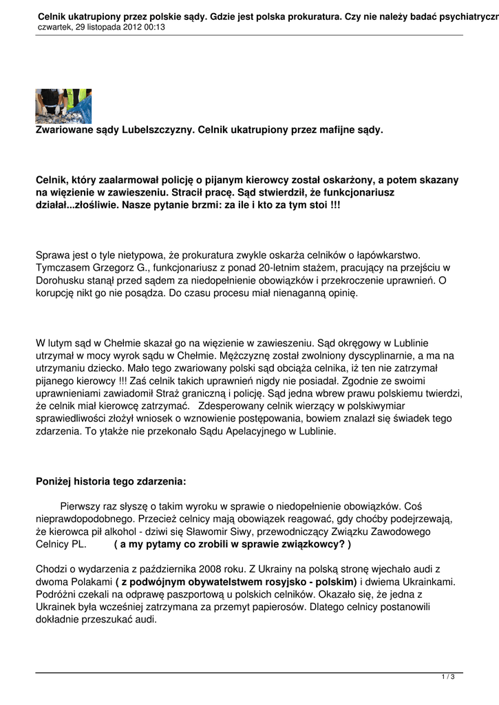 Celnik ukatrupiony przez polskie sądy. Gdzie jest polska prokuratura. Czy nie należy badać psychiatryczn czwartek, 29 listopada 2012 00:13 Zwariowane sądy Lubelszczyzny. Celnik ukatrupiony przez mafijne sądy. Celnik, który zaalarmował policję o pijanym kierowcy został oskarżony, a potem skazany na więzienie w zawieszeniu. Stracił pracę. Sąd stwierdził, że funkcjonariusz działał...złośliwie. Nasze pytanie brzmi: za ile i kto za tym stoi !!! Sprawa jest o tyle nietypowa, że prokuratura zwykle oskarża celników o łapówkarstwo. Tymczasem Grzegorz G., funkcjonariusz z ponad 20-letnim stażem, pracujący na przejściu w Dorohusku stanął przed sądem za niedopełnienie obowiązków i przekroczenie uprawnień. O korupcję nikt go nie posądza. Do czasu procesu miał nienaganną opinię. W lutym sąd w Chełmie skazał go na więzienie w zawieszeniu. Sąd okręgowy w Lublinie utrzymał w mocy wyrok sądu w Chełmie. Mężczyznę został zwolniony dyscyplinarnie, a ma na utrzymaniu dziecko. Mało tego zwariowany polski sąd obciąża celnika, iż ten nie zatrzymał pijanego kierowcy !!! Zaś celnik takich uprawnień nigdy nie posiadał. Zgodnie ze swoimi uprawnieniami zawiadomił Straż graniczną i policję. Sąd jedna wbrew prawu polskiemu twierdzi, że celnik miał kierowcę zatrzymać. Zdesperowany celnik wierzący w polskiwymiar sprawiedliwości złożył wniosek o wznowienie postępowania, bowiem znalazł się świadek tego zdarzenia. To ytakże nie przekonało Sądu Apelacyjnego w Lublinie. Poniżej historia tego zdarzenia: Pierwszy raz słyszę o takim wyroku w sprawie o niedopełnienie obowiązków. Coś nieprawdopodobnego. Przecież celnicy mają obowiązek reagować, gdy choćby podejrzewają, że kierowca pił alkohol - dziwi się Sławomir Siwy, przewodniczący Związku Zawodowego Celnicy PL. ( a my pytamy co zrobili w sprawie związkowcy? ) Chodzi o wydarzenia z października 2008 roku. Z Ukrainy na polską stronę wjechało audi z dwoma Polakami ( z podwójnym obywatelstwem rosyjsko - polskim) i dwiema Ukrainkami. Podróżni czekali na odprawę paszportową u polskich celników. Okazało się, że jedna z Ukrainek była wcześniej zatrzymana za przemyt papierosów. Dlatego celnicy postanowili dokładnie przeszukać audi. 1/3 Celnik ukatrupiony przez polskie sądy. Gdzie jest polska prokuratura. Czy nie należy badać psychiatryczn czwartek, 29 listopada 2012 00:13 Rosyjscy , Polacy stanęli więc w kolejce do tzw. kontroli szczegółowej. Czekało w niej kilkanaście innych aut. Odprawa wlokła się niemiłosiernie. Mężczyźni umilali sobie czas pijąc ukraińską wódkę. Nie reagowali na pouczenia strażnika granicznego, że może to się skończyć mandatem. Jeden z podróżnych - Sergiusz Cz. zaparkował audi przy budynku kontrolerów. W tym czasie przyjechała policja, wezwana z inicjatywy celnika Grzegorza G., którego zauważył butelkę w samochodzie Polaków. Mundurowi kazali Sergiuszowi Cz. dmuchać w alkomat. Wynik: niecały promil. Sąd skazał go za jazdę po pijanemu. Na tym się nie skończyło. Sergiusz Cz. złożył skargę na celnika. W prokuraturze zeznał, że to... Grzegorz G. kazał mu wsiąść do auta i wbrew jego wyraźnym oporom podjechać do kontroli. Tego, że pił wcześniej wódkę nie kwestionował. Po prawie dwóch latach od zdarzenia odbyła się pierwsza rozprawa. Celnik bronił się: - Mężczyźni z audi byli agresywni i domagali się szybkiej odprawy. Poprosiłem o wezwanie policji, bo bałem się, że mogą mnie pobić. Niczego Sergiuszowi Cz. nie kazałem. Przełożony funkcjonariusza tłumaczył: - Zapanowanie nad sytuacją na przejściu jest bardzo trudne. Do kontroli szczegółowej stoi często po 30 samochodów. W tym miejscu jest za mało funkcjonariuszy do obsługi. Adwokat celnika: - W natłoku obowiązków trzeba działać energicznie. Mój klient był od tego, żeby pilnować porządku. Jeśli ktoś zachowuje się agresywnie, to wzywa się policję, takie są obowiązki funkcjonariusza publicznego. 2/3 Celnik ukatrupiony przez polskie sądy. Gdzie jest polska prokuratura. Czy nie należy badać psychiatryczn czwartek, 29 listopada 2012 00:13 Sąd dał jednak wiarę zeznaniom Rosyjskich - Polaków z kolejki. Uznał, że celnik podstępnie kazał kierowcy wsiąść do auta. Wiedział przy tym, że za chwilę wpadnie w ręce policji i bez wątpienia mu zaszkodził. Tym samym złamał prawo. To przecież jakać paranoja. Celnik nie ma uprawnień do badania stanu trzeźwości a trym bardziej zakazu prowadzenia pojazdu. Czym takie zachowanie wytłumaczył sobie sąd? Złośliwością i chęcią odegrania się na Sergiuszu Cz., który w wulgarnych słowach domagał się natychmiastowej odprawy. Co pozostaje nam obserwatorom sprawy? Skierować polskich sędziów na badania psychiatryczen. Nic mniej nie wystarczy. Nigdy nie przypuszczaliśmy, że będziemy stawać w obronie funkcjonariuszy publicznych. Ale skoro są uczciwi , to mjest to obowiązkiem Stowarzyszenia Przeciw Bezprawiu. źródło; http://lublin.gazeta.pl/lublin/1 3/3