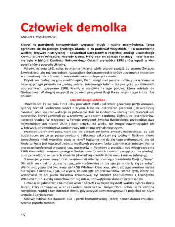 Człowiek demolka ANDRZEJ ŁOMIANOWSKI Kiedyś na partyjnych konwentyklach wygłaszał długie i nudne przemówienia. Teraz ograniczył się do jednego krótkiego zdania, za to poderwał wszystkich. – To naprawienie wielkiej krzywdy historycznej – powiedział Gorbaczow o rosyjskiej aneksji ukraińskiego Krymu. Laureat Pokojowej Nagrody Nobla, który popiera agresję i aneksję – tego jeszcze nie było w historii Komitetu Noblowskiego. Ostatni przywódca ZSRR znów wpadł w kłopoty i znów z powodu Ukrainy. Wtedy, jesienią 1991 roku, to właśnie Ukraina wbiła ostatni gwóźdź do trumny Związku Sowieckiego, ale też pogrzebała rozpaczliwe Gorbaczowowskie próby utrzymania imperium w zmienionej nieco formie. Przetrwalnikowej – do lepszych czasów. Dopóki nie rozległ się głos znad Dniepru, Kreml mógł mieć jeszcze nadzieję na utrzymanie bezwzględnego prymatu na „jednej szóstej światowego lądu” – tak poetycko w radzieckich podręcznikach opisywano ZSRR. Kreml, a właściwie ta jego połowa, która należała do Gorbaczowa. W drugiej rozgościł się bowiem prezydent Rosji Borys Jelcyn i jego ludzie. Ale po kolei. Czas mściwego Sybiraka Wieczorem 21 sierpnia 1991 roku prezydent ZSRR i sekretarz generalny partii komunistycznej Michaił Gorbaczow wrócił z Krymu. Niby nic, sekretarze generalni (jak wcześniej carowie) lubili spędzać wakacje na półwyspie. Tyle że Gorbaczow stał się tam zakładnikiem puczystów, którzy zamknęli go w rządowej willi razem z rodziną. Ogłosili, że jest niezdrów, i przejęli władzę. W rezydencji w Forosie prezydent Związku Radzieckiego przesiedział dwa najważniejsze dni historii ZSRR i Rosji schyłku XX wieku, nie mogąc nawet oglądać ich w telewizji, bo zapobiegliwi zamachowcy odcięli mu sygnał telewizyjny. Błazeński sierpniowy pucz, który stał się początkiem końca Związku Radzieckiego, do dziś budzi spory: po co go przeprowadzono i dlaczego zakończył się totalnym fiaskiem, skoro zamachowcy mieli wszystkie atuty w ręku? Logicznie nie da się tego wytłumaczyć, ale od kiedy to Rosja jest logiczna? Jedną z możliwych przyczyn fiaska dziennikarze zobaczyli już na pierwszej konferencji prasowej tzw. puczystów – fioletowy z przepicia nos wiceprezydenta ZSRR Giennadija Janajewa (zastępca Gorbaczowa formalnie bowiem przejął po nim władzę): pucz prowadzono w oparach alkoholu (dokładniej – wódki Stolicznej i koniaku Jubilejnyj). O innej przyczynie swego czasu wspominali koledzy obecnego prezydenta Rosji z „Firmy”. Dla nich pucz był to „straszny czas, gdy (radzieckie) służby specjalne starły się ze sobą”. Wśród puczystów był ówczesny szef KGB Władimir Kriuczkow, ale część jego armii na rozkaz nie wyszła z okopów, a jak już wyszła, to pobiegła do przeciwników. Wśród tych, którzy nie wykonywali w dni puczu rozkazów Kriuczkowa, był również podpułkownik z Leningradu Władimir Putin. Gdyby zamachowcom się udało, bez wątpienia stanąłby przed sądem. Z chaosu w gabinetach i na moskiewskich ulicach zwycięsko wyszedł zwalisty Sybirak Borys Jelcyn, który zamknął się wraz ze zwolennikami w tzw. Białym Domu (obecnie to siedziba rosyjskiego rządu) i tam doczekał chwili, gdy puczyści sami zrezygnowali i pojechali na Krym wypuścić Gorbaczowa. Mściwy Sybirak nie darował KGB i partii komunistycznej (której nomenklatura entuzjastycznie poparła zamach). 1/7 Dokładnie w chwili, gdy wieczorem 21 sierpnia Gorbaczow dojeżdżał do Białego Domu, rosyjski prezydent triumfalnie podpisywał dekret zakazujący działalności komunistom, niszcząc najważniejszą instytucję polityczną, na której opierał swą władzę prezydent ZSRR. Mimo to w swym pierwszym przemówieniu Gorbaczow powiedział: – Należy zreformować, zmienić partię komunistyczną. - Dziadkowi odbiło, kogo wtedy interesowała partia komunistyczna? – wspominał mi tamte dni jeden ze znajomych moskiewskich dziennikarzy. Po ulicach stolicy szły radosne tłumy, zaczęto zwalać pomniki wodzów – przede wszystkim Dzierżyńskiego, który stał naprzeciwko siedziby KGB na Łubiance. Nowy lokator na Kremlu Radziecki prezydent zaś zachowywał się tak, jakby nie rozumiał, co się wokół niego dzieje. Nigdy w życiu nie widział pewnie takiej erupcji społecznej energii. Jelcyn zapewne też, ale on już w ciągu dwóch dni zdążył awansować z nomenklaturowego rozrabiaki na ludowego przywódcę. Mimo wszystkich późniejszych wpadek, błędów i głupstw Moskwa nigdy mu nie zapomniała, jak stojąc na czołgu, z zaciśniętą pięścią wzywał do oporu. Gorbaczowowi zaś nawet nie przyszło do głowy, by wyjść do obrońców Białego Domu – ludzi, którzy dwa dni koczowali wokół budynku, by nie dopuścić tam czołgów wysłanych przez ministra obrony. Tego Moskwa też nie zapomniała. Gdy tylko wrócił na Kreml, nocą 21 sierpnia zaczął dymisjonować ludzi związanych z puczem. Ale gdy zaczął mianować na ich miejsce nowych, zaczęły się problemy. Do siedziby radzieckich władz wprowadził się bowiem nowy lokator: Borys Jelcyn i jego ludzie. Rosjanie zajęli tzw. czternasty korpus, „radzieckim” zostawiono pierwszy – ten z kopułą, nad którym powiewa flaga (wtedy radziecka, dziś rosyjska). Nagle okazało się, że władza prezydenta ZSRR topnieje jak śnieg w wiosennym słońcu. Na nowego ministra obrony (na miejsce puczysty Jazowa) radziecki prezydent mianował generała Michaiła Mojsiejewa. Ale wraz z zakwaterowaniem na Kremlu Jelcyn zażądał, by rządowe zmiany były z nim konsultowane. Po jednym dniu ministrowania generała wezwano na Kreml. W gabinecie Gorbaczowa siedzieli obaj prezydenci: radziecki i rosyjski. Gdy Mojsiejew wszedł, rozegrała się taka scena: Jelcyn do Gorbaczowa: – Wyjaśnijcie mu, że nie jest już ministrem. Gorbaczow do Mojsiejewa: – Nie jesteście już ministrem. Mojsiejew salutuje i wychodzi. W zakresie swoich „radzieckich” 
