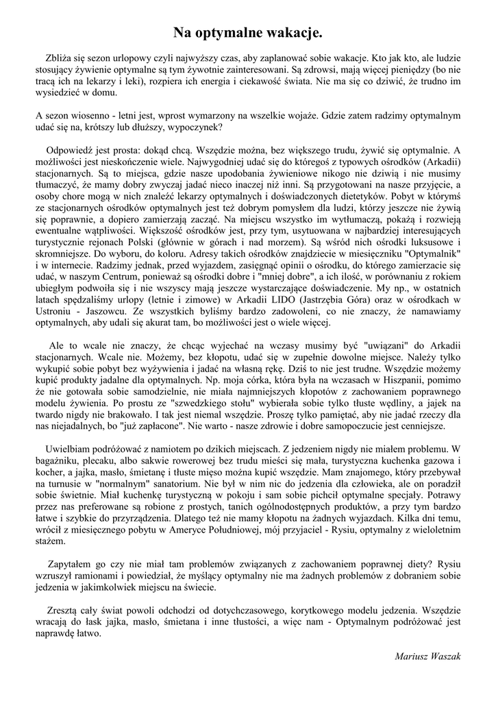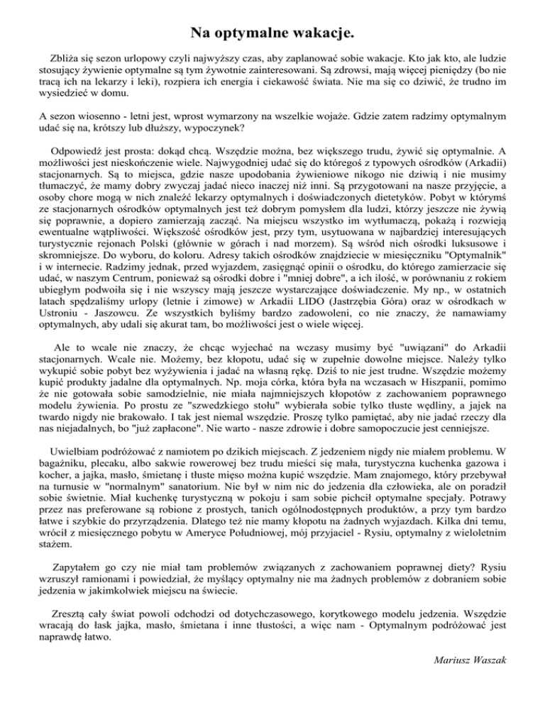 Na optymalne wakacje. Zbliża się sezon urlopowy czyli najwyższy czas, aby zaplanować sobie wakacje. Kto jak kto, ale ludzie stosujący żywienie optymalne są tym żywotnie zainteresowani. Są zdrowsi, mają więcej pieniędzy (bo nie tracą ich na lekarzy i leki), rozpiera ich energia i ciekawość świata. Nie ma się co dziwić, że trudno im wysiedzieć w domu. A sezon wiosenno - letni jest, wprost wymarzony na wszelkie wojaże. Gdzie zatem radzimy optymalnym udać się na, krótszy lub dłuższy, wypoczynek? Odpowiedź jest prosta: dokąd chcą. Wszędzie można, bez większego trudu, żywić się optymalnie. A możliwości jest nieskończenie wiele. Najwygodniej udać się do któregoś z typowych ośrodków (Arkadii) stacjonarnych. Są to miejsca, gdzie nasze upodobania żywieniowe nikogo nie dziwią i nie musimy tłumaczyć, że mamy dobry zwyczaj jadać nieco inaczej niż inni. Są przygotowani na nasze przyjęcie, a osoby chore mogą w nich znaleźć lekarzy optymalnych i doświadczonych dietetyków. Pobyt w którymś ze stacjonarnych ośrodków optymalnych jest też dobrym pomysłem dla ludzi, którzy jeszcze nie żywią się poprawnie, a dopiero zamierzają zacząć. Na miejscu wszystko im wytłumaczą, pokażą i rozwieją ewentualne wątpliwości. Większość ośrodków jest, przy tym, usytuowana w najbardziej interesujących turystycznie rejonach Polski (głównie w górach i nad morzem). Są wśród nich ośrodki luksusowe i skromniejsze. Do wyboru, do koloru. Adresy takich ośrodków znajdziecie w miesięczniku "Optymalnik" i w internecie. Radzimy jednak, przed wyjazdem, zasięgnąć opinii o ośrodku, do którego zamierzacie się udać, w naszym Centrum, ponieważ są ośrodki dobre i "mniej dobre", a ich ilość, w porównaniu z rokiem ubiegłym podwoiła się i nie wszyscy mają jeszcze wystarczające doświadczenie. My np., w ostatnich latach spędzaliśmy urlopy (letnie i zimowe) w Arkadii LIDO (Jastrzębia Góra) oraz w ośrodkach w Ustroniu - Jaszowcu. Ze wszystkich byliśmy bardzo zadowoleni, co nie znaczy, że namawiamy optymalnych, aby udali się akurat tam, bo możliwości jest o wiele więcej. Ale to wcale nie znaczy, że chcąc wyjechać na wczasy musimy być "uwiązani" do Arkadii stacjonarnych. Wcale nie. Możemy, bez kłopotu, udać się w zupełnie dowolne miejsce. Należy tylko wykupić sobie pobyt bez wyżywienia i jadać na własną rękę. Dziś to nie jest trudne. Wszędzie możemy kupić produkty jadalne dla optymalnych. Np. moja córka, która była na wczasach w Hiszpanii, pomimo że nie gotowała sobie samodzielnie, nie miała najmniejszych kłopotów z zachowaniem poprawnego modelu żywienia. Po prostu ze "szwedzkiego stołu" wybierała sobie tylko tłuste wędliny, a jajek na twardo nigdy nie brakowało. I tak jest niemal wszędzie. Proszę tylko pamiętać, aby nie jadać rzeczy dla nas niejadalnych, bo "już zapłacone". Nie warto - nasze zdrowie i dobre samopoczucie jest cenniejsze. Uwielbiam podróżować z namiotem po dzikich miejscach. Z jedzeniem nigdy nie miałem problemu. W bagażniku, plecaku, albo sakwie rowerowej bez trudu mieści się mała, turystyczna kuchenka gazowa i kocher, a jajka, masło, śmietanę i tłuste mięso można kupić wszędzie. Mam znajomego, który przebywał na turnusie w "normalnym" sanatorium. Nie był w nim nic do jedzenia dla człowieka, ale on poradził sobie świetnie. Miał kuchenkę turystyczną w pokoju i sam sobie pichcił optymalne specjały. Potrawy przez nas preferowane są robione z prostych, tanich ogólnodostępnych produktów, a przy tym bardzo łatwe i szybkie do przyrządzenia. Dlatego też nie mamy kłopotu na żadnych wyjazdach. Kilka dni temu, wrócił z miesięcznego pobytu w Ameryce Południowej, mój przyjaciel - Rysiu, optymalny z wieloletnim stażem. Zapytałem go czy nie miał tam problemów związanych z zachowaniem poprawnej diety? Rysiu wzruszył ramionami i powiedział, że myślący optymalny nie ma żadnych problemów z dobraniem sobie jedzenia w jakimkolwiek miejscu na świecie. Zresztą cały świat powoli odchodzi od dotychczasowego, korytkowego modelu jedzenia. Wszędzie wracają do łask jajka, masło, śmietana i inne tłustości, a więc nam - Optymalnym podróżować jest naprawdę łatwo. Mariusz Waszak