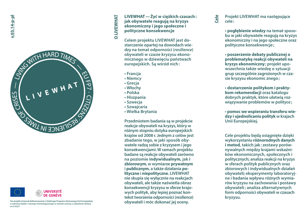 Celem projektu LIVEWHAT jest dostarczenie opartej na dowodach wiedzy na temat odporności (resilience) obywateli w czasie kryzysu ekonomicznego w dziewięciu państwach europejskich. Są wśród nich : • Francja • Niemcy • Grecja • Włochy • Polska • Hiszpania • Szwecja • Szwajcaria • Wielka Brytania Ten projekt otrzymał dofinansowanie z Siódmego Programu Ramowego Unii Europejskiej w zakresie badań i rozwoju technologicznego w ramach umowy o udzielenie dotacji nr 613237. Przedmiotem badania są w projekcie reakcje obywateli na kryzys, który w różnym stopniu dotyka europejskich krajów od 2008 r. Jednym z celów jest zbadanie tego, w jaki sposób obywatele radzą sobie z kryzysem i jego konsekwencjami. W ramach projektu badane są reakcje obywateli zarówno na poziomie indywidualnym, jak i zbiorowym, w wymiarze prywatnym i publicznym, a także działania polityczne i niepolityczne. LIVEWHAT nie skupia się wyłącznie na reakcjach obywateli, ale także naświetla obraz konsekwencji kryzysu w sferze krajowych polityk, aby lepiej poznać kontekst tworzenia odporności (resilience) obywateli i móc dokonać jej oceny. Cele O LIVEWHAT v.03.14-p-pl LIVEWHAT — Żyć w ciężkich czasach : jak obywatele reagują na kryzys ekonomiczny i jego społeczne i polityczne konsekwencje Projekt LIVEWHAT ma następujące cele : • pogłębienie wiedzy na temat sposobu w jaki obywatele reagują na kryzys ekonomiczny i na jego społeczne oraz polityczne konsekwencje ; • poszerzenie debaty publicznej o problematykę reakcji obywateli na kryzys ekonomiczny ; projekt upowszechnia także wiedzę o sytuacji grup szczególnie zagrożonych w czasie kryzysu ekonomic znego ; • dostarczenie politykom i praktykom rekomendacji oraz katalogu dobrych praktyk, które ułatwią rozwiązywanie problemów w polityce ; • pomoc we wspieraniu transferu wiedzy i ujednolicaniu polityk w krajach Unii Europejskiej. Cele projektu będą osiągnięte dzięki wykorzystaniu różnorodnych danych i metod, takich jak : zestawy porównywalnych między krajami wskaźników ekonomicznych, społecznych i politycznych; analiza reakcji na kryzys w sferach polityk publicznych oraz zbiorowych i indywidualnych działań obywateli; eksperymenty laboratoryjne i badania wpływu różnych wymiarów kryzysu na zachowania i postawy obywateli ; analiza alternatywnych form odporności obywateli w czasach kryzysu. W projekcie odporność (resilience) rozumiana jest jako zdolność obywateli Europy do stawiania czoła trudnej sytuacji gospodarczej poprzez kontestację i nabywanie podmiotowości. Wykraczając poza wcześniejsze badania, które skupiały się na wpływie kryzysu ekonomicznego na poszczególne grupy, takie jak np. dzieci, osoby młode czy rodziny, które traktowane były jako kategorie osób pasywnych, LIVEWHAT na pierwszym planie stawia obywateli zaangażowanych w alternatywne formy odporności. „Resilience” obejmuje wzmocnienie społecznych i rodzinnych więzi oraz praktyki społeczne wspierające solidarność w obliczu kryzysu, bardziej zrównoważone formy konsumpcji i produkcji, rozwój nowych sposobów wypowiedzi artystycznych. Chociaż przemiany praktyk obywatelskich (od dostosowawczych do alternatywnych) mają decydujący wpływ na odporność obywateli w czasie kryzysu, nie zostały one jeszcze dokładnie zbadane. W projekcie LIVEWHAT prowadzone są następujące działania badawcze : • Definiowanie, identyfikowanie oraz pomiar kryzysu dzięki operacyjnej definicji i wskaźnikom, które pozwolą badaczom porównać jego wpływ na społeczeństwa europejskie. • Porównanie reakcji na kryzys w sferze krajowych polityk publicznych – realizacji tego celu służyć będą wywiady z twórcami krajowych polityk, analiza dokumentów oraz stworzenie katalogu dobrych praktyk. • Badanie zbiorowych reakcji na kryzys w sferze publicznej poprzez analizę formułowanych roszczeń politycznych. • Diagnoza sposobów postrzegania kryzysu i indywidualnych reakcji obywateli na kryzys - przeprowadzenie ogólnokrajowych badań sondażowych w każdym z państw uczestniczących w projekcie. • Ustalenie związków przyczynowoskutkowych pomiędzy kryzysem, postawami i zachowaniami obywateli poprzez prowadzenie badań ankietowych i eksperymentów laboratoryjnych. • Rozpoznanie alternatywnych form reagowania obywateli na kryzys i wskazanie związków pomiędzy sytuacją grup szczególnie narażonych na negatywny wpływ tego zjawiska, a alternatywnymi sposobami reakcji. Zadanie realizowane będzie za pomocą ankiet internetowych oraz wywiadów z ekspertami krajowymi. Uczestnicy Działania badawcze Podejście teoretyczne Podejście teoretyczne LIVEWHAT pozwala na badanie odporności (resilience) na różnych płaszczyznach analitycznych – od poziomu obywateli, którzy próbują „podnieść się” i ograniczyć koszty kryzysu do różnych form reakcji zbiorowych, które pojawiają się w życiu publicznym i kwestionują nierówności społeczne. Koordynator Université de Genève Marco Giugni Partnerzy współpracujący European University Institute Lorenzo Bosi Uppsala universitet Katrin Uba University of Sheffield Maria Grasso Fondation Nationale des Sciences Politiques Manlio Cinalli Universität Siegen Christian Lahusen Universitat Autònoma de Barcelona Eva Anduiza Panepistimio Kritis Maria Kousis Uniwersytet Warszawski Maria Theiss Podmiot finansujący Komisja Europejska FP7-SSH.2013.5.1-1 Odporność obywateli w czasie kryzysu http://cordis.europa.eu/fp7/ Kontakt [email protected] Strona internetowa projektu www.livewhat.unige.ch