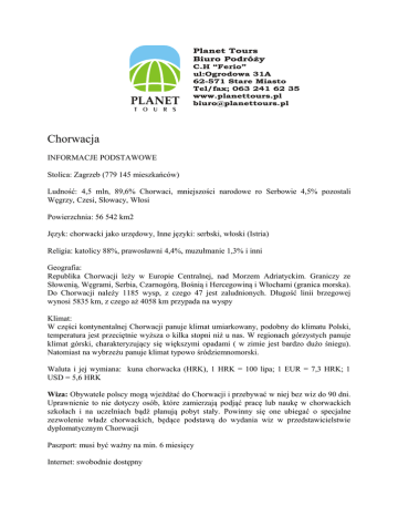 Chorwacja INFORMACJE PODSTAWOWE Stolica: Zagrzeb (779 145 mieszkańców) Ludność: 4,5 mln, 89,6% Chorwaci, mniejszości narodowe ro Serbowie 4,5% pozostali Węgrzy, Czesi, Słowacy, Włosi Powierzchnia: 56 542 km2 Język: chorwacki jako urzędowy, Inne języki: serbski, włoski (Istria) Religia: katolicy 88%, prawosławni 4,4%, muzułmanie 1,3% i inni Geografia: Republika Chorwacji leży w Europie Centralnej, nad Morzem Adriatyckim. Graniczy ze Słowenią, Węgrami, Serbia, Czarnogórą, Bośnią i Hercegowiną i Włochami (granica morska). Do Chorwacji należy 1185 wysp, z czego 47 jest zaludnionych. Długość linii brzegowej wynosi 5835 km, z czego aż 4058 km przypada na wyspy Klimat: W części kontynentalnej Chorwacji panuje klimat umiarkowany, podobny do klimatu Polski, temperatura jest przeciętnie wyższa o kilka stopni niż u nas. W regionach górzystych panuje klimat górski, charakteryzujący się większymi opadami ( w zimie jest bardzo dużo śniegu). Natomiast na wybrzeżu panuje klimat typowo śródziemnomorski. Waluta i jej wymiana: kuna chorwacka (HRK), 1 HRK = 100 lipa; 1 EUR = 7,3 HRK; 1 USD = 5,6 HRK Wiza: Obywatele polscy mogą wjeżdżać do Chorwacji i przebywać w niej bez wiz do 90 dni. Uprawnienie to nie dotyczy osób, które zamierzają podjąć pracę lub naukę w chorwackich szkołach i na uczelniach bądź planują pobyt stały. Powinny się one ubiegać o specjalne zezwolenie władz chorwackich, będące podstawą do wydania wiz w przedstawicielstwie dyplomatycznym Chorwacji Paszport: musi być ważny na min. 6 miesięcy Internet: swobodnie dostępny Czas: taki sam jak w Polsce Elektryczność: 220 V Telefony komórkowe: działają bez zastrzeżeń Bankomaty: są powszechnie dostępne Szczepienia: Bezpłatna opieka medyczna przysługuje polskim turystom w ograniczonym zakresie – tylko w nagłej sytuacji, jako pierwsza niezbędna pomoc ambulatoryjna (wypadek, zasłabnięcie). Dotyczy to wyłącznie opieki lekarskiej – bez kosztów leków, recept, pobytu w ośrodku medycznym itp. Aby skorzystać z bezpłatnej pomocy, należy okazać polski paszport oraz potwierdzić ubezpieczenie. Placówki dyplomatyczne: Ambasada RP w Zagrzebiu ul. Krležin Gvozd 3 10000 Zagreb Tel.: (00-385 1) 48 99444 Tel. dyżurny: (00-385) 98 359 796 Faks: (00-385 1) 48 34 577 E-mail: [email protected] Strona internetowa: www.zagrzeb.polemb.net Wydział Konsularny w Zagrzebiu ul. Krležin Gvozd 3, 10000 Zagreb Telefon: (00-3851) 48 99 414 Faks: (00-3851) 48 99 420 E-mail: [email protected] Wydział Ekonomiczny ul. Jabukovac 17, 10000 Zagreb Telefon: (00-385-1) 48 34 193 Faks: (00-385-1) 48 34 294 E-mail: [email protected] Wydział Promocji Handlu i Inwestycji ul. Rockefellerova 49, 10000 Zagreb Telefon: (00-385-1) 46 84 202 Faks: (00-385-1) 46 83 128 E-mail: [email protected] www.wehzagreb.com.hr Miejscowości turystyczne Wyspa Korcula Trzeciej co do wielkości wyspa chorwackiej Dalmacji. Na wyspie znajdziecie Państwo barwną i wielowiekową historię i zabytki architektury, a przede wszystkim wspaniałą przyrodę, czyste morze, kilometry plaż, urokliwe zatoczki i zieleń lasów piniowych. Korcula to doskonałe miejsce zarówno do plażowania i kąpieli morskich, jak i zwiedzania - można stąd odwiedzić wspaniały Dubrownik, zielona wyspę Mljet, czy tez słynne miejsce pielgrzymek Medjugorje. Jest to doskonałe miejsce dla amatorów nurkowania, znajdują się tu bowiem doskonałe tereny do podwodnych wypraw. Oprócz atmosfery sprzyjającej wypoczynkowi, znajdziecie tu Państwo liczne bary, tawerny i restauracje serwujące przepyszne dania kuchni dalmatyńskiej i doskonałe miejscowe wino. Neum Kurortu szczycącego się największą ilością dni słonecznych w roku. Miasto Neum leży na wąskim 20 km pasie wybrzeża należącego do Hercegowiny i przedzielającym na połowę wybrzeże chorwackie, w części wschodniej ciągnące się w stronę Dubrovniku, w zachodniej w stronę Splitu. Dalmacja to barwna i wielowiekowa historia, a także, a może nawet przede wszystkim, wspaniała przyroda: przeźroczyste i czyste morze, setki kilometrów uroczych plaż, urokliwe zatoczki, malownicze wyspy, soczystą zieleń lasów piniowych i wspaniałe góry. Neum to doskonałe miejsce zarówno do plażowania i kąpieli morskich, jak i zwiedzania - niedaleko stąd do Dubrownika, Splitu czy Medjugorje. W samym Neum znajdziecie tu Państwo wiele tanich sklepów, przemiłych tawern i barów, w których serwuje się doskonałą bałkańską kuchnię i domową palinkę, wypożyczalnie sprzętu wodnego, korty tenisowe i wiele innych atrakcji. Wspaniali są też mieszkańcy Hercegowiny - głównie Chorwaci - gościnni, uprzejmi, otwarci, zawsze skorzy do pomocy. Orebić Słynie z niezapomnianych widoków, tutaj, w pobliżu Gospa u Angela znajduje się jeden z najładniejszych punktów widokowych na świecie. Sibenik Jest jednym z najpopularniejszych i największych miejsc wypoczynkowych. Oprócz zabytków znajdziemy tu duże kompleksy hotelowe z doskonałym zapleczem rozrywkowym, które przyciągają turystów z wielu krajów i w różnym wieku. W pobliskiej miejscowości Zablaće błota mineralne o leczniczych właściwościach. Poza tym różnorodność restauracji, dyskotek, plaże z bogatą infrastrukturą, sporty wodne, doskonała organizacja wypoczynku nie pozwolą się tutaj nudzić nikomu Oprócz tego region oferuje turystom wspaniałą malowniczość adriatyckich ogrodów, plantacji oliwek i winogron, lazurowych plaż oraz błękitnego nieba. Umiarkowany klimat w sposób wyjątkowy sprzyja wypoczynkowi. Wycieczki fakultatywne DUBROWNIK Wycieczka do jednego z najpiękniejszych miast na świecie. W programie m.in. spacer urokliwymi uliczkami miasta, wpisanego na listę UNESCO, podczas którego poznamy jego historię, a także zobaczymy klasztor franciszkanów ze słynną apteką, Pałac Sponza, Dwór Książęcy, Katedrę i wiele innych cennych zabytków. MIASTO KORCULA Wycieczka do legenda
