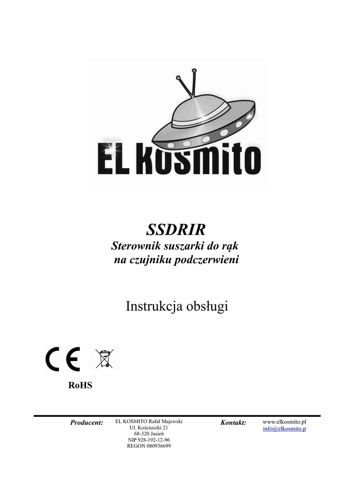 SSDRIR Sterownik suszarki do rąk na czujniku podczerwieni Instrukcja obsługi RoHS Producent: EL KOSMITO Rafał Majewski Ul. Kościuszki 21 68-320 Jasień NIP 928-192-12-96 REGON 080936699 Kontakt: www.elkosmito.pl [email protected] Opis ogólny. Firma EL KOSMITO opracowała elektronikę sterującą wentylatorem i grzałką w suszarkach do rąk. Dostępne na rynku tanie suszarki często mają tak słabo wykonaną elektronikę, że lepiej tego nie komentować. Sprawny potrafi być silnik dmuchawy i grzałka a elektronika nie. Zachowuje się ona niestabilnie i jak pokazały nasze doświadczenia bywa źle policzona, elementy podczerwieni pracują jakby były na zupełnie inne zakresy długości fali itd. Elementy lutowane są w taki sposób, że potrafią kompletnie nie trzymać się płytki drukowanej. Ogólnie nie ma za bardzo co komentować. Co w sytuacji awarii elektroniki można zrobić? • można kupić nową suszarkę, tyle tylko, że z doświadczenia wiemy, że niektóre półroczne suszarki już miały niedziałającą elektronikę, więc same są nowe. Trzeba byłoby kupić jakąś suszarkę z wyższej półki a i to nie ma gwarancji, że wszystko będzie bardzo długo w porządku • można spróbować naprawić elektronikę, ale nasze doświadczenie pokazuje, że nawet naprawiona elektronika po prostu działa beznadziejnie (jak zresztą działała od nowości) • można oddać na gwarancję jeśli jeszcze jest, ale wtedy ponosimy tylko dodatkowe koszty, a przecież i tak dostaniemy ten sam typ, który nie wiadomo czy podziała dłużej • można wymienić elektronikę na nasz sprawdzony moduł Przyszło nam naprawić kilka suszarek do rąk i nawet po naprawie elektroniki dalej było widać, że nie wszystko z włączaniem jest dobre. W ten sposób narodził się pomysł naszego urządzenia. Spisuje się ono świetnie w tych suszarkach co uruchamialiśmy. Urządzenie jest proste w podłączeniu. Mamy dostępne wejście zasilania 230V i wyjście przekaźnika NO max 10A z bezpiecznikiem. Jeśli naprawiana suszarka ma dmuchawę z grzałką nie przekraczającą parametrów przekaźnika oraz nie jest wymagana dodatkowa kontrola temperatury i mamy odpowiednią ilość miejsca, to możemy wstawić moduł SSDRIR i z powrotem ożywić całe urządzenie. Moduł posiada wyjście na dwie diody sygnalizacyjne zieloną i czerwoną. Zielona świeci się kiedy urządzenie wpięte jest do sieci, a czerwona w czasie pracy dmuchawy. Dodatkowo wbudowana jest funkcja inteligentnej pracy suszarki, która powoduje, że jeśli przez 30 sekund cały czas suszarka jest włączona to następuje przerwa i trzeba ręce zabrać i ponownie podłożyć, aby uruchomić. Pozwoli to wyeliminować problem występujący w oryginalnych sterownikach, gdyż zdarzyło się, że suszarka włączyła się i chodziła przez 4 godziny bez przerwy zanim ktoś zauważył. Cechy modułu SSDRIR ✔ ✔ ✔ ✔ ✔ ✔ ✔ ✔ Separacja czujnika podczerwieni od sieci 230V Proste podłączenie Mikroprocesor odpowiedzialny za sterowanie przekaźnikiem Zabezpieczenie przed ciągłą pracą Wbudowany bezpiecznik 10A Wymiary 80x65x28 (razem z uszami do przykręcenia 60x50x21) Wykonanie IP20 Zakres temperatur pracy modułu 0 do 50°C Parametry techniczne ✔ Zasilanie: 230V, około 1W ✔ Przekaźnik wyjściowy 10A, styk NO, max 275V AC ✔ Wbudowany bezpiecznik na płytce 10A Strona 2 z 4 Podłączenie modułu Rys. 1 Opis elementów sterownika 1 – przewód z diodami 3mm czerwoną i zieloną wzkazujące pracę sterownika 2 – gniazdo 3-pinowe do przewodu diod sygnalizacyjnych 3 – gniazdo 4-pinowe do przewodu diod czujnika podczerwieni 4 – przewód z diodami 5mm nadawczą i odbiorczą podczerwieni 5 – wyjście przekaźnika 6 – bezpiecznik 10A wbudowany na płytce Rys. 2: Podłączenie 7 – wejście zasilania 230V 8 – dioda czerwona – sygn. włączenia suszarki 9 – dioda zielona – sygn. doprowadzonego zasilania Na rys. 1 pokazano wyprowadzenia sterownika. Podłączenie natomiast demonstruje rys. 2. Diody sygnalizacyjne podłączyć należy do gniazda 3-pinowego, diody detektora podczerwieni do gniazda 4-pinowego. Diody sygnalizacyjne nie są obowiązkowe, można z nich zrezygnować lub podłączyć inne jeśli np. zamontowane są już oryginalnie w suszarce i wolimy z nich skorzystać. Diody podczerwieni najlepiej zastosować te, które są dostarczone z naszym modułem, bo do nich został przystosowany. Obie należy zamontować w najlepszy dla nas sposób. Tutaj trzeba przeprowadzić próby. Odpowiednia regulacja pozwala na wykrywanie dłoni z nawet 10cm. Przy ustawianiu należy pamiętać, że diody zbyt blisko siebie będą tworzyć ciągłe połączenie nawet bez odbijania promieni przez dłonie. W takim przypadku należy zastosować dodatkowe oddzielenie przesłoną obu diod. Im dalej będą od siebie tym mniejsza będzie czułość. Można też zamontować obie pod lekkim kątem itp. Tutaj najlepiej doświadczalnie sprawdzić. Nie wykluczone, że suszarka, którą naprawiamy będzie miała specjalne miejsce na diody, które będziemy mogli wykorzystać. Strona 3 z 4 Uwagi Uwaga! Urządzenie elektroniczne! Nieprawidłowe użytkowanie urządzenia może grozić uszkodzeniem odbiornika lub innymi poważniejszymi konsekwencjami w tym porażeniem prądem! Zachowaj szczególną ostrożność! Uwaga! Pamiętaj, że suszarka to urządzenie z grzałką i dmuchawą. W razie awarii dmuchawy grzałka będzie miała znacznie większą niż dopuszczalna temperaturę! W większości przypadków zakończy się to jej spaleniem, ale w takiej sytuacji może też dojść do uszkodzenia/stopienia obudowy i innych groźnych sytuacji! Uwaga ta nie dotyczy kontrolera, ale pamiętaj o tym podczas używania suszarki. W razie wykrycia problemów z grzałką i dmuchawą zaprzestań używania suszarki! Uwaga! Jeśli wykryjesz, że przekaźnik skleja się podczas załączania suszarki nie korzystaj z modułu bezpośrednio! Zastosuj osob
