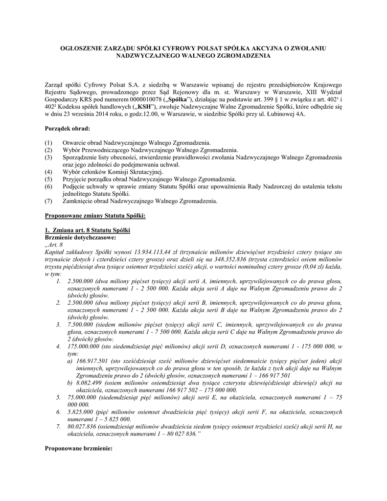 OGŁOSZENIE ZARZĄDU SPÓŁKI CYFROWY POLSAT SPÓŁKA AKCYJNA O ZWOŁANIU NADZWYCZAJNEGO WALNEGO ZGROMADZENIA Zarząd spółki Cyfrowy Polsat S.A. z siedzibą w Warszawie wpisanej do rejestru przedsiębiorców Krajowego Rejestru Sądowego, prowadzonego przez Sąd Rejonowy dla m. st. Warszawy w Warszawie, XIII Wydział Gospodarczy KRS pod numerem 0000010078 („Spółka”), działając na podstawie art. 399 § 1 w związku z art. 402¹ i 402² Kodeksu spółek handlowych („KSH”), zwołuje Nadzwyczajne Walne Zgromadzenie Spółki, które odbędzie się w dniu 23 września 2014 roku, o godz.12.00, w Warszawie, w siedzibie Spółki przy ul. Łubinowej 4A. Porządek obrad: (1) (2) (3) (4) (5) (6) (7) Otwarcie obrad Nadzwyczajnego Walnego Zgromadzenia. Wybór Przewodniczącego Nadzwyczajnego Walnego Zgromadzenia. Sporządzenie listy obecności, stwierdzenie prawidłowości zwołania Nadzwyczajnego Walnego Zgromadzenia oraz jego zdolności do podejmowania uchwał. Wybór członków Komisji Skrutacyjnej. Przyjęcie porządku obrad Nadzwyczajnego Walnego Zgromadzenia. Podjęcie uchwały w sprawie zmiany Statutu Spółki oraz upoważnienia Rady Nadzorczej do ustalenia tekstu jednolitego Statutu Spółki. Zamknięcie obrad Nadzwyczajnego Walnego Zgromadzenia. Proponowane zmiany Statutu Spółki: 1. Zmiana art. 8 Statutu Spółki Brzmienie dotychczasowe: „Art. 8 Kapitał zakładowy Spółki wynosi 13.934.113,44 zł (trzynaście milionów dziewięćset trzydzieści cztery tysiące sto trzynaście złotych i czterdzieści cztery grosze) oraz dzieli się na 348.352.836 (trzysta czterdzieści osiem milionów trzysta pięćdziesiąt dwa tysiące osiemset trzydzieści sześć) akcji, o wartości nominalnej cztery grosze (0,04 zł) każda, w tym: 1. 2.500.000 (dwa miliony pięćset tysięcy) akcji serii A, imiennych, uprzywilejowanych co do prawa głosu, oznaczonych numerami 1 - 2 500 000. Każda akcja serii A daje na Walnym Zgromadzeniu prawo do 2 (dwóch) głosów. 2. 2.500.000 (dwa miliony pięćset tysięcy) akcji serii B, imiennych, uprzywilejowanych co do prawa głosu, oznaczonych numerami 1 - 2 500 000. Każda akcja serii B daje na Walnym Zgromadzeniu prawo do 2 (dwóch) głosów. 3. 7.500.000 (siedem milionów pięćset tysięcy) akcji serii C, imiennych, uprzywilejowanych co do prawa głosu, oznaczonych numerami 1 - 7 500 000. Każda akcja serii C daje na Walnym Zgromadzeniu prawo do 2 (dwóch) głosów. 4. 175.000.000 (sto siedemdziesiąt pięć milionów) akcji serii D, oznaczonych numerami 1 - 175 000 000, w tym: a) 166.917.501 (sto sześćdziesiąt sześć milionów dziewięćset siedemnaście tysięcy pięćset jeden) akcji imiennych, uprzywilejowanych co do prawa głosu w ten sposób, że każda z tych akcji daje na Walnym Zgromadzeniu prawo do 2 (dwóch) głosów, oznaczonych numerami 1 – 166 917 501 b) 8.082.499 (osiem milionów osiemdziesiąt dwa tysiące czterysta dziewięćdziesiąt dziewięć) akcji na okaziciela, oznaczonych numerami 166 917 502 – 175 000 000. 5. 75.000.000 (siedemdziesiąt pięć milionów) akcji serii E, na okaziciela, oznaczonych numerami 1 – 75 000 000. 6. 5.825.000 (pięć milionów osiemset dwadzieścia pięć tysięcy) akcji serii F, na okaziciela, oznaczonych numerami 1 – 5 825 000. 7. 80.027.836 (osiemdziesiąt milionów dwadzieścia siedem tysięcy osiemset trzydzieści sześć) akcji serii H, na okaziciela, oznaczonych numerami 1 – 80 027 836.” Proponowane brzmienie: „Art. 8 Kapitał zakładowy Spółki wynosi 25.581.840,64 zł (dwadzieścia pięć milionów pięćset osiemdziesiąt jeden tysięcy osiemset czterdzieści złotych i sześćdziesiąt cztery grosze) oraz dzieli się na 639.546.016 (sześćset trzydzieści dziewięć milionów pięćset czterdzieści sześć tysięcy szesnaście) akcji o wartości nominalnej 4 (cztery) grosze (0,04 zł) każda, w tym: 1. 2.500.000 (dwa miliony pięćset tysięcy) akcji serii A, imiennych, uprzywilejowanych co do prawa głosu, oznaczonych numerami 1 – 2 500 000. Każda akcja serii A daje na Walnym Zgromadzeniu prawo do 2 (dwóch) głosów. 2. 2.500.000 (dwa miliony pięćset tysięcy) akcji serii B, imiennych, uprzywilejowanych co do prawa głosu, oznaczonych numerami 1 – 2 500 000. Każda akcja serii B daje na Walnym Zgromadzeniu prawo do 2 (dwóch) głosów. 3. 7.500.000 (siedem milionów pięćset tysięcy) akcji serii C, imiennych, uprzywilejowanych co do prawa głosu, oznaczonych numerami 1 – 7 500 000. Każda akcja serii C daje na Walnym Zgromadzeniu prawo do 2 (dwóch) głosów. 4. 175.000.000 (sto siedemdziesiąt pięć milionów) akcji serii D, oznaczonych numerami 1 – 175 000 000, w tym: a) 166.917.501 (sto sześćdziesiąt sześć milionów dziewięćset siedemnaście tysięcy pięćset jeden) akcji imiennych, uprzywilejowanych co do prawa głosu w ten sposób, że każda z tych akcji daje na Walnym Zgromadzeniu prawo do 2 (dwóch) głosów, oznaczonych numerami 1 – 166 917 501 b) 8.082.499 (osiem milionów osiemdziesiąt dwa tysiące czterysta dziewięćdziesiąt dziewięć) akcji na okaziciela, oznaczonych numerami 166 917 502 – 175 000 000. 5. 75.000.000 (siedemdziesiąt pięć milionów) akcji serii E, na okaziciela, oznaczonych numerami 1 – 75 000 000. 6. 5.825.000 (pięć milionów osiemset dwadzieścia pięć tysięcy) akcji serii F, na okaziciela, oznaczonych numerami 1 – 5 825 000. 7. 80.027.836 (osiemdziesiąt milionów dwadzieścia siedem tysięcy osiemset trzydzieści sześć) akcji serii H, na okaziciela, oznaczonych numerami 1 – 80 027 836. 8. 47.260.690 (czterdzieści siedem milionów dwieście sześćdziesiąt tysięcy sześćset dziewięćdziesiąt) akcji zwykłych serii I, na okaziciela, oznaczonych numerami 1 – 47 260 690. 9. 243.932.490 (dwieście czterdzieści trzy miliony dziewięćset trzydzieści dwa tysiące czterysta dziewięćdziesiąt) akcji zwykłych serii J, na okaziciela, oznaczonych numerami 1 – 243 932 490.” 2. Zmiana art. 15