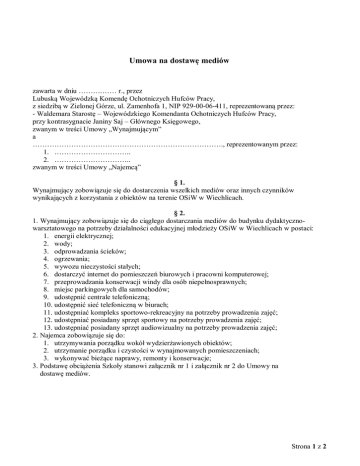 Umowa na dostawę mediów zawarta w dniu ……….…… r., przez Lubuską Wojewódzką Komendę Ochotniczych Hufców Pracy, z siedzibą w Zielonej Górze, ul. Zamenhofa 1, NIP 929-00-06-411, reprezentowaną przez: - Waldemara Starostę – Wojewódzkiego Komendanta Ochotniczych Hufców Pracy, przy kontrasygnacie Janiny Saj – Głównego Księgowego, zwanym w treści Umowy „Wynajmującym” a ……………………………………………………………………., reprezentowanym przez: 1. ………………………….. 2. ………………………….. zwanym w treści Umowy „Najemcą” § 1. Wynajmujący zobowiązuje się do dostarczenia wszelkich mediów oraz innych czynników wynikających z korzystania z obiektów na terenie OSiW w Wiechlicach. § 2. 1. Wynajmujący zobowiązuje się do ciągłego dostarczania mediów do budynku dydaktycznowarsztatowego na potrzeby działalności edukacyjnej młodzieży OSiW w Wiechlicach w postaci: 1. energii elektrycznej; 2. wody; 3. odprowadzania ścieków; 4. ogrzewania; 5. wywozu nieczystości stałych; 6. dostarczyć internet do pomieszczeń biurowych i pracowni komputerowej; 7. przeprowadzania konserwacji windy dla osób niepełnosprawnych; 8. miejsc parkingowych dla samochodów; 9. udostępnić centrale telefoniczną; 10. udostępnić sieć telefoniczną w biurach; 11. udostępniać kompleks sportowo-rekreacyjny na potrzeby prowadzenia zajęć; 12. udostępniać posiadany sprzęt sportowy na potrzeby prowadzenia zajęć; 13. udostępniać posiadany sprzęt audiowizualny na potrzeby prowadzenia zajęć; 2. Najemca zobowiązuje się do: 1. utrzymywania porządku wokół wydzierżawionych obiektów; 2. utrzymanie porządku i czystości w wynajmowanych pomieszczeniach; 3. wykonywać bieżące naprawy, remonty i konserwacje; 3. Podstawę obciążenia Szkoły stanowi załącznik nr 1 i załącznik nr 2 do Umowy na dostawę mediów. Strona 1 z 2 § 3. W przypadku rozwiązania i wygaśnięcia Umowy przekazanie przejętego mienia nastąpi na podstawie protokołu zdawczo-odbiorczego stanowiącego podstawę ostatecznego rozliczenia. § 4. Umowa zostaje zawarta na czas określony od dnia 01.09.2015 r. do 31.08.2016 r. § 5. Umowa może zostać rozwiązana za 3 miesięcznym okresem wypowiedzenia. § 6. W przypadku wygaśnięcia lub rozwiązania Umowy Najmu z dnia ………. 2015 r. automatycznie rozwiązana jest Umowa na dostawę mediów. § 7. Zmiany i uzupełnienia Umowy wymagają dla swej ważności formy pisemnej w postaci aneksu. § 8. W sprawach nienormowanych niniejszą Umową maja zastosowanie odpowiednie przepisy Kodeksu Cywilnego. § 9. Umowa została sporządzona w dwóch jednobrzmiących egzemplarzach po jednym dla każdej ze stron. ………………….. Wynajmujący ……………………….. Najemca Strona 2 z 2