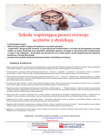 Szkoła wspierająca proces rozwoju uczniów z dysleksją Celem konkursu jest: - aktywizacja uczniów mających trudności w czytaniu i pisaniu; - wspieranie i integrowanie uczniów ze specyficznymi trudnościami w uczeniu się lub popularyzowanie wiedzy na temat dysleksji oraz sposobów udzielania pomocy uczniom ze specyficznymi trudnościami w nauce i ich rodzicom - stwarzanie możliwości do wyrażania myśli i uczuć inspirowanych tematyką konkursu w formie literackiej; - promowanie modelu szkoły przyjaznej uczniom z dysleksją rozwojową. Zadania konkursu: 1. Organizacja przez uczniów z pomocą nauczyciela happeningu w ramach obchodów Szkolnego Tygodnia Świadomości Dysleksji. Ocena na podstawie sprawozdania, filmików, zdjęć, prac plastycznych/pisemnych przesłanych do jury konkursu poprzez stronę internetową. 2. Przeprowadzenie szkolnego konkursu/olimpiady/rozgrywek pt. ,,Potyczki z ortografią” ze znajomości zasad pisowni. Ocena na podstawie sprawozdania, wyników konkursu, zdjęć, prac plastycznych/pisemnych przesłanych do jury konkursu poprzez stronę internetową. 3. Wykonanie przez uczestników pomocy ułatwiające opanowanie zasad pisowni z: „ó, rz, ż, h i ch oraz u” . Mogą to być np.: plakaty, gry planszowe, zakładki, karty, słowniczki obrazkowo–wyrazowe, fiszki ortograficzne itp. Ocena na podstawie sprawozdania, , zdjęć, prac plastycznych/pisemnych przesłanych do jury konkursu poprzez stronę internetową. 4. Przygotowanie przez uczniów w formie indywidualnej lub grupowej pracy plastycznej dotyczącej zasad polskiej ortografii. Ocena na podstawie sprawozdania, zdjęć, prac plastycznych przesłanych do jury konkursu poprzez stronę internetową. 5. Organizacja podczas zajęć korekcyjno-kompensacyjnych konkursu ,,Mam przepis na…” . Współzawodnictwo w zakresie czytania ze zrozumieniem instrukcji, przepisów, regulaminów i innych tekstów użytkowych. Ocena na podstawie sprawozdania, filmików, zdjęć, prac plastycznych/pisemnych przesłanych do jury konkursu poprzez stronę internetową. 6. Opracowanie przez uczniów samodzielnie lub z pomocą rodziców Indywidualnych Słowników Ortograficznych zgodnie z zasadą kolorowej ortografii. Ocena na podstawie sprawozdania, zdjęć, prac plastycznych/pisemnych przesłanych do jury konkursu poprzez stronę internetową. 7. Organizacja dla uczniów maratonu gimnastyki mózgu – kinezjologii edukacyjnej. Ocena na podstawie sprawozdania, filmików, zdjęć, prac plastycznych/pisemnych przesłanych do jury konkursu poprzez stronę internetową. 8. Organizacja dla dyslektyków zajęć głośnego czytania pod hasłem „Czytamy ortograficzne śmieszne wierszyki”. Ocena na podstawie sprawozdania, filmików, zdjęć, prac plastycznych/pisemnych przesłanych do jury konkursu poprzez stronę internetową. 9. Zgłaszanie swoich przedstawicieli do udziału w kursie „Praktyczne metody pracy z uczniem z dysleksją”, który przeprowadzi w formie e-learning Studium Prawa Europejskiego w Warszawie. Regulamin i szczegóły konkursu dostępne są na stronie internetowej: www.dysleksjawszkole.pl Oganizatorzy: IB INSTYTUT BADAŃ n D NAD DEMOKRACJĄ Studium Prawa Europejskiego: 02-326 Warszawa, Al. Jerozolimskie 151, lok. 2222 tel./fax: 22 833 38 90; 22 833 39 90; e-mail: [email protected]; www.spe.edu.pl Sp. z o.o.
