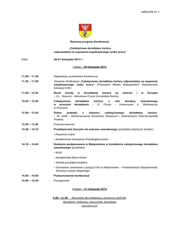 załącznik nr 1 Ramowy program Konferencji „Całożyciowe doradztwo kariery - odpowiedzią odpowiedzi na wyzwania współczesnego rynku pracy” Data: 20-21 21 listopada 2013 r. I dzień – 20 listopada 2013 11.00 – 11.30 Rejestracja uczestników Konferencji 11.30 – 11.50 Otwarcie Konferencji „Całożyciowe yciowe doradztwo kariery odpowiedzią odpowiedzi na wyzwania współczesnego rynku pracy” (Prezydent Miasta Białegostoku/ Departament Edukacji U.M.) 11.50 – 12.20 Nowe trendy w doradztwie kariery na – Cz. Noworol - Narodowe Forum Doradztwa Kariery 12.20 – 12.50 Całożyciowe życiowe w procesie w Poznaniu doradztwo doradzania – kariery a D. Pisula świecie i w Europie rola doradcy zawodowego - Uniwersytet A. Mickiewicza 12.50 – 13.20 Dobre praktyki z obszaru całożyciowego yciowego doradztwa kariery. kariery – W.. Kreft - Stowarzyszenie Doradców Szkolnych i Zawodowych Rzeczpospolitej Polskiej 13.20 – 13.40 Przerwa kawowa 13.40 – 14.10 Proaktywno kluczem do sukcesu zawodowego (przykłady lokalnych działań) Proaktywność działa • Wsparcie unijne • Akademickie Inkubatory Przedsiębiorczości Przedsi 14.10 – 14.40 Działania podejmowane w Białymstoku w kontekście kontek całożyciowego życiowego doradztwa zawodowego (przykłady) • WUP • Akademickie Biuro Karier • Szkoła ponadgimnazjalna • Doradztwo zawodowe z pozycji CKU w Białymstoku – Przedstawiciel Departamentu Edukacji Urzędu Urz Miejskiego 14.40 – 15.00 Podsumowanie konferencji 15.00 – 15.30 Poczęstunek ęstunek II dzień – 21 listopada 2013 9.00 - 11.30 Warsztaty dla młodzieży, słuchaczy szkół dla dorosłych, rodziców, nauczycieli, doradców zawodowych załącznik nr 1 PROGRAM WARSZTATÓW ∗ Warsztaty dla młodzieży szkół ponadgimnazjalnych i słuchaczy szkół dla dorosłych „Własna firma – daj sobie szansę, innym się udało” – Halina Luba ∗ Warsztaty dla rodziców „Odkryj talenty swojego dziecka i pomóż mu zaplanować przyszłość” – Katarzyna Kaczyńska ∗ Warsztaty dla doradców zawodowych/nauczycieli „Planowanie kariery ucznia – planery do planowania kariery” – Dorota Pisula ∗ Warsztaty dla młodzieży szkół ponadgimnazjalnych „Proaktywność – szansą na sukces zawodowy” – Dorota Zabielska ∗ Warsztaty dla młodzieży szkół gimnazjalnych „Poznaję własne predyspozycje zawodowe” – Aneta Malinowska -Sztrubel Warsztaty odbędą się w Zespole Szkół Mechanicznych CKP Nr 2 im. Św. Józefa w Białymstoku, ul. Broniewskiego 14. Po zakończeniu warsztatów zwiedzanie specjalistycznych pracowni ZSM CKP Nr 2. Uprzejmie prosimy o potwierdzenie udziału w warsztatach do 15 listopada 2013 r. Realizator konferencji Centrum Kształcenia Ustawicznego Lokalne Centrum Doradztwa Zawodowego tel. 85 743 67 85 lub e-mail: [email protected] Konferencja realizowana w ramach V edycji Ogólnopolskiego Tygodnia Kariery Patronaty honorowe: Patronaty medialne: