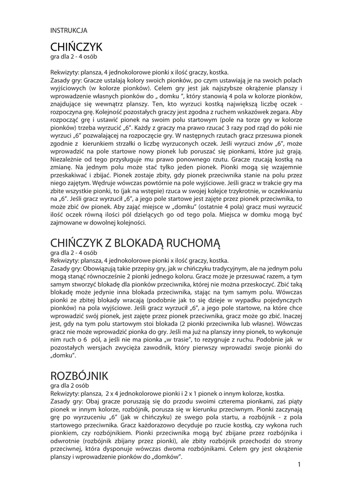 INSTRUKCJA CHIŃCZYK gra dla 2 - 4 osób Rekwizyty: plansza, 4 jednokolorowe pionki x ilość graczy, kostka. Zasady gry: Gracze ustalają kolory swoich pionków, po czym ustawiają je na swoich polach wyjściowych (w kolorze pionków). Celem gry jest jak najszybsze okrążenie planszy i wprowadzenie własnych pionków do „ domku ”, który stanowią 4 pola w kolorze pionków, znajdujące się wewnątrz planszy. Ten, kto wyrzuci kostką największą liczbę oczek rozpoczyna grę. Kolejność pozostałych graczy jest zgodna z ruchem wskazówek zegara. Aby rozpocząć grę i ustawić pionek na swoim polu startowym (pole na torze gry w kolorze pionków) trzeba wyrzucić „6”. Każdy z graczy ma prawo rzucać 3 razy pod rząd do póki nie wyrzuci „6” pozwalającej na rozpoczęcie gry. W następnych rzutach gracz przesuwa pionek zgodnie z kierunkiem strzałki o liczbę wyrzuconych oczek. Jeśli wyrzuci znów „6”, może wprowadzić na pole startowe nowy pionek lub poruszać się pionkami, które już grają. Niezależnie od tego przysługuje mu prawo ponownego rzutu. Gracze rzucają kostką na zmianę. Na jednym polu może stać tylko jeden pionek. Pionki mogą się wzajemnie przeskakiwać i zbijać. Pionek zostaje zbity, gdy pionek przeciwnika stanie na polu przez niego zajętym. Wędruje wówczas powtórnie na pole wyjściowe. Jeśli gracz w trakcie gry ma zbite wszystkie pionki, to (jak na wstępie) rzuca w swojej kolejce trzykrotnie, w oczekiwaniu na „6”. Jeśli gracz wyrzucił „6”, a jego pole startowe jest zajęte przez pionek przeciwnika, to może zbić ów pionek. Aby zająć miejsce w „domku” (ostatnie 4 pola) gracz musi wyrzucić ilość oczek równą ilości pól dzielących go od tego pola. Miejsca w domku mogą być zajmowane w dowolnej kolejności. CHIŃCZYK Z BLOKADĄ RUCHOMĄ gra dla 2 - 4 osób Rekwizyty: plansza, 4 jednokolorowe pionki x ilość graczy, kostka. Zasady gry: Obowiązują takie przepisy gry, jak w chińczyku tradycyjnym, ale na jednym polu mogą stanąć równocześnie 2 pionki jednego koloru. Gracz może je przesuwać razem, a tym samym stworzyć blokadę dla pionków przeciwnika, której nie można przeskoczyć. Zbić taką blokadę może jedynie inna blokada przeciwnika, stając na tym samym polu. Wówczas pionki ze zbitej blokady wracają (podobnie jak to się dzieje w wypadku pojedynczych pionków) na pola wyjściowe. Jeśli gracz wyrzucił „6”, a jego pole startowe, na które chce wprowadzić swój pionek, jest zajęte przez pionek przeciwnika, gracz może go zbić. Inaczej jest, gdy na tym polu startowym stoi blokada (2 pionki przeciwnika lub własne). Wówczas gracz nie może wprowadzić pionka do gry. Jeśli ma już na planszy inny pionek, to wykonuje nim ruch o 6 pól, a jeśli nie ma pionka „w trasie”, to rezygnuje z ruchu. Podobnie jak w pozostałych wersjach zwycięża zawodnik, który pierwszy wprowadzi swoje pionki do „domku”. ROZBÓJNIK gra dla 2 osób Rekwizyty: plansza, 2 x 4 jednokolorowe pionki i 2 x 1 pionek o innym kolorze, kostka. Zasady gry: Obaj gracze poruszają się do przodu swoimi czterema pionkami, zaś piąty pionek w innym kolorze, rozbójnik, porusza się w kierunku przeciwnym. Pionki zaczynają grę po wyrzuceniu „6” (jak w chińczyku) ze swego pola startu, a rozbójnik - z pola startowego przeciwnika. Gracz każdorazowo decyduje po rzucie kostką, czy wykona ruch pionkiem, czy rozbójnikiem. Pionki przeciwnika mogą być zbijane przez rozbójnika i odwrotnie (rozbójnik zbijany przez pionki), ale zbity rozbójnik przechodzi do strony przeciwnej, która dysponuje wówczas dwoma rozbójnikami. Celem gry jest okrążenie planszy i wprowadzenie pionków do „domków”. 1