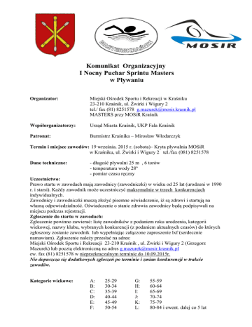 Komunikat Organizacyjny I Nocny Puchar Sprintu Masters w Pływaniu Organizator: Miejski Ośrodek Sportu i Rekreacji w Kraśniku 23-210 Kraśnik, ul. Żwirki i Wigury 2 tel./ fax (81) 8251578 [email protected] MASTERS przy MOSiR Kraśnik Współorganizatorzy: Urząd Miasta Kraśnik, UKP Fala Kraśnik Patronat: Burmistrz Kraśnika – Mirosław Włodarczyk Termin i miejsce zawodów: 19 września. 2015 r. (sobota)– Kryta pływalnia MOSiR w Kraśniku, ul. Żwirki i Wigury 2 tel./fax (081) 8251578 Dane techniczne: - długość pływalni 25 m , 6 torów - temperatura wody 28º - pomiar czasu ręczny Uczestnictwo: Prawo startu w zawodach mają zawodnicy (zawodniczki) w wieku od 25 lat (urodzeni w 1990 r. i starsi). Każdy zawodnik może uczestniczyć maksymalnie w trzech konkurencjach indywidualnych. Zawodnicy i zawodniczki muszą złożyć pisemne oświadczenie, iż są zdrowi i startują na własną odpowiedzialność. Oświadczenie o stanie zdrowia zawodnicy będą podpisywali na miejscu podczas rejestracji. Zgłoszenie do startu w zawodach: Zgłoszenie powinno zawierać: listę zawodników z podaniem roku urodzenia, kategorii wiekowej, nazwy klubu, wybranych konkurencji (z podaniem aktualnych czasów) do których zgłoszony zostanie zawodnik lub wypełniając załączone zaproszenie lxf (serdecznie namawiam). Zgłoszenie należy przesłać na adres: Miejski Ośrodek Sportu i Rekreacji 23-210 Kraśnik , ul. Żwirki i Wigury 2 (Grzegorz Mazurek) lub pocztą elektroniczną na adres [email protected] ew. fax (81) 8251578 w nieprzekraczalnym terminie do 10.09.2015r. Nie dopuszcza się dodatkowych zgłoszeń po terminie i zmian konkurencji w trakcie zawodów. Kategorie wiekowe: A: B: C: D: E: F: 25-29 30-34 35-39 40-44 45-49 50-54 G: H: I: J: K: L: 55-59 60-64 65-69 70-74 75-79 80-84 i ewent. dalej co 5 lat Przepisy techniczne: Zawody będą przeprowadzone seriami na czas. Serie zostaną ustalone w/g zgłoszonych czasów. Brak wyniku na karcie zgłoszenia powoduje rozstawienie zawodnika w najsłabszych seriach. Podczas zawodów obowiązują przepisy FINA i PZP. Zawodnicy i zawodniczki startują w kategoriach wiekowych wynikających z zasad zawodów MASTERS. Program zawodów: 19.09.2015 r. – sobota 18.00 – 19.00 19.00 – 20.00 20.00 20.15 - rejestracje zawodników rozgrzewka uroczyste otwarcie zawodów rozpoczęcie zawodów Konkurencje: 1/2 3/4 5/6 7/8 9/10 - 50 m st. motylkowym K/M 50 m st. grzbietowym K/M 50 m st. klasycznym K/M 50 m st. dowolnym K/M 100 m st. zmiennym K/M Nagrody: Nagrody niespodzianki otrzymują trzy najlepsze zawodniczki i trzech najlepszych zawodników w każdej kategorii wiekowej za sumę punktów ( punktacja wg Master Table 2013) uzyskaną we wszystkich trzech startach. Uroczysta dekoracja odbędzie się podczas spotkania integracyjnego bezpośrednio po zakończeniu zawodów ( udział w spotkaniu wliczony w opłatę). Zasady finansowania: Opłata za udział w zawodach wynosi 100 zł od każdego zawodnika. Wpłat należy dokonać przelewem na konto PKO BP SA Oddział w Kraśniku 10 1020 3235 0000 5702 0024 7841 w nieprzekraczalnym terminie do 10.09.2015r. W tytule przelewu należy podać: imię i nazwisko zawodnika oraz tekst – „Za udział w I Nocnym Pucharze Sprintu w Pływaniu Masters”. Opłata wniesiona po terminie (również bezpośrednio przed rozpoczęciem zawodów w biurze MOSiR) wynosi 120 zł. Zakwaterowanie: Istnieje możliwość bezpłatnego noclegu na sali sportowej CKIP ( 200m od pływalni - należy posiadać własny materac i śpiwór). Ewentualne inne zakwaterowanie uczestnicy rezerwują na „własną rękę”. Najbliższe namiary to : Bursa Szkolna ul. Słowackiego - 400m od pływalni- tel. (81) 8260904, restauracja Zielony Dworek (pokoje gościnne) -7 km od pływalni - tel. (81) 8250880, Hotel Iwona – 7 km od pływalni – tel. (81) 8252165, Hotel Altus – 7 km od pływalni – tel. (81) 8250908. Postanowienia końcowe: W sprawach nie określonych regulaminem, komunikatem oraz innymi przepisami decyzje podejmuje organizator w porozumieniu z Sędzią Głównym. Serdecznie zapraszamy do Kraśnika ! Dyrektor MOSiR Grzegorz Mazurek