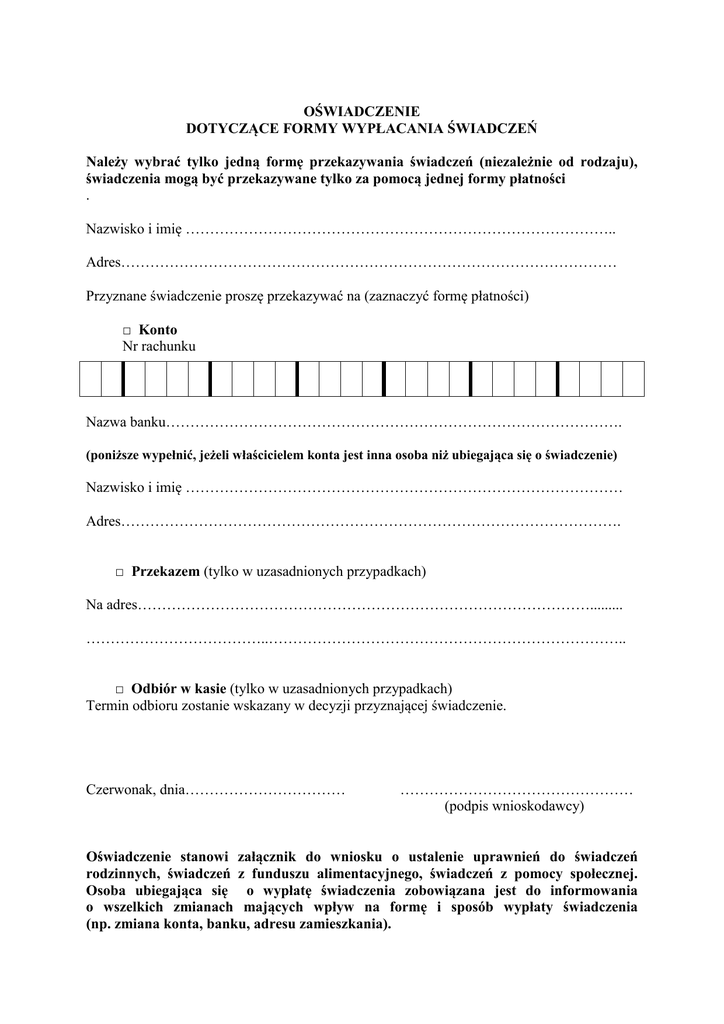 OŚWIADCZENIE DOTYCZĄCE FORMY WYPŁACANIA ŚWIADCZEŃ Należy wybrać tylko jedną formę przekazywania świadczeń (niezależnie od rodzaju), świadczenia mogą być przekazywane tylko za pomocą jednej formy płatności . Nazwisko i imię …………………………………………………………………………….. Adres………………………………………………………………………………………… Przyznane świadczenie proszę przekazywać na (zaznaczyć formę płatności) □ Konto Nr rachunku Nazwa banku…………………………………………………………………………………. (poniższe wypełnić, jeżeli właścicielem konta jest inna osoba niż ubiegająca się o świadczenie) Nazwisko i imię ……………………………………………………………………………… Adres…………………………………………………………………………………………. □ Przekazem (tylko w uzasadnionych przypadkach) Na adres…………………………………………………………………………………......... ………………………………..……………………………………………………………….. □ Odbiór w kasie (tylko w uzasadnionych przypadkach) Termin odbioru zostanie wskazany w decyzji przyznającej świadczenie. Czerwonak, dnia…………………………… ………………………………………… (podpis wnioskodawcy) Oświadczenie stanowi załącznik do wniosku o ustalenie uprawnień do świadczeń rodzinnych, świadczeń z funduszu alimentacyjnego, świadczeń z pomocy społecznej. Osoba ubiegająca się o wypłatę świadczenia zobowiązana jest do informowania o wszelkich zmianach mających wpływ na formę i sposób wypłaty świadczenia (np. zmiana konta, banku, adresu zamieszkania). …………………………………………………………… miejscowość, data OŚWIADCZENIE Oświadczam, że wyrażam zgodę na przetwarzanie podanych przeze mnie moich danych osobowych, na zasadach określonych w ustawie z dnia 29 sierpnia 1997 r. o ochronie danych osobowych (Dz. U. z 2002 r. Nr 101, poz. 926 z późn. zm.) w zbiorze danych osobowych prowadzonym przez: ……………………………………………………………………………………………… nazwa instytucji, w której gromadzone są dane osobowe dla celów związanych z ustaleniem uprawnień do świadczeń rodzinnych, w oparciu o ustawę z dnia 28 listopada 2003 r. o świadczeniach rodzinnych (Dz. U. z 2015r. , poz.114 ze zm.). Jednocześnie przyjmuję do wiadomości fakt, że przysługuje mi prawo wglądu do swoich danych osobowych oraz prawo ich poprawiania – t.j. uprawnienia wynikające z art. 24 ust.1 oraz art.32 ustawy o ochronie danych osobowych. ……………………………………… podpis osoby przyjmującej oświadczenie ………………………………… data i podpis składającego oświadczenie