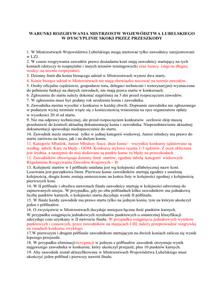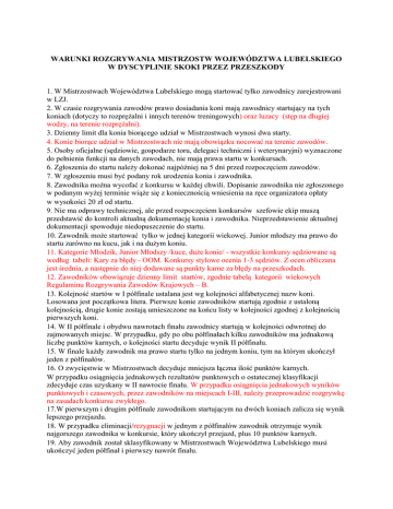 WARUNKI ROZGRYWANIA MISTRZOSTW WOJEWÓDZTWA LUBELSKIEGO W DYSCYPLINIE SKOKI PRZEZ PRZESZKODY 1. W Mistrzostwach Województwa Lubelskiego mogą startować tylko zawodnicy zarejestrowani w LZJ. 2. W czasie rozgrywania zawodów prawo dosiadania koni mają zawodnicy startujący na tych koniach (dotyczy to rozprężalni i innych terenów treningowych) oraz luzacy (stęp na długiej wodzy, na terenie rozprężalni). 3. Dzienny limit dla konia biorącego udział w Mistrzostwach wynosi dwa starty. 4. Konie biorące udział w Mistrzostwach nie mają obowiązku nocować na terenie zawodów. 5. Osoby oficjalne (sędziowie, gospodarze toru, delegaci techniczni i weterynaryjni) wyznaczone do pełnienia funkcji na danych zawodach, nie mają prawa startu w konkursach. 6. Zgłoszenia do startu należy dokonać najpóźniej na 5 dni przed rozpoczęciem zawodów. 7. W zgłoszeniu musi być podany rok urodzenia konia i zawodnika. 8. Zawodnika można wycofać z konkursu w każdej chwili. Dopisanie zawodnika nie zgłoszonego w podanym wyżej terminie wiąże się z koniecznością wniesienia na ręce organizatora opłaty w wysokości 20 zł od startu. 9. Nie ma odprawy technicznej, ale przed rozpoczęciem konkursów szefowie ekip muszą przedstawić do kontroli aktualną dokumentację konia i zawodnika. Nieprzedstawienie aktualnej dokumentacji spowoduje niedopuszczenie do startu. 10. Zawodnik może startować tylko w jednej kategorii wiekowej. Junior młodszy ma prawo do startu zarówno na kucu, jak i na dużym koniu. 11. Kategorie Młodzik, Junior Młodszy /kuce, duże konie/ - wszystkie konkursy sędziowane są według tabeli: Kary za błędy - OOM. Konkursy stylowe ocenia 1-3 sędziów. Z ocen obliczana jest średnia, a następnie do niej dodawane są punkty karne za błędy na przeszkodach. 12. Zawodników obowiązuje dzienny limit startów, zgodnie tabelą kategorii wiekowych Regulaminu Rozgrywania Zawodów Krajowych – B. 13. Kolejność startów w I półfinale ustalana jest wg kolejności alfabetycznej nazw koni. Losowana jest początkowa litera. Pierwsze konie zawodników startują zgodnie z ustaloną kolejnością, drugie konie zostają umieszczone na końcu listy w kolejności zgodnej z kolejnością pierwszych koni. 14. W II półfinale i obydwu nawrotach finału zawodnicy startują w kolejności odwrotnej do zajmowanych miejsc. W przypadku, gdy po obu półfinałach kilku zawodników ma jednakową liczbę punktów karnych, o kolejności startu decyduje wynik II półfinału. 15. W finale każdy zawodnik ma prawo startu tylko na jednym koniu, tym na którym ukończył jeden z półfinałów. 16. O zwycięstwie w Mistrzostwach decyduje mniejsza łączna ilość punktów karnych. W przypadku osiągnięcia jednakowych rezultatów punktowych o ostatecznej klasyfikacji zdecyduje czas uzyskany w II nawrocie finału. W przypadku osiągnięcia jednakowych wyników punktowych i czasowych, przez zawodników na miejscach I-III, należy przeprowadzić rozgrywkę na zasadach konkursu zwykłego. 17.W pierwszym i drugim półfinale zawodnikom startującym na dwóch koniach zalicza się wynik lepszego przejazdu. 18. W przypadku eliminacji/rezygnacji w jednym z półfinałów zawodnik otrzymuje wynik najgorszego zawodnika w konkursie, który ukończył przejazd, plus 10 punktów karnych. 19. Aby zawodnik został sklasyfikowany w Mistrzostwach Województwa Lubelskiego musi ukończyć jeden półfinał i pierwszy nawrót finału. 1. Warunki rozgrywania halowych Mistrzostw Województwa Lubelskiego Seniorzy Młodzi Jeźdźcy Juniorzy Juniorzy Młodsi (duże konie) Juniorzy Młodsi (kuce) Młodzicy 14 - 18 12 – 15 12 – 15 9 -13 5 lat 5 lat 4 lata 4 lata 4 lata N P L L 80 cm 60 cm dokładności II półfinał dokładności dokładności z oceną stylu z oceną stylu z oceną stylu N P P L dokładności dokładności I nawrót finału dokładności z oceną stylu z oceną stylu z oceną stylu N P L 80 cm 70 cm dokładności dokładności II nawrót finału dokładności dokładności dokładności dokładności N N P L 80 cm 70 cm zwykły zwykły zwykły zwykły zwykły zwykły Wiek zawodnika 18+ 16 - 21 Minimalny wiek konia 5 lat I półfinał P 80 cm 70 cm 2. Warunki rozgrywania otwartych Mistrzostw Województwa Lubelskiego Seniorzy Młodzi Jeźdźcy Juniorzy Juniorzy Młodsi (duże konie) Juniorzy Młodsi (kuce) Młodzicy 14 - 18 12 – 15 12 – 15 9 -13 5 lat 5 lat 4 lata 4 lata 4 lata N P P L 80 cm 70 cm szybkości II półfinał szybkości dokładności z oceną stylu z oceną stylu z oceną stylu C N P P 80 cm dokładności dokładności I nawrót finału dokładności dokładności z oceną stylu z oceną stylu C N P 80 cm 80 cm dokładności dokładności II nawrót finału dokładności dokładności dokładności dokładności C N N P 80 cm 80 cm zwykły zwykły zwykły zwykły zwykły zwykły Wiek zawodnika 18+ 16 - 21 Minimalny wiek konia 6 lat I półfinał N 80 cm KARY ZA BŁĘDY OOM (MŁODZIK, JUNIOR MŁODSZY KUCE/DUŻE KONIE) Lp. Elementy podlegające ocenie Kara Uwagi 1. Poprawienie krzyżowania lub galopu z niewłaściwej nogi poprzez zmianę nogi z przejściem do kłusa: 0,5 Każdy zakręt oceniany osobno. 2. Krzyżowanie lub galop z niewłaściwej nogi: 1 Każdy zakręt oceniany osobno. 3. Nieregularna jazda w linii lub w szeregu: 0,5 Każda linia i szereg oceniane są osobno. 4. Błędy w skoku np. pozostanie z ciałem lub wyprzedzenie: 0,5 – 1 Każdy skok oceniany osobno 5. Nadużycie bata Elim. 6. Ogólne wrażenie (dosiad, użycie pomocy, rytm, równowaga, płynność przejazdu wjazd i zjazd z parkuru, wygląd ogólny jeźdźca i konia): 0 – 3,5 7. Błędy na przeszkodach: a) zrzutka: b) pierwsze wyłamanie: c) drugie wyłamanie: d) trzecie wyłamanie MS d) upadek: f) przekroczenie normy czasu: g) przekroczenie czasu maksymalnego. Nienaganny przejazd 0 pkt. Stosuje się oceny, co 0,5 pkt. 2 2 4 Elim. Elim. 1 Elim. Za każde rozpoczęte 4 sek. Polski Związek Jeździecki prosi wszystkie