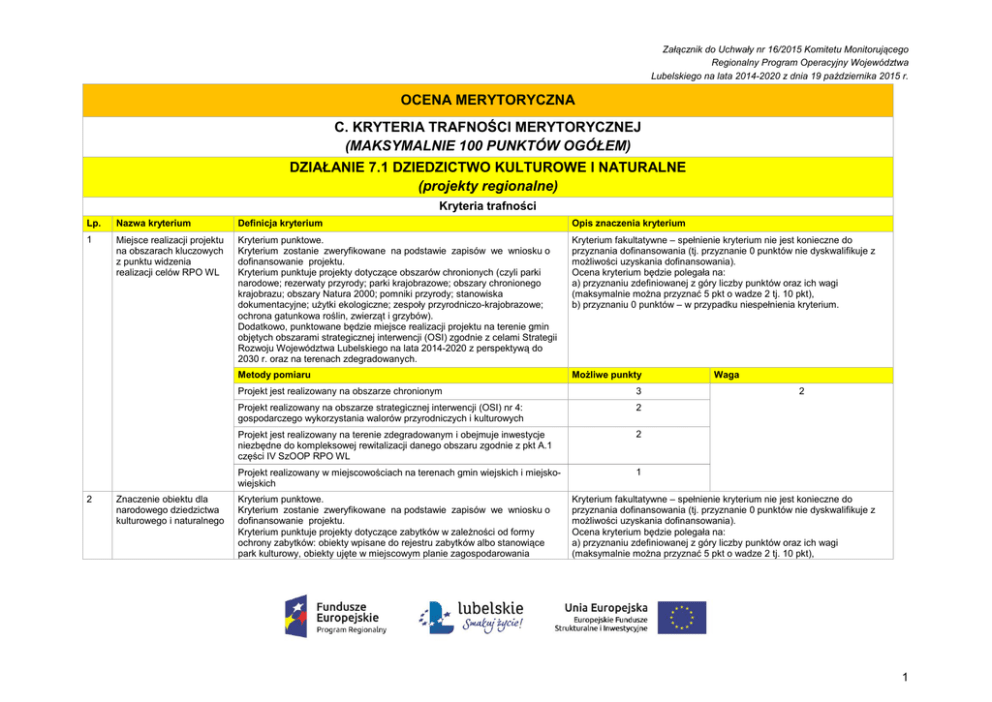 Załącznik do Uchwały nr 16/2015 Komitetu Monitorującego Regionalny Program Operacyjny Województwa Lubelskiego na lata 2014-2020 z dnia 19 października 2015 r. OCENA MERYTORYCZNA C. KRYTERIA TRAFNOŚCI MERYTORYCZNEJ (MAKSYMALNIE 100 PUNKTÓW OGÓŁEM) DZIAŁANIE 7.1 DZIEDZICTWO KULTUROWE I NATURALNE (projekty regionalne) Kryteria trafności Lp. Nazwa kryterium Definicja kryterium Opis znaczenia kryterium 1 Miejsce realizacji projektu na obszarach kluczowych z punktu widzenia realizacji celów RPO WL Kryterium punktowe. Kryterium zostanie zweryfikowane na podstawie zapisów we wniosku o dofinansowanie projektu. Kryterium punktuje projekty dotyczące obszarów chronionych (czyli parki narodowe; rezerwaty przyrody; parki krajobrazowe; obszary chronionego krajobrazu; obszary Natura 2000; pomniki przyrody; stanowiska dokumentacyjne; użytki ekologiczne; zespoły przyrodniczo-krajobrazowe; ochrona gatunkowa roślin, zwierząt i grzybów). Dodatkowo, punktowane będzie miejsce realizacji projektu na terenie gmin objętych obszarami strategicznej interwencji (OSI) zgodnie z celami Strategii Rozwoju Województwa Lubelskiego na lata 2014-2020 z perspektywą do 2030 r. oraz na terenach zdegradowanych. Kryterium fakultatywne – spełnienie kryterium nie jest konieczne do przyznania dofinansowania (tj. przyznanie 0 punktów nie dyskwalifikuje z możliwości uzyskania dofinansowania). Ocena kryterium będzie polegała na: a) przyznaniu zdefiniowanej z góry liczby punktów oraz ich wagi (maksymalnie można przyznać 5 pkt o wadze 2 tj. 10 pkt), b) przyznaniu 0 punktów – w przypadku niespełnienia kryterium. Metody pomiaru Możliwe punkty 2 Znaczenie obiektu dla narodowego dziedzictwa kulturowego i naturalnego Projekt jest realizowany na obszarze chronionym 3 Projekt realizowany na obszarze strategicznej interwencji (OSI) nr 4: gospodarczego wykorzystania walorów przyrodniczych i kulturowych 2 Projekt jest realizowany na terenie zdegradowanym i obejmuje inwestycje niezbędne do kompleksowej rewitalizacji danego obszaru zgodnie z pkt A.1 części IV SzOOP RPO WL 2 Projekt realizowany w miejscowościach na terenach gmin wiejskich i miejskowiejskich 1 Kryterium punktowe. Kryterium zostanie zweryfikowane na podstawie zapisów we wniosku o dofinansowanie projektu. Kryterium punktuje projekty dotyczące zabytków w zależności od formy ochrony zabytków: obiekty wpisane do rejestru zabytków albo stanowiące park kulturowy, obiekty ujęte w miejscowym planie zagospodarowania Waga 2 Kryterium fakultatywne – spełnienie kryterium nie jest konieczne do przyznania dofinansowania (tj. przyznanie 0 punktów nie dyskwalifikuje z możliwości uzyskania dofinansowania). Ocena kryterium będzie polegała na: a) przyznaniu zdefiniowanej z góry liczby punktów oraz ich wagi (maksymalnie można przyznać 5 pkt o wadze 2 tj. 10 pkt), 1 przestrzennego. Obiekty nie są objęte żadną formą ochrony ale posiadają wartość zabytkową będą punktowane najniżej. Załącznik do Uchwały nr 16/2015 Komitetu Monitorującego Regionalny Program Operacyjny Województwa Lubelskiego na lata 2014-2020 z dnia 19 października 2015 r. b) przyznaniu 0 punktów – w przypadku niespełnienia kryterium. Możliwe punkty Metody pomiaru Projektem objęte są obiekty wpisane do rejestru zabytków albo stanowiące park kulturowy albo dotyczą zachowania dziedzictwa niematerialnego 3 Projektem objęte są obiekty ujęte w miejscowym planie zagospodarowania przestrzennego 2 Projektem objęte są obiekty nie objęte żadną formą ochrony, ale posiadające wartość zabytkową 1 Waga 2 Kryteria skuteczności / efektywności Lp. Nazwa kryterium Definicja kryterium Opis znaczenia kryterium 1 Efektywność kosztowa wsparcia 1 obiektu zasobów kultury Kryterium punktowe. Kryterium zostanie zweryfikowane na podstawie zapisów we wniosku o dofinansowanie projektu. Kryterium ocenia średni umowny koszt jednostkowy uzyskania 1 jednostki wskaźnika produktu w projekcie w porównaniu z analogicznym kosztem jednostkowym zaplanowanym w Programie. Umowny koszt jednostkowy wykorzystany do wyliczenia wartości wskaźnika w Programie wyniósł 4 683 473 zł/szt. (dla typów projektów 1-7) i 3 010 804 zł/szt. (dla typów projektów 8-11) i będzie on stanowił punkt odniesienia podczas oceny projektów tym kryterium. Kryterium fakultatywne – spełnienie kryterium nie jest konieczne do przyznania dofinansowania (tj. przyznanie 0 punktów nie dyskwalifikuje z możliwości uzyskania dofinansowania). Ocena kryterium będzie polegała na: a) wyliczeniu dla projektu wartości umownego kosztu jednostkowego dla danego wskaźnika poprzez podzielenie dofinansowania z EFRR dla projektu przez poziom wskaźnika produktu osiąganego w projekcie (i zaokrąglenia do pełnych złotych), a następnie sprawdzeniu, w którym przedziale mieści się wyliczony wskaźnik i przyznaniu odpowiedniej liczby punktów, b) wyliczeniu umownych kosztów jednostkowych dla danego projektu dla pozostałych wskaźników, które wystąpiły w projekcie oraz przyznaniu odpowiedniej liczby punktów (jeżeli dany wskaźnik nie występuje w projekcie, nie przyznaje się punktów), c) wyliczeniu średniej ze wszystkich przyznanych punktów dla wypełnionych wskaźników, a następnie przemożeniu jej przez wagę (maksymalnie można przyznać 5 pkt o wadze 5 tj. 25 pkt), d) przyznaniu 0 punktów - kiedy projekt nie realizuje żadnego ze wskaźników. Metody pomiaru Możliwe punkty Typy projektów 1-7 Typy projektów 8-11 Efektywność kosztowa na poziomie poniżej 75% średniego kosztu (do 3 512 604 zł/szt. włącznie) Efektywność kosztowa na poziomie poniżej 75% średniego kosztu (do 2 258 102 zł/szt. włącznie) 5 Efektywność kosztowa na poziomie wyższym lub równym 75% i niższym Efektywność kosztowa na poziomie wyższym lub równym 75% i niższym 4 Waga 5 2 Załącznik do Uchwały nr 16/2015 Komitetu Monitorującego Regionalny Program Operacyjny Województwa Lubelskiego n