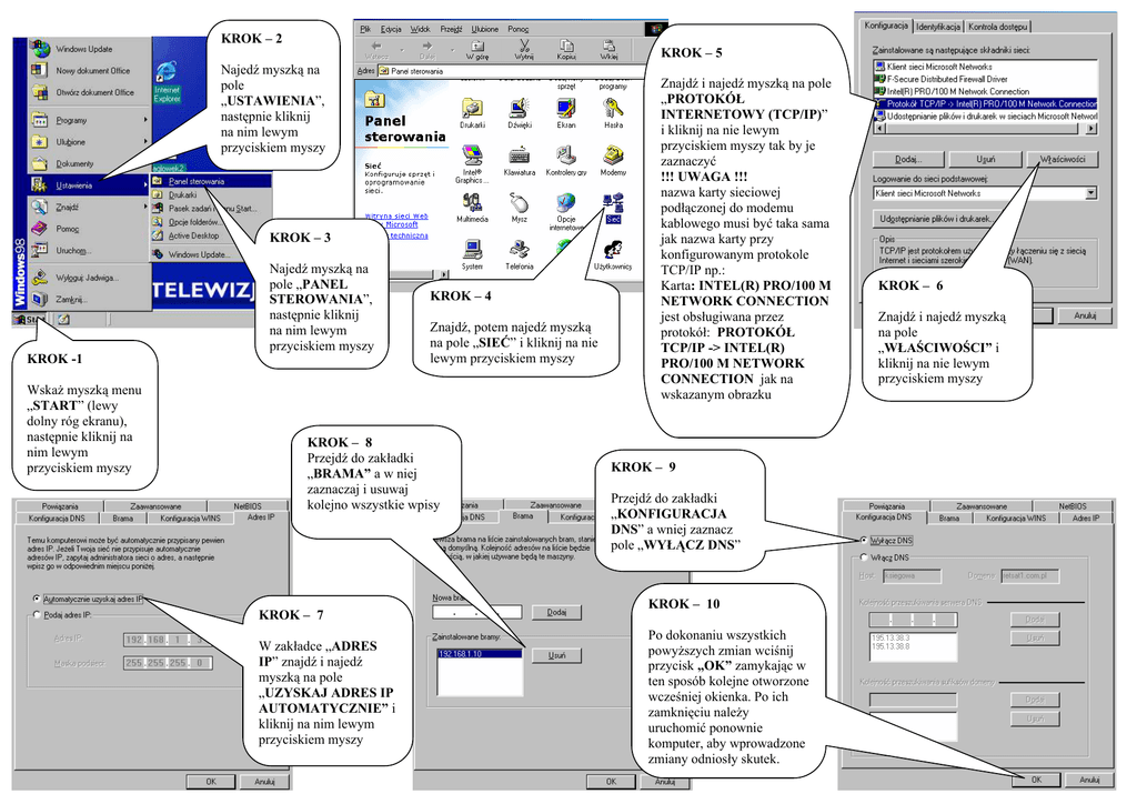 KROK – 2 KROK – 5 Najedź myszką na pole „USTAWIENIA”, następnie kliknij na nim lewym przyciskiem myszy KROK – 3 Najedź myszką na pole „PANEL STEROWANIA”, następnie kliknij na nim lewym przyciskiem myszy KROK -1 WskaŜ myszką menu „START” (lewy dolny róg ekranu), następnie kliknij na nim lewym przyciskiem myszy KROK – 4 Znajdź, potem najedź myszką na pole „SIEĆ” i kliknij na nie lewym przyciskiem myszy KROK – 8 Przejdź do zakładki „BRAMA” a w niej zaznaczaj i usuwaj kolejno wszystkie wpisy KROK – 7 W zakładce „ADRES IP” znajdź i najedź myszką na pole „UZYSKAJ ADRES IP AUTOMATYCZNIE” i kliknij na nim lewym przyciskiem myszy Znajdź i najedź myszką na pole „PROTOKÓŁ INTERNETOWY (TCP/IP)” i kliknij na nie lewym przyciskiem myszy tak by je zaznaczyć !!! UWAGA !!! nazwa karty sieciowej podłączonej do modemu kablowego musi być taka sama jak nazwa karty przy konfigurowanym protokole TCP/IP np.: Karta: INTEL(R) PRO/100 M NETWORK CONNECTION jest obsługiwana przez protokół: PROTOKÓŁ TCP/IP -> INTEL(R) PRO/100 M NETWORK CONNECTION jak na wskazanym obrazku KROK – 9 Przejdź do zakładki „KONFIGURACJA DNS” a wniej zaznacz pole „WYŁĄCZ DNS” KROK – 10 Po dokonaniu wszystkich powyŜszych zmian wciśnij przycisk „OK” zamykając w ten sposób kolejne otworzone wcześniej okienka. Po ich zamknięciu naleŜy uruchomić ponownie komputer, aby wprowadzone zmiany odniosły skutek. KROK – 6 Znajdź i najedź myszką na pole „WŁAŚCIWOŚCI” i kliknij na nie lewym przyciskiem myszy