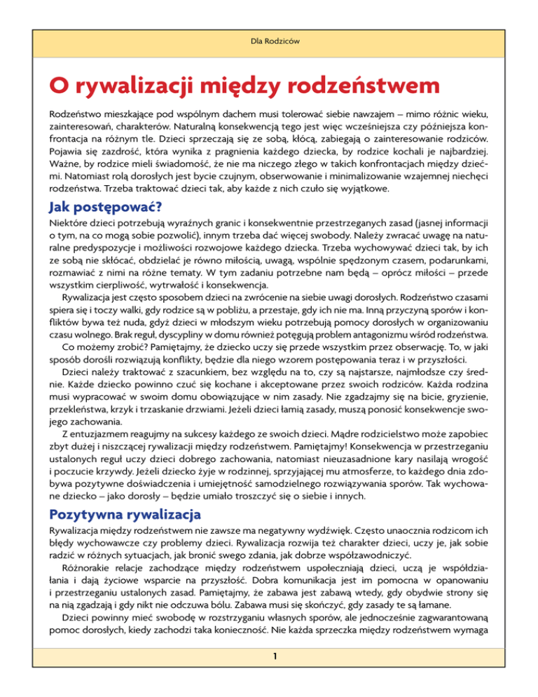 Dla Rodziców O rywalizacji między rodzeństwem Rodzeństwo mieszkające pod wspólnym dachem musi tolerować siebie nawzajem – mimo różnic wieku, zainteresowań, charakterów. Naturalną konsekwencją tego jest więc wcześniejsza czy późniejsza konfrontacja na różnym tle. Dzieci sprzeczają się ze sobą, kłócą, zabiegają o zainteresowanie rodziców. Pojawia się zazdrość, która wynika z pragnienia każdego dziecka, by rodzice kochali je najbardziej. Ważne, by rodzice mieli świadomość, że nie ma niczego złego w takich konfrontacjach między dziećmi. Natomiast rolą dorosłych jest bycie czujnym, obserwowanie i minimalizowanie wzajemnej niechęci rodzeństwa. Trzeba traktować dzieci tak, aby każde z nich czuło się wyjątkowe. Jak postępować? Niektóre dzieci potrzebują wyraźnych granic i konsekwentnie przestrzeganych zasad (jasnej informacji o tym, na co mogą sobie pozwolić), innym trzeba dać więcej swobody. Należy zwracać uwagę na naturalne predyspozycje i możliwości rozwojowe każdego dziecka. Trzeba wychowywać dzieci tak, by ich ze sobą nie skłócać, obdzielać je równo miłością, uwagą, wspólnie spędzonym czasem, podarunkami, rozmawiać z nimi na różne tematy. W tym zadaniu potrzebne nam będą – oprócz miłości – przede wszystkim cierpliwość, wytrwałość i konsekwencja. Rywalizacja jest często sposobem dzieci na zwrócenie na siebie uwagi dorosłych. Rodzeństwo czasami spiera się i toczy walki, gdy rodzice są w pobliżu, a przestaje, gdy ich nie ma. Inną przyczyną sporów i konfliktów bywa też nuda, gdyż dzieci w młodszym wieku potrzebują pomocy dorosłych w organizowaniu czasu wolnego. Brak reguł, dyscypliny w domu również potęgują problem antagonizmu wśród rodzeństwa. Co możemy zrobić? Pamiętajmy, że dziecko uczy się przede wszystkim przez obserwację. To, w jaki sposób dorośli rozwiązują konflikty, będzie dla niego wzorem postępowania teraz i w przyszłości. Dzieci należy traktować z szacunkiem, bez względu na to, czy są najstarsze, najmłodsze czy średnie. Każde dziecko powinno czuć się kochane i akceptowane przez swoich rodziców. Każda rodzina musi wypracować w swoim domu obowiązujące w nim zasady. Nie zgadzajmy się na bicie, gryzienie, przekleństwa, krzyk i trzaskanie drzwiami. Jeżeli dzieci łamią zasady, muszą ponosić konsekwencje swojego zachowania. Z entuzjazmem reagujmy na sukcesy każdego ze swoich dzieci. Mądre rodzicielstwo może zapobiec zbyt dużej i niszczącej rywalizacji między rodzeństwem. Pamiętajmy! Konsekwencja w przestrzeganiu ustalonych reguł uczy dzieci dobrego zachowania, natomiast nieuzasadnione kary nasilają wrogość i poczucie krzywdy. Jeżeli dziecko żyje w rodzinnej, sprzyjającej mu atmosferze, to każdego dnia zdobywa pozytywne doświadczenia i umiejętność samodzielnego rozwiązywania sporów. Tak wychowane dziecko – jako dorosły – będzie umiało troszczyć się o siebie i innych. Pozytywna rywalizacja Rywalizacja między rodzeństwem nie zawsze ma negatywny wydźwięk. Często unaocznia rodzicom ich błędy wychowawcze czy problemy dzieci. Rywalizacja rozwija też charakter dzieci, uczy je, jak sobie radzić w różnych sytuacjach, jak bronić swego zdania, jak dobrze współzawodniczyć. Różnorakie relacje zachodzące między rodzeństwem uspołeczniają dzieci, uczą je współdziałania i dają życiowe wsparcie na przyszłość. Dobra komunikacja jest im pomocna w opanowaniu i przestrzeganiu ustalonych zasad. Pamiętajmy, że zabawa jest zabawą wtedy, gdy obydwie strony się na nią zgadzają i gdy nikt nie odczuwa bólu. Zabawa musi się skończyć, gdy zasady te są łamane. Dzieci powinny mieć swobodę w rozstrzyganiu własnych sporów, ale jednocześnie zagwarantowaną pomoc dorosłych, kiedy zachodzi taka konieczność. Nie każda sprzeczka między rodzeństwem wymaga 1 Dla Rodziców • O rywalizacji między rodzeństwem jednak interwencji dorosłych. Rodzice nie powinni zawsze występować w roli mediatorów. Dlatego należy nauczyć dzieci, jak samodzielnie radzić sobie z konfliktami. Jak uczyć dzieci rozwiązywania konfliktów? Oto kilka wskazówek, które mogą pomóc w rozwiązywaniu konfliktów między rodzeństwem. • Określmy uczucia dzieci, czyli zacznijmy od stwierdzenia, że są na siebie złe. To pomoże im ochłonąć. • Wysłuchajmy spokojnie, co każde dziecko ma do powiedzenia – bądźmy uważnymi słuchaczami, traktujmy problem poważnie. • Dajmy wyraz przekonaniu, że dzieci same potrafią znaleźć rozwiązanie, które zadowoli obie strony konfliktu. • Wyjdźmy, zostawiając dzieci same – potrzebują czasu na ochłonięcie i przemyślenie problemu. • Określmy granice zachowania oraz podkreślmy wyraźnie zasadę, że jedno dziecko nie może bawić się kosztem drugiego. W bardzo trudnych sytuacjach, gdy dzieci są skłonne nawet zrobić sobie krzywdę, możemy im pomóc przez konkretne działania. • Opiszmy sytuację, zwracając się do nich np.: „Widzę bardzo zezłoszczone dzieci, które zaraz zrobią sobie krzywdę”. • Ustalmy granicę, mówiąc np.: „Dobra zabawa kończy się wówczas, gdy są łamane ustalone wcześniej zasady”. • Rozdzielmy dzieci, wypowiadając przy tym zdanie: „Nie możecie być teraz razem, to niebezpieczne, idźcie każde do innego pokoju, musicie ochłonąć”. Dzieci potrzebują dużo uwagi. Najlepszym lekarstwem na powstrzymanie rywalizacji między nimi jest więc częste okazywanie każdemu z nich zainteresowania i potwierdzanie jego wartości. Jeżeli zaproponujecie swoim dzieciom odpowiednie zabawy, wspólne spędzanie czasu, zagwarantujecie konsekwencję w przestrzeganiu ustalonych reguł, ich potrzeby będą zaspokajane. Zrozumieją, że ich rodzeństwo również potrzebuje uwagi, i nie będą zazdrosne o uwagę rodziców. Problemy między rodzeństwem pojawiają się wtedy, gdy któreś z dzieci jest traktowane w domu w