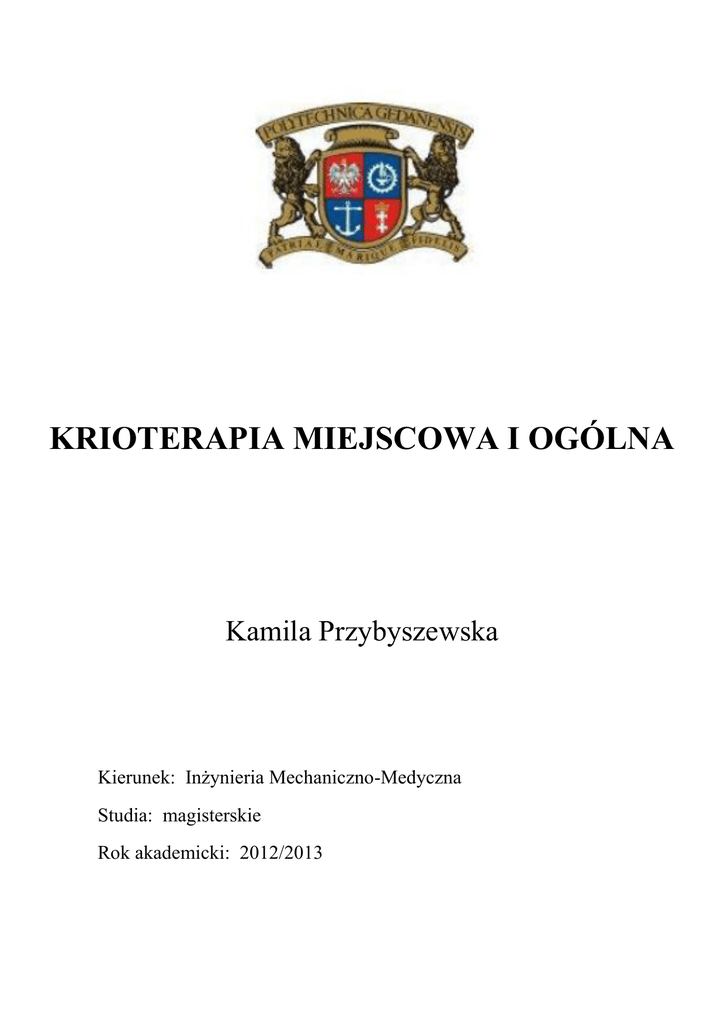 KRIOTERAPIA MIEJSCOWA I OGÓLNA Kamila Przybyszewska Kierunek: Inżynieria Mechaniczno-Medyczna Studia: magisterskie Rok akademicki: 2012/2013 Spis treści 1. 2. Krioterapia ....................................................................................................................................... 3 1.1. Historia krioterapii................................................................................................................... 3 1.2. Czynniki chłodzące stosowane w krioterapii ........................................................................... 3 1.3. Działanie temperatur kriogenicznych na organizm człowieka ................................................ 4 Krioterapia miejscowa i ogólnoustrojowa:...................................................................................... 5 2.1. Krioterapia miejscowa ............................................................................................................. 5 2.1.1. 2.2. Efekty terapeutyczne....................................................................................................... 6 Krioterapia ogólnoustrojowa .................................................................................................. 7 2.2.1. Efekty terapeutyczne....................................................................................................... 8 2.2.2. Schemat instalacji kriokomory ........................................................................................ 9 3. Wskazania i przeciwwskazania do krioterapii ............................................................................... 10 4. Podsumowanie .............................................................................................................................. 11 5. Bibliografia..................................................................................................................................... 12 1. Krioterapia Najprościej rzecz ujmując krioterapia to leczenie zimnem. Dokładne wyjaśnienie na czym polega krioterapia jest już bardziej skomplikowane. Polscy specjaliści pod pojęciem krioterapii rozumieją bodźcowe, stymulujące działanie na zewnętrzne powłoki ciała krańcowo niskich temperatur (poniżej100`C) przez okres nie dłuższy niż 3 minuty, w celu wywołania fizjologicznych reakcji ustroju na zimno i wykorzystania ich we wspomaganiu leczenia podstawowego i kinezyterapii [1]. 1.1. Historia krioterapii Prekursorem wykorzystania bodźca kriogenicznego w praktyce był prof. T. Yamauchi, którego zespół naukowy w 1978 roku skonstruował pierwszą na świecie kriokomorę i zastosował krioterapię ogólnoustrojową w leczeniu pacjentów z rozpoznaniem zesztywniającego zapalenia stawów. Efekty kliniczne zastosowanej terapii zostały publicznie przedstawione w 1981 roku. Drugą na świecie, a zarazem pierwszą w Europie kriokomorę skonstruował zespół pod kierunkiem prof. R. Fricke w 1982 roku, w Niemczech. Dzięki współpracy interdyscyplinarnego zespołu naukowego pod kierunkiem prof. Z. Zagrobelnego, zrzeszającego pracowników naukowych Akademii Wychowania Fizycznego we Wrocławiu, Akademii Medycznej we Wrocławiu oraz Instytutu Niskich Temperatur i Badań Strukturalnych PAN, już w 1983 roku skonstruowano i wprowadzono do klinicznego użycia pierwszy w Polsce krioaplikator. W kilka lat po tym, w 1989 roku, zespół pod kierunkiem mgr inż. Z. Raczkowskiego skonstruował pierwszą w Polsce kriokomorę [1]. 1.2. Czynniki chłodzące stosowane w krioterapii Krioterapia (kriostymulacja) stosuje pary skroplonych gazów o krańcowo niskich temperaturach w celu wychłodzenia powierzchni ciała pacjenta. Do wywołania efektu kriostymulacji służą aparaty wykorzystujące nadmuch parami skroplonego dwutlenku węgla (CO2 :- 75C) lub parami ciekłego azotu (N2 : - 196C). Ponad to stosuje się również zimne powietrze o temperaturze w przedziale -30 ˚C ÷ - 15 ˚C. Rys.1. Opary ciekłego azot. 1.3. Działanie temperatur kriogenicznych na organizm człowieka Istnieje szereg efektów działania niskich temperatur na organizm człowieka. Podczas kriostymulacji dochodzi do oziębienia tkanek powierzchniowych oraz zmian w mikrokrążeniu. Początkowo naczynia krwionośne ulegają odruchowemu zwężeniu, lecz po upływie kilkunastu sekund następuje ich rozszerzenie. Skutkuje to silnym wzrostem ukrwienia tkankowego, który może trwać nawet przez 6 godzin. Jednocześnie rośnie temperatura skóry, osiągając po kilkunastu minutach wyjściową wartość, a potem ją przekraczając. Jednym z najważniejszych efektów kriostymulacji jest kilkugodzinna zwiększona perfuzja krwi, która poprawia przemianę materii, ułatwia transport tlenu do mięśni, pomaga usuwać szkodliwe produkty metabolizmu. Kolejnym wpływem jest działanie przeciwbólowe analgetyczne. Krańcowo niskie temperatury powodują również zmniejszenie napięcia mięśni, spowodowane spowolnieniem przewodnictwa nerwowego. Wraz z efektem relaksacji obserwuje się wzrost siły mięśniowej. Temperatury kriogeniczne wpływają na poprawę nastroju, czy komfortu snu. Krioterapia odgrywa również ważną rolę w podnoszeniu odporności humoralnej i komórkowej organizmu. Ponadto stwierdzono, że zabiegi te wpływają na poprawę ogólnej wydolności fizycznej u sportowców. W oddziaływaniu „zimna" na organizm człowieka wyróżnia się dwie fazy, których skutki opisane są w tabeli 2. Skutki występujące w pierwszej fazie są naturalną reakcją organizmu na „zimno". Nie określa się ich jako szkodliwe (patologiczne) dla organizmu ludzkiego, gdyż są one zgodne z fizjologią człowieka. Efekty w fazie drugiej są tym, co zamierza się uzyskać stosując zabieg krioterapii.’ Tab. 1. Zestawienie fizjologicznych reakcji organizmu na zimno [5]. 2. Krioterapia miejscowa i ogólnoustrojowa: Ze względu na wielkości powierzchni ciała wystawionej na działanie ekstremalnie niskich temperatur wyróżnia się krioterapi