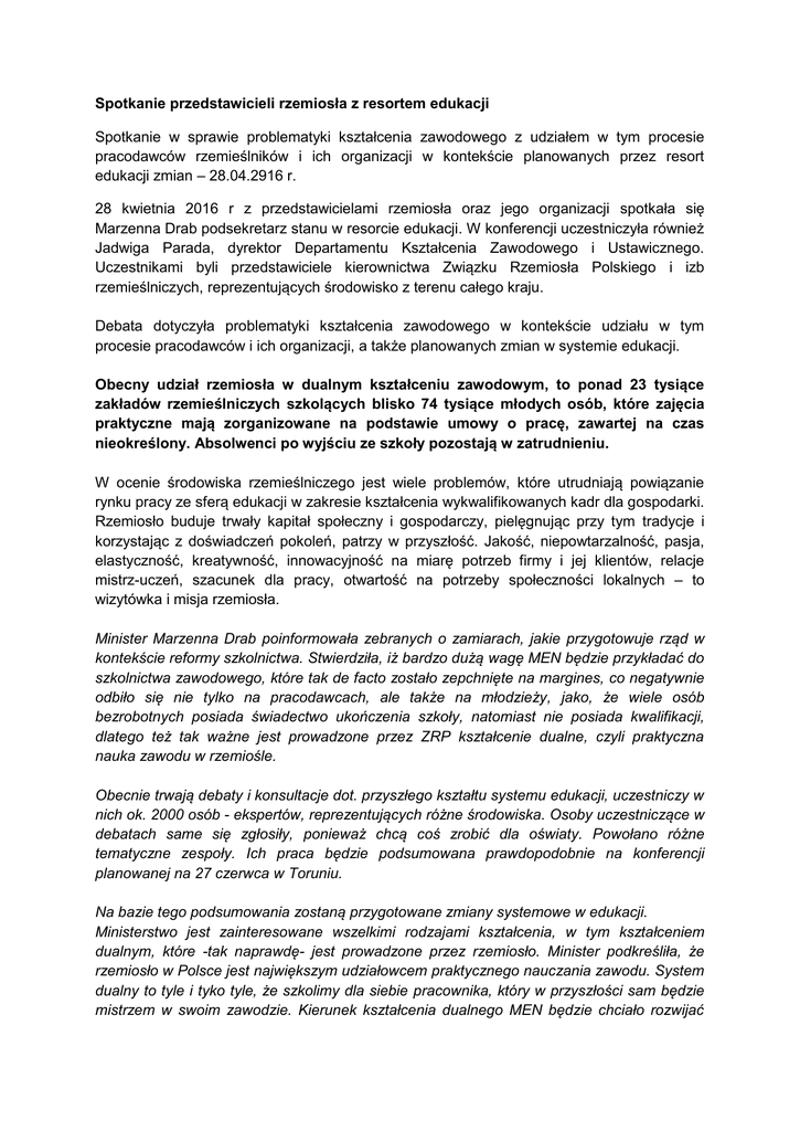 Spotkanie przedstawicieli rzemiosła z resortem edukacji Spotkanie w sprawie problematyki kształcenia zawodowego z udziałem w tym procesie pracodawców rzemieślników i ich organizacji w kontekście planowanych przez resort edukacji zmian – 28.04.2916 r. 28 kwietnia 2016 r z przedstawicielami rzemiosła oraz jego organizacji spotkała się Marzenna Drab podsekretarz stanu w resorcie edukacji. W konferencji uczestniczyła również Jadwiga Parada, dyrektor Departamentu Kształcenia Zawodowego i Ustawicznego. Uczestnikami byli przedstawiciele kierownictwa Związku Rzemiosła Polskiego i izb rzemieślniczych, reprezentujących środowisko z terenu całego kraju. Debata dotyczyła problematyki kształcenia zawodowego w kontekście udziału w tym procesie pracodawców i ich organizacji, a także planowanych zmian w systemie edukacji. Obecny udział rzemiosła w dualnym kształceniu zawodowym, to ponad 23 tysiące zakładów rzemieślniczych szkolących blisko 74 tysiące młodych osób, które zajęcia praktyczne mają zorganizowane na podstawie umowy o pracę, zawartej na czas nieokreślony. Absolwenci po wyjściu ze szkoły pozostają w zatrudnieniu. W ocenie środowiska rzemieślniczego jest wiele problemów, które utrudniają powiązanie rynku pracy ze sferą edukacji w zakresie kształcenia wykwalifikowanych kadr dla gospodarki. Rzemiosło buduje trwały kapitał społeczny i gospodarczy, pielęgnując przy tym tradycje i korzystając z doświadczeń pokoleń, patrzy w przyszłość. Jakość, niepowtarzalność, pasja, elastyczność, kreatywność, innowacyjność na miarę potrzeb firmy i jej klientów, relacje mistrz-uczeń, szacunek dla pracy, otwartość na potrzeby społeczności lokalnych – to wizytówka i misja rzemiosła. Minister Marzenna Drab poinformowała zebranych o zamiarach, jakie przygotowuje rząd w kontekście reformy szkolnictwa. Stwierdziła, iż bardzo dużą wagę MEN będzie przykładać do szkolnictwa zawodowego, które tak de facto zostało zepchnięte na margines, co negatywnie odbiło się nie tylko na pracodawcach, ale także na młodzieży, jako, że wiele osób bezrobotnych posiada świadectwo ukończenia szkoły, natomiast nie posiada kwalifikacji, dlatego też tak ważne jest prowadzone przez ZRP kształcenie dualne, czyli praktyczna nauka zawodu w rzemiośle. Obecnie trwają debaty i konsultacje dot. przyszłego kształtu systemu edukacji, uczestniczy w nich ok. 2000 osób - ekspertów, reprezentujących różne środowiska. Osoby uczestniczące w debatach same się zgłosiły, ponieważ chcą coś zrobić dla oświaty. Powołano różne tematyczne zespoły. Ich praca będzie podsumowana prawdopodobnie na konferencji planowanej na 27 czerwca w Toruniu. Na bazie tego podsumowania zostaną przygotowane zmiany systemowe w edukacji. Ministerstwo jest zainteresowane wszelkimi rodzajami kształcenia, w tym kształceniem dualnym, które -tak naprawdę- jest prowadzone przez rzemiosło. Minister podkreśliła, że rzemiosło w Polsce jest największym udziałowcem praktycznego nauczania zawodu. System dualny to tyle i tyko tyle, że szkolimy dla siebie pracownika, który w przyszłości sam będzie mistrzem w swoim zawodzie. Kierunek kształcenia dualnego MEN będzie chciało rozwijać dalej i stanie się priorytetem dla tego rządu, a na szkolnictwo zawodowe szeroko rozumiane ma zostać przeznaczone ok. 80% środków. Plan Morawieckiego, to między innymi innowacyjność, a co za tym idzie popularyzacja kształcenia dualnego. Diagnoza i wyznaczenie perspektyw jest w nim bardzo ważne. Poprzednie lata nie były zawodówkom przychylne, stawiano na wyższe wykształcenie. Dlatego w tej chwili niezbędna jest zmiana mentalności nie tylko dzieci, młodzieży, ale też rodziców. Szkolnictwo zawodowe zostało zepchnięte na margines, a wszyscy wiemy, że na rynku pracy bardzo liczy się fachowość i kwalifikacje. Ewidentne jest, że na wszelkie zmiany muszą mieć wpływ praktycy a nie wyłącznie teoretycy. Zmiana systemowa w zakresie szkolnictwa zawodowego wymaga czasu oraz sięgnięcia po odpowiednie instrumenty, które pozwolą na wdrożenie jej w życie. Działalność rzemiosła i jego organizacji w obszarze kształcenia zawodowego, w tym także egzaminy czeladnicze i mistrzowskie przeprowadzane przez komisje izb rzemieślniczych wielokrotnie była prezentowana na posiedzeniach komisji sejmowych i w resortach, otrzymując pozytywne opinie. W kontekście dorobku oraz wypracowanej bazy jest to ważny element kultury edukacyjnej w Polsce, a świadectwa czeladnicze i dyplomy mistrzowskie znajdują uznanie także w innych krajach. System ten tradycyjnie ukształtowany w środowisku organizacji rzemiosła stanowi doskonałe uzupełnienie systemu krajowego.