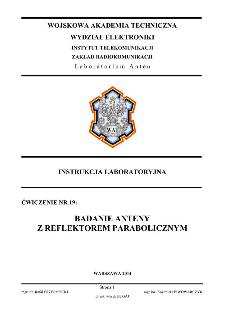 WOJSKOWA AKADEMIA TECHNICZNA WYDZIAŁ ELEKTRONIKI INSTYTUT TELEKOMUNIKACJI ZAKŁAD RADIOKOMUNIKACJI Laboratorium Anten INSTRUKCJA LABORATORYJNA ĆWICZENIE NR 19: BADANIE ANTENY Z REFLEKTOREM PARABOLICZNYM WARSZAWA 2014 Strona 1 mgr inż. Rafał PRZESMYCKI mgr inż. Kazimierz PIWOWARCZYK dr inż. Marek BUGAJ LABORATORIUM ANTEN Instrukcja do ćwiczenia laboratoryjnego nr 19 BADANIE ANTENY Z REFLEKTOREM PARABOLICZNYM Instrukcja opracowana na potrzeby Laboratorium Anten Zakładu Radiokomunikacji Opracowanie wykonane przez: mgr. inż. Rafała Przesmyckiego mgr. inż. Kazimierza Piwowarczyka dr. inż. Marka Bugaja Niniejsza instrukcja wykonana została dla studentów WAT realizujących w ramach programów studiów ćwiczenia laboratoryjne z przedmiotów Anteny i propagacja fal 1 oraz Anteny i propagacja fal 2 Instrukcja nie może być powielana do celów innych niż dydaktyczne. Wszelkie pytania dotyczące instrukcji i ćwiczeń laboratoryjnych wykonywanych w Laboratorium Anten ZR kierować należy na adresy: [email protected] [email protected] [email protected] Wydanie 7 luty 2014r. Strona 2 mgr inż. Rafał PRZESMYCKI mgr inż. Kazimierz PIWOWARCZYK dr inż. Marek BUGAJ LABORATORIUM ANTEN Instrukcja do ćwiczenia laboratoryjnego nr 19 BADANIE ANTENY Z REFLEKTOREM PARABOLICZNYM Przepisy BHP obowiązujące w laboratorium 1. 2. 3. 4. Przy pracy z urządzeniami mikrofalowymi należy: sprowadzać do minimum czas przebywania w strefie pola elektromagnetycznego, zezwalać na przebywanie w pracowniach osób nie zajętych bezpośrednio pracą z urządzeniami mikrofalowymi wówczas gdy: pracują generatory małej mocy, osoby te nie znajdują się w strefie działania pola elektromagnetycznego stosować w miarę możliwości urządzenia mikrofalowe małej mocy (tłumienie sygnału wyjściowego powinno być możliwie maksymalne w danych warunkach pomiarowych) stosować środki ochronne zabezpieczające wykonujących pomiary przed opromieniowaniem ( sztuczne obciążenie, ekrany stanowisk pomiarowych itp.) W czasie pracy urządzeń mikrofalowych ZABRANIA SIĘ: przebywać w pracowniach osobom nie związanym bezpośrednio z praca urządzeń mikrofalowych, oglądać otwarte końce falowodów, elementów promieniujących reflektorów, anten, połączeń torów falowodowych oraz innych źródeł promieniowania, wykonywać prace przy układach antenowo-przesyłowych, zdejmować lub otwierać elementy ekranujące urządzeń mikrofalowych, przekraczać następujących wartości średniej gęstości pola elektromagnetycznego: gęstość do 10µW/cm2, przy której czas pracy lub przebywania w tym polu nie podlega ograniczeniu, gęstość od 10 do 100 µW/cm2, przy której łączny czas pracy lub przebywania w tym polu nie może przekraczać 2 godzin na dobę w przypadku pracy bez środka ochrony osobistej, gęstość od 100 do 1000 µW/cm2, przy której łączny czas pracy lub przebywania w tym polu nie może przekraczać 20 minut na dobę w przypadku pracy bez środków ochrony osobistej z zabezpieczeniem jednak narządów wzroku, dopuszczać młodocianych, kobiety w ciąży oraz osoby ze schorzeniami, których stan zdrowia pod wpływem pola elektromagnetycznego może ulec pogorszeniu, opromieniowywać inne stanowiska pracy. Przy pracy z urządzeniami elektrycznymi należy: przestrzegać przepisów dotyczących uziemienia i zerowania urządzeń stałych i przenośnych, dopuszczać do przeglądów czynnych urządzeń elektrycznych tylko: osoby obsługujące urządzenie, osoby o wymaganych kwalifikacjach tylko w obecności personelu obsługującego względnie osób upoważnionych przez przełożonych, posługiwać się sprzętem ochronno-izolacyjnym przed porażeniem, dbać o dobry stan izolacji i czystości oczadzeń elektrycznych w przypadku wystąpienia nieszczęśliwego wypadku powiadomić prowadzącego oraz w razie potrzeby odpowiednie służby, przestrzegać dodatkowych zarządzeń i przepisów nie ujętych w niniejszej instrukcji. W czasie pracy z urządzeniami elektrycznymi ZABRANIA SIĘ: dopuszczać do urządzeń elektrycznych osoby nie spełniające wymagań kwalifikacyjnych i zdrowotnych BHP, sprzątanie pomieszczeń może odbywać się tylko pod nadzorem osób za nie odpowiedzialnych, wykonywać czynności łączeniowe w sieci energetycznej bez zgody przełożonych i nadzoru, dotykać urządzeń pod napięciem, posługiwać się urządzeniami uszkodzonymi, w nieprzepisowej obudowie, względnie zainstalowanymi niezgodnie z przepisami, naprawiać uszkodzonych bezpieczników, bezpieczniki uszkodzone należy zastępować nowymi o właściwej wartości dopuszczalnego prądu. Strona 3 mgr inż. Rafał PRZESMYCKI mgr inż. Kazimierz PIWOWARCZYK dr inż. Marek BUGAJ LABORATORIUM ANTEN Instrukcja do ćwiczenia laboratoryjnego nr 19 BADANIE ANTENY Z REFLEKTOREM PARABOLICZNYM 1 CEL ĆWICZENIA Celem wykonania pomiarów jest sprawdzenie czy zaprojektowana bądź eksploatowana antena posiada założone parametry. Podstawowym zadaniem pomiarów antenowych jest pomiar charakterystyk i parametrów elektrycznych lub też wielkości będących danymi wyjściowymi do ich obliczenia. Celem ćwiczenia jest zapoznanie studentów z budową oraz podstawowymi charakterystykami anten z reflektorem parabolicznym. 2 PRZYGOTOWANIE STUDENTÓW DO ĆWICZENIA Przed przystąpieniem do ćwiczenia laboratoryjnego studenci powinni opanować niezbędny zakres wiadomości dotyczący: definicji podstawowych parametrów i charakterystyk anten (kierunkowość, zysk energetyczny, długość skuteczna, powierzchnia skuteczna, impedancja wejściowa, pasmo pracy anteny, charakterystyka promieniowania, WFS), teoretycznych charakterystyk anten parabolicznych, ich budowy i zasady działania, podstawowych zalet i wad, zastosowania, rodzajów reflektorów, metod i warunków realizacji pomiaru charakterystyk promieniowania anten. 3 ZAKRES ĆWICZENIA Podczas ćwiczenia laboratoryjnego należy zrealizować pomiar charakterystyk promieniowania anteny z refle