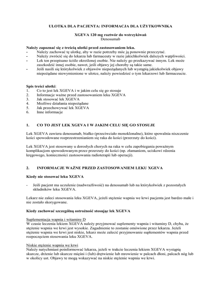 ULOTKA DLA PACJENTA: INFORMACJA DLA UŻYTKOWNIKA XGEVA 120 mg roztwór do wstrzykiwań Denosumab Należy zapoznać się z treścią ulotki przed zastosowaniem leku. Należy zachować tę ulotkę, aby w razie potrzeby móc ją ponownie przeczytać. Należy zwrócić się do lekarza lub farmaceuty w razie jakichkolwiek dalszych wątpliwości. Lek ten przepisano ściśle określonej osobie. Nie należy go przekazywać innym. Lek może zaszkodzić innej osobie, nawet, jeśli objawy jej choroby są takie same. Jeśli nasili się którykolwiek z objawów niepożądanych lub wystąpią jakiekolwiek objawy niepożądane niewymienione w ulotce, należy powiedzieć o tym lekarzowi lub farmaceucie. Spis treści ulotki: 1. Co to jest lek XGEVA i w jakim celu się go stosuje 2. Informacje ważne przed zastosowaniem leku XGEVA 3. Jak stosować lek XGEVA 4. Możliwe działania niepożądane 5. Jak przechowywać lek XGEVA 6. Inne informacje 1. CO TO JEST LEK XGEVA I W JAKIM CELU SIĘ GO STOSUJE Lek XGEVA zawiera denosumab, białko (przeciwciało monoklonalne), które spowalnia niszczenie kości spowodowane rozprzestrzenianiem się raka do kości (przerzuty do kości). Lek XGEVA jest stosowany u dorosłych chorych na raka w celu zapobiegania poważnym komplikacjom spowodowanym przez przerzuty do kości (np. złamaniom, uciskowi rdzenia kręgowego, konieczności zastosowania radioterapii lub operacji). 2. INFORMACJE WAŻNE PRZED ZASTOSOWANIEM LEKU XGEVA Kiedy nie stosować leku XGEVA - Jeśli pacjent ma uczulenie (nadwrażliwość) na denosumab lub na którykolwiek z pozostałych składników leku XGEVA. Lekarz nie zaleci stosowania leku XGEVA, jeżeli stężenie wapnia we krwi pacjenta jest bardzo małe i nie zostało skorygowane. Kiedy zachować szczególną ostrożność stosując lek XGEVA Suplementacja wapnia i witaminy D W czasie leczenia lekiem XGEVA należy przyjmować suplementy wapnia i witaminy D, chyba, że stężenie wapnia we krwi jest wysokie. Zagadnienie to zostanie omówione przez lekarza. Jeżeli stężenie wapnia we krwi jest niskie, lekarz może zalecić przyjmowanie suplementów wapnia przed rozpoczęciem stosowania leku XGEVA. Niskie stężenie wapnia we krwi Należy natychmiast poinformować lekarza, jeżeli w trakcie leczenia lekiem XGEVA wystąpią skurcze, drżenie lub skurcze mięśni i (lub) drętwienie lub mrowienie w palcach dłoni, palcach nóg lub w okolicy ust. Objawy te mogą wskazywać na niskie stężenie wapnia we krwi. Należy poinformować lekarza o występujących obecnie lub w przeszłości poważnych problemach z nerkami, o niewydolności nerek lub dializoterapii, które mogą zwiększać ryzyko obniżenia stężenia wapnia we krwi, jeżeli pacjent nie przyjmuje suplementów wapnia. Problemy związane z jamą ustną, zębami lub szczęką Należy natychmiast poinformować lekarza i dentystę, jeżeli w trakcie leczenia lekiem XGEVA wystąpią problemy związane z jamą ustną lub zębami, takie jak ruszające się zęby, ból lub opuchnięcie. Pacjenci w trakcie chemioterapii, przyjmujący steroidy, w trakcie zabiegów stomatologicznych lub pacjenci, którzy nie są objęci rytunową opieką stomatologiczną lub mają choroby dziąseł, narażeni są na zwiększone ryzyko wystąpienia problemów dotyczących szczęki. Ważne jest utrzymywanie właściwej higieny jamy ustnej podczas leczenia lekiem XGEVA. Lekarz zadecyduje o przeprowadzeniu badania stomatologicznego przed rozpoczęciem leczenia lekiem XGEVA. Pacjenci będący w trakcie leczenia stomatologicznego lub planujący zabieg stomatologiczny powinni poinformować swojego dentystę o stosowaniu leku XGEVA. Zakażenia skóry Należy natychmiast poinformować lekarza, jeśli w trakcie leczenia lekiem XGEVA wystąpi obrzęk i zaczerwienienie skóry, które jest ciepłe i tkliwe uciskowo (zapalenie tkanki łącznej), któremu może towarzyszyć gorączka oraz dreszcze. Dzieci i młodzież Lek XGEVA nie jest zalecany do stosowania u dzieci i młodzieży w wieku poniżej 18 lat. Nie badano stosowania leku XGEVA u dzieci i młodzieży. Stosowanie innych leków Należy powiedzieć lekarzowi lub farmaceucie o wszystkich przyjmowanych aktualnie lub ostatnio lekach, również tych, które wydawane są bez recepty. Szczególnie ważne jest poinformowanie lekarza o przyjmowaniu : • innych leków zawierających denosumab • bisfosfonianów Leku XGEVA nie należy przyjmować z innymi lekami zawierającymi denosumab lub z bisfosfonianami. Ciąża i karmienie piersią Lek XGEVA nie był badany u kobiet w ciąży. Ważne jest, by pacjentka poinformowała lekarza, jeśli jest w ciąży, podejrzewa, że może być w ciąży lub planuje ciążę. Lek XGEVA nie jest zalecany do stosowania u kobiet w ciąży. Kobiety w wieku rozrodczym przyjmujące lek XGEVA powinny stosować skuteczne metody antykoncepcyjne. Nie wiadomo, czy lek XGEVA przenika do mleka kobiet karmiących piersią. Ważne jest, by poinformować lekarza, jeśli pacjentka karmi piersią lub planuje karmić piersią. Wówczas lekarz prowadzący pomoże zdecydować pacjentce, czy powinna zaprzestać karmienia piersią, czy przerwać stosowanie leku XGEVA, rozważywszy korzyści z karmienia piersią dla dziecka oraz korzyści z przyjmowania leku XGEVA dla matki. Przed zastosowaniem jakiegokolwiek leku należy poradzić się lekarza lub farmaceuty. Prowadzenie pojazdów i obsługiwanie maszyn XGEVA nie ma wpływu lub wywiera nieistotny wpływ na zdolność prowadzenia pojazdów i obsługiwania maszyn. Ważne informacje o niektórych składnikach leku XGEVA Jeśli pacjent ma nietolerancję na niektóre cukry Jeśli lekarz poinformował pacjenta, że występuje u niego nietolerancja na niektóre cukry, przed zastosowaniem tego leku należy skontaktować się z lekarzem, ponieważ zawiera on sorbitol (E420). Jeśli pacjent stosuje dietę z kontrolowaną podażą sodu Ten lek zawiera mniej niż 1 mmol sodu (23 mg) na 120 mg, tzn. że jest w zasadzie „wolny od zawartoś