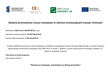 Badania przemysłowe i prace rozwojowe w zakresie innowacyjnych maszyn rolniczych Beneficjent: R&D Centre INVENTOR Sp. z o.o. Całkowita wartość projektu: 18 440 958,00 PLN Wartość dofinansowania: 7 067 813,00 PLN Projekt współfinansowany przez Unię Europejską ze środków Europejskiego Funduszu Rozwoju Regionalnego w ramach Programu Operacyjnego Innowacyjna Gospodarka, lata 2007-2013, Priorytet 1. Badania i rozwój nowoczesnych technologii, Działanie 1.4. Wsparcie projektów celowych Informacje na temat programu: http://www.ncbir.pl/ "Dotacje na innowacje. Inwestujemy w Waszą przyszłość."