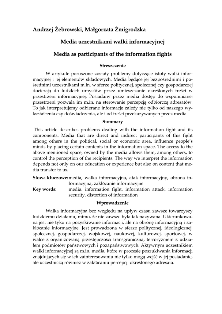 Andrzej Żebrowski, Małgorzata Żmigrodzka Media uczestnikami walki informacyjnej Media as participants of the information fights Streszczenie W artykule poruszone zostały problemy dotyczące istoty walki informacyjnej i jej elementów składowych. Media będące jej bezpośrednimi i pośrednimi uczestnikami m.in. w sferze politycznej, społecznej czy gospodarczej docierają do ludzkich umysłów przez umieszczanie określonych treści w przestrzeni informacyjnej. Posiadany przez media dostęp do wspomnianej przestrzeni pozwala im m.in. na sterowanie percepcją odbiorczą adresatów. To jak interpretujemy odbierane informacje zależy nie tylko od naszego wykształcenia czy doświadczenia, ale i od treści przekazywanych przez media. Summary This article describes problems dealing with the information fight and its components. Media that are direct and indirect participants of this fight among others in the political, social or economic area, influence people’s minds by placing certain contents in the information space. The access to the above mentioned space, owned by the media allows them, among others, to control the perception of the recipients. The way we interpret the information depends not only on our education or experience but also on content that media transfer to us. Słowa kluczowe: media, walka informacyjna, atak informacyjny, obrona informacyjna, zakłócanie informacyjne Key words: media, information fight, information attack, information security, distortion of information Wprowadzenie Walka informacyjna bez względu na upływ czasu zawsze towarzyszy ludzkiemu działaniu, mimo, że nie zawsze była tak nazywana. Ukierunkowana jest nie tyko na pozyskiwanie informacji, ale na obronę informacyjną i zakłócanie informacyjne. Jest prowadzona w sferze politycznej, ideologicznej, społecznej, gospodarczej, wojskowej, naukowej, kulturowej, sportowej, w walce z organizowaną przestępczości transgraniczna, terroryzmem z udziałem podmiotów państwowych i pozapaństwowych. Aktywnym uczestnikiem walki informacyjnej są m.in. media, które w procesie poszukiwania informacji znajdujących się w ich zainteresowaniu nie tylko mogą wejść w jej posiadanie, ale uczestniczą również w zakłócaniu percepcji określonego adresata. ______________Andrzej Żebrowski, Małgorzata Żmigrodzka_______________ W artykule został przedstawiona istota walki informacyjnej i jej elementy składowe, infrastruktura informacyjna wykorzystywana przez media, a także jeden z istotniejszych jej elementów, jakim jest zakłócanie informacyjne. Na uwagę zasługują media, jako bezpośredni uczestnicy walki informacyjnej, gdzie informacja stanowi towar, który można kupić i sprzedać. Istota walki informacyjnej Pozyskiwanie informacji, a także zakłócanie informacyjne i obrona informacyjna zawsze towarzyszyły ludzkiemu działaniu. W prowadzeniu tego rodzaju działalności nie używano pojęcia walka informacyjna, jednak w przeszłości zawsze towarzyszyła walce zbrojnej i dyplomacji. Niezależnie od tego czy była tak nazywana, czy nie zawsze ogrywa szczególna rolę. Takim przykładem są wojny, gdzie zwycięstwo w walce zbrojnej było możliwe w następstwie wygranej walce informacyjnej. Podmioty (np. państwa, siły zbrojne, partie polityczne, politycy, organizacje gospodarcze) będące w konflikcie zawsze dążyły do poznania zarówno słabych, jak i mocnych stron przeciwnika. Posiadając własne tajemnice ukrywały je przed nim, ale również wzajemnie się oszukiwały i wprowadzały w błąd. „Zrodził się zatem swoisty rodzaj walki – jedni, możliwymi dla siebie sposobami, dążyli do zdobywania informacji, a drudzy – z podobnym zaangażowaniem - starali się im to udaremnić. W postępowaniu tym wystąpiła sprzeczność celów i działań, czyli najbardziej dystynktywnych cech, które kojarzą się z desygnatem pojęcia walka. Przedmiotem tej walki stała się informacja, a narzędziami wszelkie środki dostosowane do jej zdobywania, zakłócania i obrony. Z takim wyobrażeniem desygnatu używa się dziś najczęściej pojęcia walka informacyjna.” 1 Walka informacyjna, to kooperacja negatywna wzajemna, przynajmniej dwupodmiotowa, realizowana w sferach: zdobywania informacji, zakłócania informacyjnego i obrony informacyjnej, gdzie każdemu działaniu jednej strony przyporządkowane jest działanie antagonistyczne strony drugiej 2. Według stanowiska dziekana Szkoły Wojny i Strategii Informacyjnej na Narodowym Uniwersytecie Obrony Stanów Zjednoczonych, na wojnę informacyjną składają się działania, których celem jest ochrona, wykorzystywanie, uszkodzenie, zniszczenie informacji lub zasobów informacji albo też zaprzeczenie informacjom po to, aby osiągnąć znaczne korzyści, jakiś cel lub zwycięstwo nad przeciwnikiem 3. „Z kolei według dyrektywy S – 3600 Biura Departamentu Obrony Stanów Zjednoczonych z grudnia 1996 roku, określa się wojnę informacyjną jako operacje informacyjne prowadzone podczas kryzysu lub konfliktu w celu osiągnięcia lub poparcia konkretnych celów w odL. Ciborowski, Walka informacyjna, Toruń 1996, s. 9. Ibidem, s. 187. 3 W. Schwartau, Information Warfare, 2nd ed., Thunder's Mouth Press, 1996, s.12. 1 2 358 _______________Media uczestnikami walki informacyjnej__________________ niesieniu do konkretnych przeciwników lub przeciwnika. Według tej samej dyrektywy operacje informacyjne są to działania podjęte w celu wywarcia wpływu na informacje i systemy informacyjne przeciwnika przy jednoczesnej obronie własnych informacji i systemów informacyjnych.” 4 Aktualnie walka informacyjna ma nieco inny charakter, ukierunkowana jest nie tylko na zdobywanie informacji o charakterze niejawnym. Jest prowadzona pomiędzy podmiotami sektora państwowego (prywatnego), gdzie strategie polityczne, marketingowe, reklamowe, konsumpcyjne, czy kooperacyjne stanowią obiekty szczególnego zainteresowania przeciwstawnych stron. Walka informac