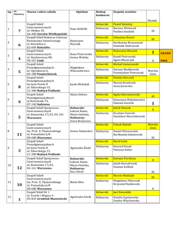 Lp. Nr Startowy 1 2 3 4 5 6 7 8 9 10 11 12 7 6 4 5 8 9 2 11 3 12 10 1 Nazwa i adres szkoły Zespół Szkół Gastronomicznych ul. Okólna 35, 66-400 Gorzów Wielkopolski Zespół Szkół Rolnicze Centrum Kształcenia Ustawicznego ul. Kościelna 2, 62-604 Kościelec Zespół Szkół Gastronomicznych ul. Sienkiewicza 88, 90-357 Łódź Zespół Szkół Ponadgimnazjalnych ul. Ogrodnicza 6, 05-180 Pomiechówek Zespół Szkół Ponadgimnazjalnych im Jana Pawła II ul. Sikorskiego 15, 21-300 Radzyń Podlaski Zespół Szkół Ponadgimnazjalnych ul Kościószki 74, 07-140 Sadowna Zespół Szkół SpożywczoGastronomicznych ul. Komorska 17/23, 04-161 Warszawa Zespół Szkół Gastronomicznych im. Prof.. E. Pijanowskiego ul. Poznańska 6/8 00-680 Warszawa Zespół Szkół Ponadgimnazjalnych im Jana Pawła II ul. Sikorskiego 15, 21-300 Radzyń Podlaski Zespół Szkół SpożywczoGastronomicznych ul. Komorska 17/23, 04-161 Warszawa Zespół Szkół Gastronomicznych im. Prof.. E. Pijanowskiego ul. Poznańska 6/8 00-680 Warszawa Zespół Szkół Nr 1 ul. Żwirki i Wigury 4 05-825 Grodzisk Mazowiecki Opiekun Piotr KISSON Katarzyna Hryciuk Ilona Pietrowska Iwona Wolska Magdalena Winczakiewicz Jacek Michalak Rodzaj konkursu Zespoły uczniów Kelnerski Kulinarny Paweł Kałużny Bartosz Wicherek Paulina Smolnik Kelnerski Kulinarny Kelnerski Kulinarny Kelnerski Kulinarny Kelnerski Kulinarny Maria Dobies Kelnerski Kelnerski: Łukasz Kania, Maria Osińska, Kulinarny: Irena Brzozowa Kelnerski Iwona Namysław Agnieszka Śledź Kelnerski: Łukasz Kania, Maria Osińska, Kulinarny: Ewa Olech Beata Kłos Agnieszka Siwik Kulinarny Kulinarny Kelnerski Kulinarny Kelnerski Kulinarny Kelnerski Kulinarny Kelnerski Kulinarny Kelnerski Kulinarny Sebastian Kmieć Bartłomiej Brzozowski Dominik Andruszak Katarzyna Kieszek Kamil Piotrowski Agata Błaszczyk Michał Gasiorowski Dariusz Bieńkowski Przemysław Pietraszak Natalia Siwczuk Maciej Strzelczyk Anna Jezierska Agata Karczmarczyk Katarzyna Maksimowicz Damian Sawicki Jakub Stasiuk Krystian Sawicki Stanisław Marcinkowski Patryk Ryński Daniel Warszawski Bartłomiej Sobolewski Karol Łuba Konrad Kozak Patrycja Kieler Dariusz Parobczy Jakub Kowalewski Damian Kołbuk Marcin Madejak Magdalena Miszczuk Krzysztof Kuklewski Joel Zawadzki Natalia Sypniewska Sandra Więckowska Wyniki III III I II Wyróżn ienie III I II Wyróżn ienie III II III III II GRAND PRIX
