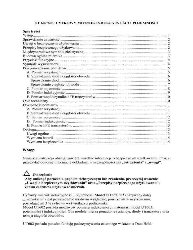 UT 602/603: CYFROWY MIERNIK INDUKCYJNOŚCI I POJEMNOŚCI Spis treści Wstęp.......................................................................................................................................... 1 Sprawdzanie zawartości ............................................................................................................. 2 Uwagi o bezpiecznym uŜytkowaniu .......................................................................................... 2 Przepisy bezpiecznego uŜytkowania .......................................................................................... 2 Międzynarodowe symbole elektryczne ...................................................................................... 3 Budowa ogólna miernika ........................................................................................................... 3 Przyciski funkcyjne .................................................................................................................... 4 Symbole wyświetlacza ............................................................................................................... 4 Przeprowadzanie pomiarów ....................................................................................................... 5 A. Pomiar rezystancji ............................................................................................................. 5 B. Sprawdzanie diod i ciągłości obwodu ............................................................................... 6 Sprawdzanie diod ............................................................................................................... 6 Sprawdzanie ciągłości obwodu .......................................................................................... 7 C. Pomiar pojemności ............................................................................................................ 8 D. Pomiar indukcyjności ........................................................................................................ 9 E. Pomiar współczynnika hFE tranzystorów ....................................................................... 10 Opis techniczny ........................................................................................................................ 10 Dokładność pomiarów.............................................................................................................. 11 A. Pomiar rezystancji ........................................................................................................... 11 B. Sprawdzanie diod i ciągłości obwodu ............................................................................. 11 C. Pomiar pojemności .......................................................................................................... 12 D. Pomiar indukcyjności: .................................................................................................... 12 E. Pomiar hFE tranzystorów: ............................................................................................... 13 Obsługa..................................................................................................................................... 13 Uwagi ogólne ....................................................................................................................... 13 Wymiana baterii ................................................................................................................... 14 Wymiana bezpiecznika ........................................................................................................ 14 Wstęp Niniejsza instrukcja obsługi zawiera wszelkie informacje o bezpiecznym uŜytkowaniu. Proszę przeczytać odnośne informacje dokładnie, w szczególności zaś „ostrzeŜenia” i „uwagi”. ! OstrzeŜenie Aby uniknąć poraŜenia prądem elektrycznym lub zranienia, przeczytaj uwaŜnie „Uwagi o bezpiecznym uŜytkowaniu” oraz „Przepisy bezpiecznego uŜytkowania”, zanim zaczniesz uŜytkować miernik. Cyfrowy miernik indukcyjności i pojemności Model UT602/603 (nazywany dalej „miernikiem”) jest przyrządem o modnym wyglądzie, poręcznym w uŜytkowaniu, posiadającym 3 ½ cyfrowy wyświetlacz z podtrzymką. Model UT602 posiada moŜliwość pomiaru indukcyjności, natomiast model UT603, pojemności i indukcyjności. Oba modele mierzą ponadto rezystancję, diody i tranzystory oraz testują ciągłość obwodów. UT602 posiada ponadto funkcję podtrzymywania ostatniego wskazania Data Hold. Sprawdzanie zawartości Otwórz pudełko i wyjmij z niego miernik. Sprawdź, czy niŜej wymienione przedmioty znajdują się w opakowaniu i czy nie są uszkodzone: Lp 1 2 3 Nazwa przedmiotu Instrukcja obsługi Przewody pomiarowe (klipsy) Bateria 9V 6F22 (NEDA 1204 lub006P) (zainstalowana) Ilość 1 sztuka 1 komplet 1 sztuka W przypadku stwierdzenia jakichkolwiek braków lub uszkodzeń skontaktuj się niezwłocznie ze sprzedawcą. Uwagi o bezpiecznym uŜytkowaniu Miernik ten spełnia wszystkie standardy EMC EN61326. UŜywaj miernik wyłącznie zgodnie z niniejszą instrukcją obsługi, gdyŜ w przeciwnym razie zabezpieczenia jakie posiada miernik, mogą nie zadziałać. W niniejszej instrukcji słowo „OstrzeŜenie” zwraca uwagę na warunki i czynności, w których moŜe dojść do poraŜenia prądem elektrycznym, uszkodzenia miernika lub testowanego sprzętu. Słowo „Uwaga” dostarcza informacji, na co uŜytkownik powinien zwrócić szczególną uwagę podczas czynności pomiarowych. Przepisy bezpiecznego uŜytkowania ! OstrzeŜenie Aby uniknąć poraŜenia prądem elektrycznym lub uszkodzeń ciała, oraz aby uniknąć moŜliwości uszkodzenia miernika lub testowanego urządzenia, naleŜy przestrzegać poniŜszych zasad: Przed uŜyciem sprawdź obudową miernika czy, nie ma jakichś uszkodzeń mechanicznych, czy jest zamknięta i skręcona wkrętami. Obejrzyj obudowę czy nie ma szczelin lub ubytków plastiku
