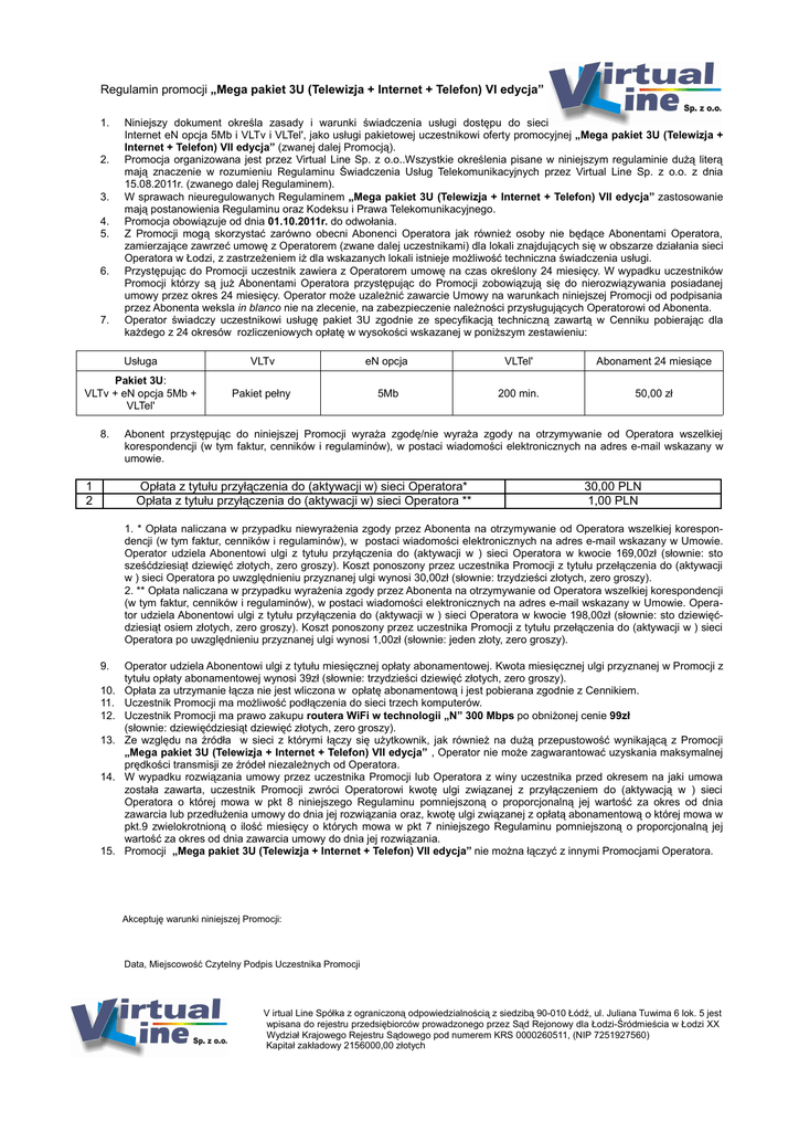 Regulamin promocji „Mega pakiet 3U (Telewizja + Internet + Telefon) VI edycja” 1. 2. 3. 4. 5. 6. 7. Niniejszy dokument określa zasady i warunki świadczenia usługi dostępu do sieci Internet eN opcja 5Mb i VLTv i VLTel', jako usługi pakietowej uczestnikowi oferty promocyjnej „Mega pakiet 3U (Telewizja + Internet + Telefon) VII edycja” (zwanej dalej Promocją). Promocja organizowana jest przez Virtual Line Sp. z o.o..Wszystkie określenia pisane w niniejszym regulaminie dużą literą mają znaczenie w rozumieniu Regulaminu Świadczenia Usług Telekomunikacyjnych przez Virtual Line Sp. z o.o. z dnia 15.08.2011r. (zwanego dalej Regulaminem). W sprawach nieuregulowanych Regulaminem „Mega pakiet 3U (Telewizja + Internet + Telefon) VII edycja” zastosowanie mają postanowienia Regulaminu oraz Kodeksu i Prawa Telekomunikacyjnego. Promocja obowiązuje od dnia 01.10.2011r. do odwołania. Z Promocji mogą skorzystać zarówno obecni Abonenci Operatora jak również osoby nie będące Abonentami Operatora, zamierzające zawrzeć umowę z Operatorem (zwane dalej uczestnikami) dla lokali znajdujących się w obszarze działania sieci Operatora w Łodzi, z zastrzeżeniem iż dla wskazanych lokali istnieje możliwość techniczna świadczenia usługi. Przystępując do Promocji uczestnik zawiera z Operatorem umowę na czas określony 24 miesięcy. W wypadku uczestników Promocji którzy są już Abonentami Operatora przystępując do Promocji zobowiązują się do nierozwiązywania posiadanej umowy przez okres 24 miesięcy. Operator może uzależnić zawarcie Umowy na warunkach niniejszej Promocji od podpisania przez Abonenta weksla in blanco nie na zlecenie, na zabezpieczenie należności przysługujących Operatorowi od Abonenta. Operator świadczy uczestnikowi usługę pakiet 3U zgodnie ze specyfikacją techniczną zawartą w Cenniku pobierając dla każdego z 24 okresów rozliczeniowych opłatę w wysokości wskazanej w poniższym zestawieniu: Usługa VLTv eN opcja VLTel' Abonament 24 miesiące Pakiet 3U: VLTv + eN opcja 5Mb + VLTel' Pakiet pełny 5Mb 200 min. 50,00 zł 8. 1 2 Abonent przystępując do niniejszej Promocji wyraża zgodę/nie wyraża zgody na otrzymywanie od Operatora wszelkiej korespondencji (w tym faktur, cenników i regulaminów), w postaci wiadomości elektronicznych na adres e-mail wskazany w umowie. Opłata z tytułu przyłączenia do (aktywacji w) sieci Operatora* Opłata z tytułu przyłączenia do (aktywacji w) sieci Operatora ** 30,00 PLN 1,00 PLN 1. * Opłata naliczana w przypadku niewyrażenia zgody przez Abonenta na otrzymywanie od Operatora wszelkiej korespondencji (w tym faktur, cenników i regulaminów), w postaci wiadomości elektronicznych na adres e-mail wskazany w Umowie. Operator udziela Abonentowi ulgi z tytułu przyłączenia do (aktywacji w ) sieci Operatora w kwocie 169,00zł (słownie: sto sześćdziesiąt dziewięć złotych, zero groszy). Koszt ponoszony przez uczestnika Promocji z tytułu przełączenia do (aktywacji w ) sieci Operatora po uwzględnieniu przyznanej ulgi wynosi 30,00zł (słownie: trzydzieści złotych, zero groszy). 2. ** Opłata naliczana w przypadku wyrażenia zgody przez Abonenta na otrzymywanie od Operatora wszelkiej korespondencji (w tym faktur, cenników i regulaminów), w postaci wiadomości elektronicznych na adres e-mail wskazany w Umowie. Operator udziela Abonentowi ulgi z tytułu przyłączenia do (aktywacji w ) sieci Operatora w kwocie 198,00zł (słownie: sto dziewięćdziesiąt osiem złotych, zero groszy). Koszt ponoszony przez uczestnika Promocji z tytułu przełączenia do (aktywacji w ) sieci Operatora po uwzględnieniu przyznanej ulgi wynosi 1,00zł (słownie: jeden złoty, zero groszy). 9. 10. 11. 12. 13. 14. 15. Operator udziela Abonentowi ulgi z tytułu miesięcznej opłaty abonamentowej. Kwota miesięcznej ulgi przyznanej w Promocji z tytułu opłaty abonamentowej wynosi 39zł (słownie: trzydzieści dziewięć złotych, zero groszy). Opłata za utrzymanie łącza nie jest wliczona w opłatę abonamentową i jest pobierana zgodnie z Cennikiem. Uczestnik Promocji ma możliwość podłączenia do sieci trzech komputerów. Uczestnik Promocji ma prawo zakupu routera WiFi w technologii „N” 300 Mbps po obniżonej cenie 99zł (słownie: dziewięćdziesiąt dziewięć złotych, zero groszy). Ze względu na źródła w sieci z którymi łączy się użytkownik, jak również na dużą przepustowość wynikającą z Promocji „Mega pakiet 3U (Telewizja + Internet + Telefon) VII edycja” , Operator nie może zagwarantować uzyskania maksymalnej prędkości transmisji ze źródeł niezależnych od Operatora. W wypadku rozwiązania umowy przez uczestnika Promocji lub Operatora z winy uczestnika przed okresem na jaki umowa została zawarta, uczestnik Promocji zwróci Operatorowi kwotę ulgi związanej z przyłączeniem do (aktywacją w ) sieci Operatora o której mowa w pkt 8 niniejszego Regulaminu pomniejszoną o proporcjonalną jej wartość za okres od dnia zawarcia lub przedłużenia umowy do dnia jej rozwiązania oraz, kwotę ulgi związanej z opłatą abonamentową o której mowa w pkt.9 zwielokrotnioną o ilość miesięcy o których mowa w pkt 7 niniejszego Regulaminu pomniejszoną o proporcjonalną jej wartość za okres od dnia zawarcia umowy do dnia jej rozwiązania. Promocji „Mega pakiet 3U (Telewizja + Internet + Telefon) VII edycja” nie można łączyć z innymi Promocjami Operatora. Akceptuję warunki niniejszej Promocji: Data, Miejscowość Czytelny Podpis Uczestnika Promocji V irtual Line Spółka z ograniczoną odpowiedzialnością z siedzibą 90-010 Łódź, ul. Juliana Tuwima 6 lok. 5 jest wpisana do rejestru przedsiębiorców prowadzonego przez Sąd Rejonowy dla Łodzi-Śródmieścia w Łodzi XX Wydział Krajowego Rejestru Sądowego pod numerem KRS 0000260511, (NIP 7251927560) Kapitał zakładowy 2156000,00 złotych