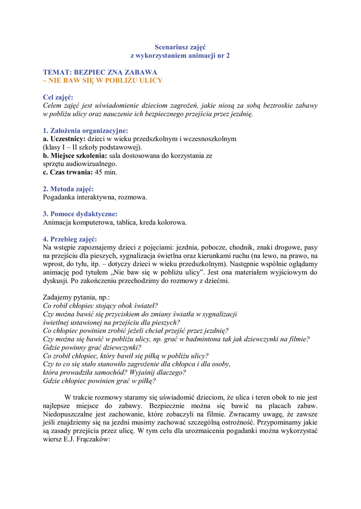 Scenariusz zajęć z wykorzystaniem animacji nr 2 TEMAT: BEZPIEC ZNA ZABAWA – NIE BAW SIĘ W POBLIŻU ULICY Cel zajęć: Celem zajęć jest uświadomienie dzieciom zagrożeń, jakie niosą za sobą beztroskie zabawy w pobliżu ulicy oraz nauczenie ich bezpiecznego przejścia przez jezdnię. 1. Założenia organizacyjne: a. Uczestnicy: dzieci w wieku przedszkolnym i wczesnoszkolnym (klasy I – II szkoły podstawowej). b. Miejsce szkolenia: sala dostosowana do korzystania ze sprzętu audiowizualnego. c. Czas trwania: 45 min. 2. Metoda zajęć: Pogadanka interaktywna, rozmowa. 3. Pomoce dydaktyczne: Animacja komputerowa, tablica, kreda kolorowa. 4. Przebieg zajęć: Na wstępie zapoznajemy dzieci z pojęciami: jezdnia, pobocze, chodnik, znaki drogowe, pasy na przejściu dla pieszych, sygnalizacja świetlna oraz kierunkami ruchu (na lewo, na prawo, na wprost, do tyłu, itp. – dotyczy dzieci w wieku przedszkolnym). Następnie wspólnie oglądamy animację pod tytułem „Nie baw się w pobliżu ulicy”. Jest ona materiałem wyjściowym do dyskusji. Po zakończeniu przechodzimy do rozmowy z dziećmi. Zadajemy pytania, np.: Co robił chłopiec stojący obok świateł? Czy można bawić się przyciskiem do zmiany światła w sygnalizacji świetlnej ustawionej na przejściu dla pieszych? Co chłopiec powinien zrobić jeżeli chciał przejść przez jezdnię? Czy można się bawić w pobliżu ulicy, np. grać w badmintona tak jak dziewczynki na filmie? Gdzie powinny grać dziewczynki? Co zrobił chłopiec, który bawił się piłką w pobliżu ulicy? Czy to co się stało stanowiło zagrożenie dla chłopca i dla osoby, która prowadziła samochód? Wyjaśnij dlaczego? Gdzie chłopiec powinien grać w piłkę? W trakcie rozmowy staramy się uświadomić dzieciom, że ulica i teren obok to nie jest najlepsze miejsce do zabawy. Bezpiecznie można się bawić na placach zabaw. Niedopuszczalne jest zachowanie, które zobaczyli na filmie. Zwracamy uwagę, że zawsze jeśli znajdziemy się na jezdni musimy zachować szczególną ostrożność. Przypominamy jakie są zasady przejścia przez ulicę. W tym celu dla urozmaicenia pogadanki można wykorzystać wiersz E.J. Frączaków: Kto zamierza przejść ulicę musi poznać tajemnicę: Na chodniku przystań bokiem. Popatrz w lewo bystrym okiem. Skieruj w prawo wzrok sokoli. Znów na lewo spójrz powoli. Jezdnia wolna – więc swobodnie mogą przez nią przejść przechodnie. Mówiąc o przejściu przez jezdnię wskazujmy gdzie powinniśmy przez nią przechodzić, tj.: • na przejściach dla pieszych oznaczonych specjalnym znakiem, • na przejściach, na których namalowane są białe, poprzeczne pasy zwane „zebrą”, • na przejściach z sygnalizacją świetlną. Nawiązując do sygnalizacji świetlnej zadajemy dzieciom zagadkę: Kiedy można przejść na drugą stronę ulicy? Kiedy światło jest ...................... (zielone) Powtarzamy kolory jakich używa się w sygnalizacji świetlnej i pokazujemy lub rysujemy na tablicy, jak wyglądają sygnalizatory. Sygnalizacja świetlna do kierowania ruchem używa świateł o kolorach: czerwony, żółty i zielony, zaś sygnalizacja dla pieszych używa świateł: czerwonego i zielonego. Sygnalizator z sygnałami do kierowania ruchem Sygnał Czerwony - zakaz wjazdu na skrzyżowanie. Sygnał Żółty - uwaga Sygnał Zielony - zezwala kierującemu na wjazd na skrzyżowanie Sygnalizator z sygnałami tylko dla pieszych Sygnał Czerwony - stój Sygnał Zielony – idź W celu lepszego zapoznania się z zasadami dotyczącymi przechodzenia przez jezdnię, wskazujemy, czego nie wolno robić pieszemu, tj.: • wchodzić na jezdnię bezpośrednio przed nadjeżdżającym pojazdem (nawet na przejściu dla pieszych), • wchodzić na jezdnię zza pojazdu lub przeszkody ograniczającej widoczność drogi, • przechodzić przez jezdnię w miejscu ograniczonej widoczności lub w pobliżu takiego miejsca, (np. na zakrętach, wierzchołkach wzniesień), • przebiegać przez jezdnię (nawet w miejscach wyznaczonych dla pieszych), • zatrzymywać się na jezdni lub bez uzasadnionej przyczyny zwalniać kroku podczas przechodzenia przez ulicę, • przechodzić przez jezdnię w miejscach, w których umieszczone są urządzenia zabezpieczające (np. barierki, łańcuchy oddzielające drogę dla pieszych lub chodnik od jezdni, nawet jeśli są po drugiej stronie drogi). Możemy także, zwłaszcza gdy rozmawiamy ze starszymi dziećmi omówić znaki drogowe z jakimi dzieci mogą się spotkać podczas przechodzenia przez jezdnię, tj.: Znaki ostrzegawcze Przejście dla pieszych Ostrzega o zbliżaniu się do przejścia dla pieszych. Uwaga dzieci Ostrzega o miejscu na drodze często uczęszczanym przez dzieci. Znak ten ustawiany jest w sąsiedztwie szkół, przedszkoli itp. Kierujący pojazdem, widząc ten znak, powinien zachować szczególną ostrożność. Sygnały świetlne Ostrzega o zbliżaniu się do miejsca, w którym ruch drogowy jest kierowany za pomocą sygnalizacji świetlnej, która może nie być widoczna zawczasu. Znaki informacyjne T-27 (Agatka). Tabliczka wskazująca, że przejście dla pieszych jest szczególnie uczęszczane przez dzieci. Miejsce przejścia dla pieszych. Informuje o miejscu przeznaczonym do przechodzenia pieszych przez jezdnię bądź torowisko. Powierzchnia przejścia dla pieszych może być oznaczona poziomym znakiem drogowym. Przejście dla pieszych lub dwiema liniami w poprzek jezdni. Na obszarze zabudowanym razem z tym znakiem może występować tabliczka dodatkowa Agatka. Przejście dla pieszych i przejazd dla rowerzystów. Oznacza miejsce przeznaczone do przechodzenia pieszych oraz przejeżdżania rowerzystów przez jezdnię. Na obszarze zabudowanym, razem z tym znakiem może występować tabliczka dodatkowa Agatka. Znaki zakazu Zakaz ruchu pieszych. Znak ten oznacza, iż droga jest zamknięta dla pieszych. Znaki nakazu Droga dla pieszych Wskazuje drogę przeznaczoną tylko dla pieszy