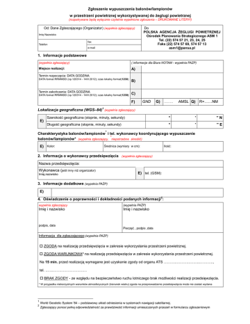 Zgłoszenie wypuszczenia balonów/lampionów w przestrzeni powietrznej wykorzystywanej do żeglugi powietrznej (rozpatrywane będą wyłącznie czytelnie wypełnione zgłoszenia – DRUKOWANE LITERY!) Od: Dane Zgłaszającego (Organizator) (wypełnia zgłaszający) Do POLSKA AGENCJA ŻEGLUGI POWIETRZNEJ Ośrodek Planowania Strategicznego ASM 1 Tel. (22) 574 57 21, 23, 24, 25 Faks (22) 574 57 69, 574 57 13 [email protected] Imię Nazwisko fax Telefon e-mail 1. Informacje podstawowe (wypełnia zgłaszający) ( informacje dla Biura NOTAM - wypełnia PAZP) Miejsce realizacji: A) Termin rozpoczęcia: DATA GODZINA DATA format RRMMDD (np.120314 - 14III 2012); czas lokalny format(1230) Termin zakończenia: DATA GODZINA DATA format RRMMDD (np.120314 - 14III 2012); czas lokalny format(1230) B) C) GND F) G) ……… AMSL Q) R=……NM Lokalizacja geograficzna (WGS–84)1 (wypełnia zgłaszający) E) Szerokość geograficzna (stopnie, minuty, sekundy) ° ' '' N Długość geograficzna (stopnie, minuty, sekundy) ° ' '' E * Charakterystyka balonów/lampionów i tel. wykonawcy koordynującego wypuszczenie * balonów/lampionów* (wypełnia zgłaszający, niepotrzebne skreślić) E) Kolor: Średnica (wymiary w cm): Ilość: 2. Informacja o wykonawcy przedsięwzięcia (wypełnia zgłaszający) Nazwa przedsięwzięcia: Wykonawca (jeśli inny niż organizator) Imię,nazwisko E) tel. (GSM): 3. Informacje dodatkowe (wypełnia PAŻP) E) 4. Oświadczenie o poprawności i dokładności podanych informacji2: wypełnia zgłaszający (wypełnia PAŻP) Imię i nazwisko Imię i nazwisko podpis, data Pieczęć , podpis ,data Informacja dla zgłaszającego:(wypełnia PAZP) ZGODA na realizację przedsięwzięcia w zakresie wykorzystania przestrzeni powietrznej. ZGODA WARUNKOWA* na realizację przedsięwzięcia w zakresie wykorzystania przestrzeni powietrznej. Na 15 min. przed realizacją wymagane jest uzyskanie zgody od organu ATS ………..………..……...……….., tel. ..…..…………………….… BRAK ZGODY - ze względu na bezpieczeństwo ruchu lotniczego brak możliwości realizacji przedsięwzięcia. * W przypadku niekorzystnych warunków atmosferycznych (kierunek wiatru) zgoda na przeprowadzenie przedsięwzięcia może nie zostać wydana 1 2 World Geodetic System '84 – podstawowy układ odniesienia w systemach nawigacji satelitarnej. Zgłaszający ponosi pełną odpowiedzialność za prawdziwość informacji umieszczonych przezeń w formularzu zgłoszeniowym