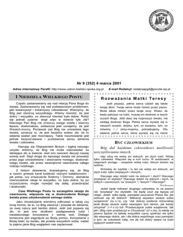 NR 9 (352)/1 PO GÓRACH, DOLINACH... 4 marca 2001 r. Nr 9 (352) 4 marca 2001 Adres internetowy Parafii: http://www.ustron.bielsko.opoka.org.pl I NIEDZIELA WIELKIEGO POSTU E-mail Redakcji: [email protected] RozwaŜania Matki Teresy Często zastanawiamy się nad relacją Pana Boga do świata. Zastanawiamy się nad podstawowym problemem, jaki towarzyszył i towarzyszy człowiekowi. Wierzymy, Ŝe Bóg jest stwórcą wszystkiego. Wiemy równieŜ, Ŝe jest dobry i wszystko, co stworzył równieŜ było dobre. Rodzi się jednak pytanie: skąd więc w świecie tyle zła? Dlaczego Pan Bóg nie zniszczy swego dzieła i stworzy lepsze, doskonalsze, zwłaszcza jeśli uznajemy, Ŝe jest Wszech-mocny. PoniewaŜ zaś Bóg nie unicestwia tego świata, oznacza to, Ŝe jest bezsilny wobec zła, Ŝe to właśnie szatan jest mocniejszy. Takie rozumowanie jest jednak bezpod-stawne i pozbawione sensu istnienia świata i człowieka. Jeśli piszesz, pełnia serca udzieli się takŜe twojej dłoni. Twoje serce moŜe mówić przez pismo. MoŜe takŜe mówić przez twoje oczy. Wiesz, Ŝe kiedy patrzysz na ludzi, muszą oni dostrzec w twych oczach Boga. Jeśli dasz się rozproszyć światu, nie zdołają dostrzec Boga. Pełnia serca wyraŜa się w naszych oczach, dotyku, tym, co piszemy, tym, co mówimy /.../ otrzy-mujemy, potrzebujemy. Oto właśnie pełnia serca, która wyraŜa się na róŜne Kierując się Objawieniem BoŜym i logiką naszego umysłu widzimy, Ŝe Bóg nie moŜe odpowiadać za istniejące zło w świecie. Jest ono owocem decyzji naszej wolnej woli. Stąd droga do lepszego świata nie prowadzi przez jego unicestwienie i stworzenie nowego, doskonalszego świata, ale przez wewnętrzne nawrócenie całego rodzaju ludzkiego. Bóg dał kaŜdemu człowiekowi moŜliwość uszczęśliwiania innych. Z historii zbawienia, dowiadujemy się, Ŝe Bóg w swoim gniewie karał ludzkość róŜnymi kataklizmami jak potop, czy zniszczenie Sodomy i Gomory. JednakŜe równocześnie ratuje to wszystko, co było dobre, by po oczyszczeniu mogło rozwijać się dalej, przeobraŜać i doskonalić. Czas Wielkiego Postu to szczególna okazja do nawrócenia, włączenia się w doskonalenie BoŜego świata przez udoskonalanie samego siebie. Jako chrześcijanie winniśmy odkrywać w takiej czy innej formie, Ŝe to, co Bóg stworzył i powołał do istnienia, ze swej natury jest bardzo dobre. Jeśli zaś pojawia się zło, to jest ono skutkiem postępowania ludzi i niewłaściwego korzystania z wolnej woli. Dlatego konieczne jest sięgnięcie po BoŜą pomoc. Korzystania z BoŜej łaski, by światu, ale przede wszystkim sobie, nadać to piękno jakie Bóg względem nas zaplanował. BYĆ CZŁOWIEKIEM Idąc ulicą nie widzę ani dobrych, ani złych ludzi. Widzę tylko człowieka. Włączam się w nurt ruchu. W autobusach, w wagonach pociągu - wszędzie widzę ludzi, którym bardzo się spieszy. Wchodzę do szpitala i tu teŜ nie widzę ani dobrych, ani złych ludzi, tylko cierpiących i chorych... Dlaczego więc dzielić ludzi na dobrych i złych? Dlaczego przylepiać im etykiety? Dlaczego dzielić na dobrych i złych, na Ŝółtych i czerwonych, na “prawych “ i “lewych”? Dlaczego? Phil Bosmans JeŜeli będę miłować drugiego człowieka, to na pewno nie “przylepię” mu etykietki, nie będę czuć się lepszą od niego. JeŜeli tylko będę pamiętać pouczenia Pisma Św. jak odnosić się do bliźnich: “Miłością oŜywieni słuŜcie sobie wzajemnie” (Ga 5,13), czy “Jak dobrzy szafarze róŜnorakiej łaski BoŜej słuŜcie sobie nawzajem tym darem, jak kaŜdy otrzymał” (1 P 4,10) lub “Przebaczajcie sobie wzajemnie, tak jak i Bóg nam przebaczył w Chrystusie” (Ef 4,32b), to wtedy na pewno będzie mi łatwiej wszystkie czyny spełniać nie tylko dla własnego dobra, ale i dla dobra wspólnego oraz pamiętać o tym, Ŝe cokolwiek robę, ma zły lub dobry wpływ na ludzi Ŝyjących wokół mnie. NR 9 (352)/2 4 marca 2001 r. PO GÓRACH, DOLINACH... KARDYNAŁ STEFAN WYSZYŃSKI - MIŁOŚĆ NA ŚMIERĆ NIE UMIERA czyli o losach Miłości na Drodze KrzyŜowej JEGO MYŚLI I MAKSYMY “Polska jest zespolona nie jednym węzłem, nie parcianym powrozem, Polska jest zespolona sercem wiary. Stacja III Jej siłą jest wiara Chrystusowa! Jej jednością jest moc nadprzyrodzonej łaski BoŜej! Jej nadzieją niezłomną jest pragnienie katolickiej Polski, Chrystusowej Polski!” “Ojcze wolności, któryś wolnością swoją obdarzył ludzi, niechby i dla mojego narodu coś z tych darów Twoich pozostało... wspomnij na Polskę”. WIELKO POSTN A MYŚL O JUD ASZ U Upadek nr 1 Judasz, uczeń Jezusa, człowiek z Kariotu przeszedł do historii jako ten, który wydał swego Mistrza Sanhedrynowi. Opis jego drogi Ŝyciowej splecionej z losami Zbawiciela świata to “mroczny” fragm. kaŜdej Ewangelii. Wg św. Jana Judasz zarządza wspólną kasą Nauczyciela i uczniów, i dopuszcza się sprze-niewierzeń. W czasie Ostatniej Wieczerzy Jezus mówił, Ŝe jeden z uczniów Go zdradzi. Judasz pyta - Czy ja Rabbi? W Getse-manii całując Mistrza w policzek wydaje Go Izraelitom. Po ukrzy-Ŝowaniu Ŝałuje swego czynu i chce zwrócić “zapłatę krwi”, lecz otrzymuje od arcykapłanów odpowiedź - Co nas to obchodzi. JuŜ się zmęczyła, na twarz padła, leŜy w błocie, czasem na asfalcie. Nie uniosła. Za cięŜko było. Ale unieść chciała. Za szybko leciała, bo miała być na czas. A tu trach i leŜy! A jak ktoś się wywraca, to radocha tym, co naokoło. /Leksykon Postaci Biblijnych/ Miłości, leŜałaś w uliczce przed Golgotą, więc wiesz! Jak to dobrze, Ŝe się upada z miłości. I jak to źle, gdy miłość upada! W Wielkim Poście niezmiennie nachodzi mnie myśl o Judaszu. Minęły dwa tysiące lat chrześcijaństwa a judaszowe srebrniki nadal pozostają symbolem zdrady i nieczystych intencji. Na początku kuszą, później stają się wyrzutem sumienia. Zastanawiam się, jak doszło do tego, Ŝe Judasz sprz