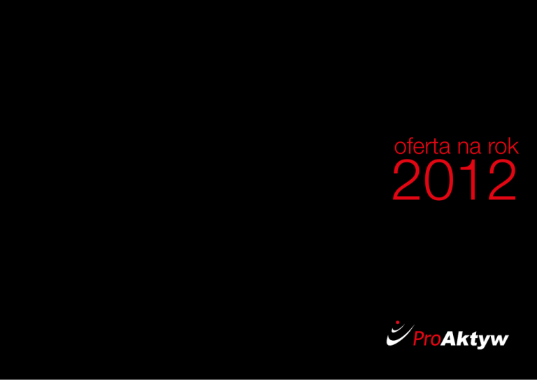 oferta na rok 2012 spis treści kim jesteśmy?3 poszukiwacze złota 25 wyjazdy INCENTIVE47 imprezy Integracyjne pikniki firmowe4 pokaz gimnastyki akrobatycznej 26 gry scenariuszowe 50 tangram27 gry terenowe52 quady6 off-road28 survival53 tyrolka7 ski touring 29 gry miejskie most linowy 8 przejażdżki motorówkami na solinie 30 oscariada57 strzelnica łucznicza i paintballowa 9 loty na poduszkowcach 31 teatrOFFnia59 budowa wieży ze skrzynek 32 sumo11 trekking w rakietach śnieżnych 33 imprezy tematyczne61 mega boisko piłkarskie pokaz capoeiry 34 paintball13 akademia bezpiecznej jazdy 35 turniej paintballowy – sup’airball 14 lot szybowcem 36 taśma do biegania 15 strzelectwo 37 lot na motoparalotni 16 bungee run 38 golf17 rowerki piwne 39 pokaz freestyle’u barmańskiego 18 zjeżdżalnie dino i tygrys 40 pokaz tancerzy z ogniem 19 byk – rodeo 41 pokaz pirotechniczny 20 lot balonem 42 szkolenie z zakresu pierwszej pomocy 21 rowerowe show krystiana herby 43 zajęcia z podstaw yogi 22 poweriser – skaczące szczudła 44 zajęcia z podstaw samoobrony 23 blok zabaw dla dzieci 45 psie zaprzęgi i skutery śnieżne 24 mobilna ścianka wspinaczkowa 10 12 56 brazyliada63 noc z kleopatrą 64 bollywood65 kuchenne rewolucje 66 karczma piwna 67 wieczór japoński 68 szkolenia69 akashi kaikyō 70 wynajem namiotów72 kontakt74 kim jesteśmy? PROAKTYW działa i sukcesywnie rozwija się od 2002 roku. Jesteśmy organizatorem imprez integracyjnych, wyjazdów zagranicznych dla firm, imprez tematycznych oraz pikników firmowych. Od początku prowadzenia naszej działalności szczególny nacisk kładziemy na jakość oferowanych usług oraz stałe rozszerzanie katalogu dostępnych atrakcji. Zdajemy sobie sprawę, że wraz ze wzrostem świadomości roli sprawnej komunikacji w firmie, potrzeby i oczekiwania klientów nieustannie się zmieniają i rosną, a naszym zadaniem jest je zaspokajać i wciąż zaskakiwać świeżością pomysłów. PR zaczyna się w domu, dlatego warto zadbać o potrzeby swoich pracowników i zainwestować w poprawę ich umiejętności komunikacyjnych oraz jakość wzajemnych relacji. 3 imprezy firmowe pikniki Integracyjne imprezy Integracyjne Marzeniem każdego szefa jest, aby jego zespół był zgrany i pracował wydajnie, atmosfera w firmie była miła, a osiem godzin pracy dziennie nie jawiło się jako wieczność. Jak to osiągnąć? Prostej recepty na sukces nie ma, ale jest sposób, aby pomóc pracownikom lepiej się poznać i ułatwić im dalszą współpracę. Organizowane przez nas imprezy integracyjne zapewniają: • świetną zabawę, • relaks ze współpracownikami, • zdrową rywalizację, • pozwalają znacząco członkami zespołu. poprawić komunikację między Nasza firma jest w stanie zorganizować imprezę w dowolnie wybranej przez Klienta konwencji, w każdym zakątku kraju. 5 quady • oderwanie od codzienności, • prędkość, • adrenalina, • wysiłek fizyczny Wszystko to gwarantuje jeden czterokołowy pojazd, którym można wjechać niemal wszędzie – quad. W naszej ofercie mamy ich 6 i możemy zorganizować wyprawę zarówno na trasach zaproponowanych przez klienta, jak i naszych własnych. 6 tyrolka Kolejka tyrolska to metoda pokonywania odcinka terenu pozbawionego wystarczającej rzeźby, czyli np. wąwozu, za pomocą zjazdu wspinacza w uprzęży, po napiętej linie rozciągniętej między dwoma stanowiskami. Oferowany przez nas zjazd po linie z wysokiej skarpy jest całkowicie bezpieczny oraz pozwala przełamać lęk i nabrać wiary we własne możliwości. 7 most linowy Most linowy to kolejna możliwość pokonania tego, co wydaje się być nie do przejścia, czyli np. przekroczenia w kilkanaście sekund rzeki albo wąwozu. Dzięki naszej ofercie można sprawdzić samego siebie i sprawić sobie niemałą frajdę. Wyzwanie warte podjęcia. 8 strzelnica łucznicza i paintballowa Nie trzeba być Robin Hoodem, żeby móc spróbować swoich sił w strzelectwie. Dzięki oferowanym przez nas dwóm stanowiskom łuczniczym i trzem tarczom paintballowym, każdy ma szansę sprawdzić swoją celność, a strzelnica paintballowa z powodzeniem nadaje się do użytku nawet przez dzieci, np. na pikniku. Satysfakcja ze strzału w dziesiątkę - bezcenna w każdym wieku. 9 mobilna ścianka wspinaczkowa Ścianka wspinaczkowa to doskonała forma aktywności ruchowej zarówno dla dzieci jak i dla dorosłych, która polega na dotarciu na szczyt przy pomocy przykręconych do ścianki uchwytów o przeróżnym kształcie. Oferowana przez nas ścianka ma 6 metrów wysokości, kilka dróg wchodzenia i jest mobilna. Każdy wspinający się jest asekurowany, zatem nie trzeba martwić się o bezpieczeństwo, ale skupić na planowaniu kolejnych ruchów w drodze na szczyt. 10 sumo Sumo to według japońskich legend walka bogów i swoisty rytuał. Dzięki specjalnym kostiumom i macie, którymi dysponujemy, każdy może w bardzo szybkim tempie osiągnąć wymaganą wagę (przynajmniej wizualnie) i wziąć udział w turnieju. Zasady turnieju są proste – należy powalić przeciwnika lub wypchnąć go poza matę. Dzięki materiałom z jakich wykonane są elementy niezbędne do zabawy oraz ich gąbczastemu wypełnieniu, całość widowiska jest bardzo bezpieczna i gwarantuje ubaw nie tylko uczestnikom, ale i publiczności. 11 mega boisko piłkarskie Niesamowicie popularne barowe piłkarzyki doczekały się swojej wersji makro. Tym razem jednak miejsce plastikowych postaci zajmują prawdziwi piłkarze, przypięci rzepowymi pasami do aluminiowych rur w nadmuchiwanym mega boisku. Wydaje się proste? Trzeba spróbować, żeby zobaczyć jak ograniczenie ruchów wzmaga chęć wygranej. 12 paintball Podstawowe zalety tej gry to przede wszystkim integracja wszystkich jej uczestników, poprzez wspólną realizację zadań oraz wyzwolenie ducha zdrowej rywalizacji, co sprawia, że paintball cieszy się wśród naszych klientów dużym powodzeniem. W grze biorą udział dwie dru