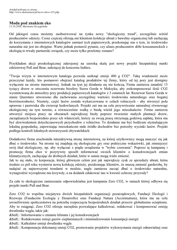 Artykuł pobrany ze strony http://www.ekonsument.pl/news-show-315.php Moda pod znakiem eko 11.10.2008, Marianna Szczygielska Od jakiegoś czasu możemy zaobserwować na rynku nowy "ekologiczny trend", szczególnie wśród producentów odzieży. Coraz częściej oferują oni klientom kolekcje ubrań z bawełny organicznej lub zachęcają do korzystania z internetowych katalogów zamiast tych papierowych, przekonując nas o tym, że środowisko naturalne nie jest im obojętne. Warto jednak postawić pytanie, czy alians producentów dóbr konsumenckich z ekologią to trwały partnerski związek, czy może tylko przelotny romans? Przykładem akcji proekologicznej zakrojonej na szeroką skalę jest nowy projekt hiszpańskiej marki odzieżowej Pull and Bear, należącej do koncernu Inditex. "Twoja wizyta w internetowym katalogu pozwala uniknąć emisji 400 g CO2". Taką wiadomość może przeczytać każdy, kto postanowi obejrzeć katalog produktów tej firmy, który od tej pory jest dostępny wyłącznie na stronie internetowej. Jednak na tym jej działania się nie kończą. Firma zamierza zasadzić 13 tysięcy drzew w otoczeniu rezerwatu biosfery Sierra Gorda w Meksyku, aby zrekompensować ilość CO2 wyemitowaną do atmosfery przy produkcji papierowych katalogów z 3 ostatnich lat. Rezerwat Sierra Gorda w stanie Queretaro utworzono dla zachowania szczególnej wartości środowiska naturalnego oraz bogatej bioróżnorodności. Niestety, część lasów została wykarczowana w celach rolniczych - aby stworzyć pola uprawne i pastwiska dla zwierząt hodowlanych. Projekt zaś ma na celu przywrócenie naturalnej równowagi ekologicznej na tym terenie, a równocześnie walkę z biedą wśród jego mieszkańców. Firma zamierza utworzyć miejsca pracy na obszarach największej biedy poprzez tworzenie małych plantacji drzew, zarządzanych bezpośrednio przez ich właścicieli, którzy za swoją pracę otrzymają godziwą zapłatę, która ma być ekwiwalentem dotychczasowych przychodów z rolnictwa. To działanie ma być bodźcem stymulującym lokalną gospodarkę, zapewniając mieszkańcom stałe źródło dochodów bez potrzeby wycinki lasów. Projekt podlega kontroli lokalnych stowarzyszeń obywatelskich. Dodatkowo firma uruchomiła interaktywną stronę internetową, na której użytkownicy mogą nauczyć się jak dbać o środowisko. Na stronie tej znajdują się ekologiczne gry oraz praktyczne wskazówki, jak zmniejszyć swój ślad ekologiczny, np. aby wyłączać z prądu urządzenia w "trybie czuwania". Poprzez tę kampanię i promocję firma chce w pozytywny sposób informować swoich klientów o konsekwencjach zmian klimatycznych, zachęcając do drobnych działań, które w sumie mogą wiele zmienić. Jak to się stało, że korporacja, której głównym celem jest jak największy zysk ze sprzedaży ubrań, która średnio co pół roku wystawia nową kolekcję odzieży, przekonując klientów, że muszą zmienić garderobę, by nadążać za najnowszymi trendami w modzie, nagle zamierza zacząć dbać o środowisko naturalne, wynagrodzić wyrządzone mu krzywdy, a na dodatek edukować nas w kwestii ochrony przyrody? Za całe to ekologiczne zamieszanie odpowiedzialna jest kampania Zero CO2, w ramach której odbywa się projekt marki Pull and Bear. Zero CO2 to wspólna inicjatywa dwóch hiszpańskich organizacji pozarządowych, Fundacji Ekologii i Rozwoju (Fundación Ecología y Desarrollo) oraz Fundacji Natura (Acciónnatura), która ma na celu uwrażliwienie społeczeństwa na potrzebę rozpoczęcia bezpośrednich działań przeciw globalnemu ociepleniu. Aby to osiągnąć, Zero CO2 oferuje narzędzia pozwalające kalkulować, redukować i kompensować emisję dwutlenku węgla, takie jak: • Informowanie o zmianie klimatu i jej konsekwencjach • Redukowanie emisji gazów cieplarnianych i minimalizowanie konsumpcji energii • Kalkulator emisji dwutlenku węgla • Kompensacja dokonanej emisji CO2, promowanie projektów wykorzystania energii odnawialnej oraz ograniczanie emisji CO2 w krajach rozwijających się. Aby zaradzić zmianom klimatu i ograniczyć emisję dwutlenku węgla, Zero CO2 proponuje realne i przejrzyste rozwiązania, które swoim zasięgiem powinny objąć różne sektory społeczeństwa: firmy, przedsiębiorstwa, administrację publiczną, organizacje pozarządowe oraz pojedynczych obywateli i obywatelki. Koordynatorzy tego programu uważają, że należy wykroczyć poza postanowienia Protokołu z Kioto - działania powinny być podjęte nie tylko na szczeblu państw czy wielkich korporacji, ale także na szczeblu lokalnym. Pragną, aby jak największa ilość osób zredukowała swój ślad ekologiczny oraz skompensowała ten już pozostawiony, między innymi poprzez wybieranie "czystych technologii". Każdy powinien uświadomić sobie, jak wielki ma wpływ na środowisko, i podjąć starania, aby zredukować swoją emisję CO2. Bardzo ważne jest zrozumienie, że zmiana klimatu jest problemem globalnym, który dotyczy każdego. Koncern Inditex w ramach swojej polityki środowiskowej najwidoczniej stara się otrzymać certyfikat "Zero CO2". Nadawanie znaku "Zero CO2" to najnowszy projekt kampanii, skierowany głównie do hiszpańskich firm, przedsiębiorstw, organizacji i administracji. Aby otrzymać ten specjalny znaczek, firma musi spełnić określone kryteria. Kolejne kroki nowej kampanii Pull and Bear pokrywają się z wymaganiami stawianymi przez fundacje, między innymi: kalkulacja oraz kompensacja emisji CO2, redukcja emisji gazów cieplarnianych, pomoc krajom południa w ograniczeniu tej emisji np. poprzez sadzenie lasów, a także dostarczanie informacji na temat efektu cieplarnianego i zmian klimatu na poziomie własnej organizacji, jak i na zewnątrz, w kontaktach z klientami. Certyfikat "Zero CO2" jest przyznawany na rok, następnie trzeba go odnawiać. Firmy, które chcą go uzyskać, podlegają kontroli fundacji. Jak się okazuje, hiszpańska akcja d