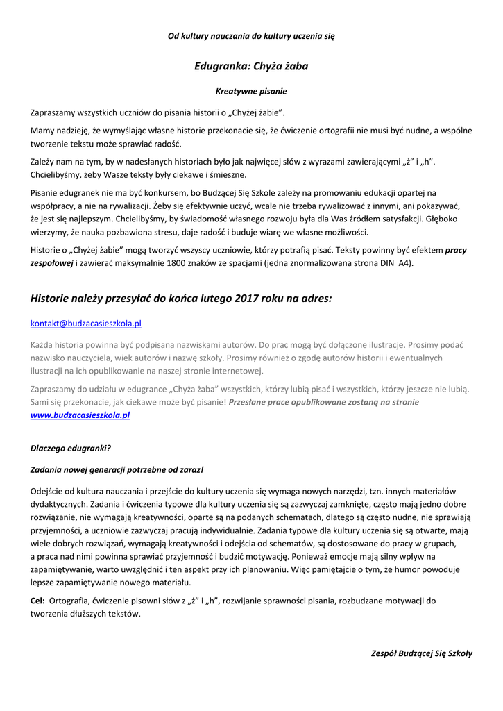 Od kultury nauczania do kultury uczenia się Edugranka: Chyża żaba Kreatywne pisanie Zapraszamy wszystkich uczniów do pisania historii o „Chyżej żabie”. Mamy nadzieję, że wymyślając własne historie przekonacie się, że ćwiczenie ortografii nie musi być nudne, a wspólne tworzenie tekstu może sprawiać radość. Zależy nam na tym, by w nadesłanych historiach było jak najwięcej słów z wyrazami zawierającymi „ż” i „h”. Chcielibyśmy, żeby Wasze teksty były ciekawe i śmieszne. Pisanie edugranek nie ma być konkursem, bo Budzącej Się Szkole zależy na promowaniu edukacji opartej na współpracy, a nie na rywalizacji. Żeby się efektywnie uczyć, wcale nie trzeba rywalizować z innymi, ani pokazywać, że jest się najlepszym. Chcielibyśmy, by świadomość własnego rozwoju była dla Was źródłem satysfakcji. Głęboko wierzymy, że nauka pozbawiona stresu, daje radość i buduje wiarę we własne możliwości. Historie o „Chyżej żabie” mogą tworzyć wszyscy uczniowie, którzy potrafią pisać. Teksty powinny być efektem pracy zespołowej i zawierać maksymalnie 1800 znaków ze spacjami (jedna znormalizowana strona DIN A4). Historie należy przesyłać do końca lutego 2017 roku na adres: [email protected] Każda historia powinna być podpisana nazwiskami autorów. Do prac mogą być dołączone ilustracje. Prosimy podać nazwisko nauczyciela, wiek autorów i nazwę szkoły. Prosimy również o zgodę autorów historii i ewentualnych ilustracji na ich opublikowanie na naszej stronie internetowej. Zapraszamy do udziału w edugrance „Chyża żaba” wszystkich, którzy lubią pisać i wszystkich, którzy jeszcze nie lubią. Sami się przekonacie, jak ciekawe może być pisanie! Przesłane prace opublikowane zostaną na stronie www.budzacasieszkola.pl Dlaczego edugranki? Zadania nowej generacji potrzebne od zaraz! Odejście od kultura nauczania i przejście do kultury uczenia się wymaga nowych narzędzi, tzn. innych materiałów dydaktycznych. Zadania i ćwiczenia typowe dla kultury uczenia się są zazwyczaj zamknięte, często mają jedno dobre rozwiązanie, nie wymagają kreatywności, oparte są na podanych schematach, dlatego są często nudne, nie sprawiają przyjemności, a uczniowie zazwyczaj pracują indywidualnie. Zadania typowe dla kultury uczenia się są otwarte, mają wiele dobrych rozwiązań, wymagają kreatywności i odejścia od schematów, są dostosowane do pracy w grupach, a praca nad nimi powinna sprawiać przyjemność i budzić motywację. Ponieważ emocje mają silny wpływ na zapamiętywanie, warto uwzględnić i ten aspekt przy ich planowaniu. Więc pamiętajcie o tym, że humor powoduje lepsze zapamiętywanie nowego materiału. Cel: Ortografia, ćwiczenie pisowni słów z „ż” i „h”, rozwijanie sprawności pisania, rozbudzane motywacji do tworzenia dłuższych tekstów. Zespół Budzącej Się Szkoły