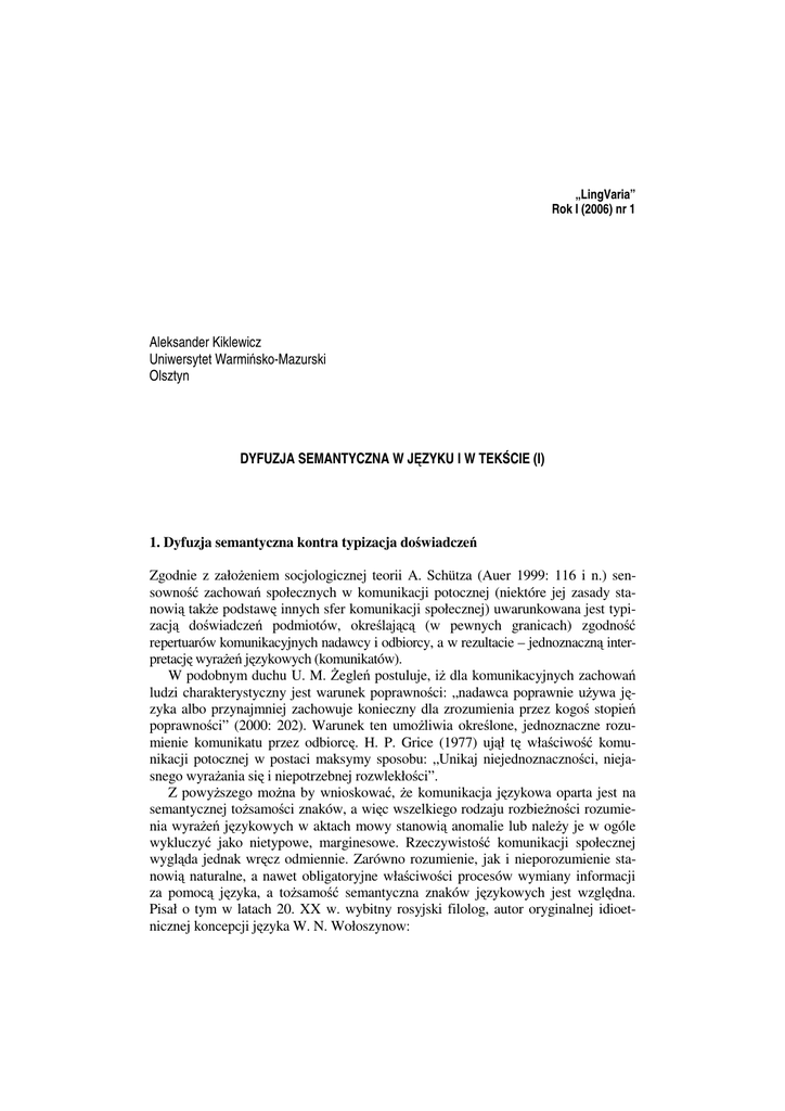 „LingVaria” Rok I (2006) nr 1 Aleksander Kiklewicz Uniwersytet Warmińsko-Mazurski Olsztyn DYFUZJA SEMANTYCZNA W JĘZYKU I W TEKŚCIE (I) 1. Dyfuzja semantyczna kontra typizacja doświadczeń Zgodnie z załoŜeniem socjologicznej teorii A. Schütza (Auer 1999: 116 i n.) sensowność zachowań społecznych w komunikacji potocznej (niektóre jej zasady stanowią takŜe podstawę innych sfer komunikacji społecznej) uwarunkowana jest typizacją doświadczeń podmiotów, określającą (w pewnych granicach) zgodność repertuarów komunikacyjnych nadawcy i odbiorcy, a w rezultacie – jednoznaczną interpretację wyraŜeń językowych (komunikatów). W podobnym duchu U. M. śegleń postuluje, iŜ dla komunikacyjnych zachowań ludzi charakterystyczny jest warunek poprawności: „nadawca poprawnie uŜywa języka albo przynajmniej zachowuje konieczny dla zrozumienia przez kogoś stopień poprawności” (2000: 202). Warunek ten umoŜliwia określone, jednoznaczne rozumienie komunikatu przez odbiorcę. H. P. Grice (1977) ujął tę właściwość komunikacji potocznej w postaci maksymy sposobu: „Unikaj niejednoznaczności, niejasnego wyraŜania się i niepotrzebnej rozwlekłości”. Z powyŜszego moŜna by wnioskować, Ŝe komunikacja językowa oparta jest na semantycznej toŜsamości znaków, a więc wszelkiego rodzaju rozbieŜności rozumienia wyraŜeń językowych w aktach mowy stanowią anomalie lub naleŜy je w ogóle wykluczyć jako nietypowe, marginesowe. Rzeczywistość komunikacji społecznej wygląda jednak wręcz odmiennie. Zarówno rozumienie, jak i nieporozumienie stanowią naturalne, a nawet obligatoryjne właściwości procesów wymiany informacji za pomocą języka, a toŜsamość semantyczna znaków językowych jest względna. Pisał o tym w latach 20. XX w. wybitny rosyjski filolog, autor oryginalnej idioetnicznej koncepcji języka W. N. Wołoszynow: 12 ALEKSANDER KIKLEWICZ Subiektywna świadomość mówiącego ma do czynienia z językiem wcale nie jako z systemem normatywnie toŜsamych form. Taki system stanowi jedynie abstrakcję [...] Mówiący kieruje swoją uwagę na konkretną wypowiedź, którą właśnie wygłasza. Chodzi mu o zastosowanie normatywnie toŜsamej formy [...] w danym konkretnym kontekście. Punktem cięŜkości będzie dla niego nie toŜsamość formy, lecz to nowe i konkretne znaczenie, które otrzymuje ona w danym kontekście. Dla mówiącego (a jak dowodzi Wołoszynow w kolejnych rozdziałach, takŜe dla słuchającego – A. K.) waŜna jest nie ta strona formy, która pozostaje niezmienna we wszystkich bez wyjątku przypadkach jej uŜycia [...] Przeciwnie, dla mówiącego waŜna jest ta strona formy językowej, dzięki której moŜna ją umieścić w konkretnym kontekście, dzięki której staje się ona znakiem konkretnej sytuacji [...] Dla mówiącego forma językowa waŜna jest nie jako stały i wciąŜ jednakowy sygnał, lecz jako zawsze zmienny i giętki znak (1977: 59). We współczesnej polskiej literaturze lingwistycznej podobne załoŜenie przyjmują przedstawiciele gramatyki komunikacyjnej (Awdiejew 2004: 15 i n.; KorŜyk 1999: 10 i n.). Przedmiotem tego artykułu jest dyfuzja semantyczna – zjawisko, które odzwierciedla dynamiczny, społecznie relewantny, socjo- i idiosynkratyczny charakter systemu języka jako podstawowego, naturalnego kodu komunikacji. Dyfuzję semantyczną definiujemy jako niedookreślenie czy teŜ niezdeterminowanie treści znaków językowych róŜnego formatu (morfemów, leksemów, grup wyrazowych, zdań, tekstów), rozmyty charakter granic między znaczeniami i kategoriami znaczeniowymi w semantycznym systemie języka oraz w komunikacji językowej. Dyfuzja semantyczna jest zjawiskiem wieloaspektowym, występującym zarówno w zakresie langue, jak i w zakresie parole. W kolejnych punktach omówione zostaną najwaŜniejsze typy dyfuzji semantycznej, z tym, Ŝe ramy artykułu zmuszają nas do pominięcia wielu istotnych szczegółów. 2. Dyfuzja semantyczna w systemie języka W systemie języka dyfuzję semantyczną odróŜniamy od kilku zjawisk pokrewnych, w szczególności od wieloznaczności (polisemii) wyrazów. Polisemia polega na przyporządkowaniu temu samemu leksemowi dwu lub więcej znaczeń funkcji nominatywnej (deskryptywnej). Tak więc wyraŜenie po norwesku funkcjonuje w dwu znaczeniach: 1) ‘w sposób właściwy Norwegom; w języku norweskim’ – na wzór tłumaczenia w słowniku wyraŜenia po angielsku; 2) ‘udawaną angielszczyzną’, por.: Zaprosił mnie na próbę. Nie mam pojęcia, jaka siła mnie popchnęła, bo strasznie się wstydziłam wszystkiego i wszystkich. Ale coś zaśpiewałam „po norwesku” (wymyśloną angielszczyzną) („Wysokie Obcasy” 2002, nr 15). Znaczenia polisemantów zakodowane są w systemie języka lub w jego subsystemach (odmianach), natomiast w komunikacji na odmienność treści leksemów wskazują specjalne wykładniki parawerbalne (np. cudzysłów, jak w powyŜszym przykładzie) lub kolokacje leksykalne (czyli kontekst syntagmatyczny), np. w połączeniu z rzeczownikiem wino przymiotnik biały realizuje znaczenie ‘jasny’ (G. K. Chesterton pisał, Ŝe białe wino ma kolor jasnoŜółty – 2004: 440). W tłumaczeniu słownikowym: DYFUZJA SEMANTYCZNA 13 białe wino = ‘wino z jasnych winogron’, zwraca się uwagę nie tyle na kolor obiektu, ile na jego pochodzenie. Pokrewieństwo zaś między polisemią a dyfuzją semantyczną polega na tym, Ŝe wieloznaczność wyrazów moŜe leŜeć u podstaw zjawiska ekwiwokacji czy teŜ parasemii, o którym będzie mowa w punkcie 3.1 (w drugiej części artykułu). Dyfuzję semantyczną naleŜy odróŜniać takŜe od kategorii aproksymacji oraz kategorii nieokreśloności (por. Vagheit w fundamentalnej rozprawie S. Dönninghaus, 2005), za pomocą których w planie asercyjnej treści wypowiedzi lub tekstu przekazywana jest informacja o braku wiedzy podmiotu językowego na temat opisywanej sytuacji lub jednego z je