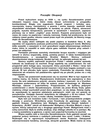 Początki Okupacji Przed wybuchem wojny w 1939 r., na rynku Szczebrzeskim przed ratuszem kopano rowy, które miały dawać schronienie w przypadku bombardowań. Biegły one zygzakami. Kopali znajomi i koledzy ojca, nauczyciele, kupcy, rzemieślnicy, a pewnie i wolne zawody- spełniali swój obywatelski obowiązek. Wyglądało to bardziej na piknik. Piękna, słoneczna pogoda, wysoka temperatura, panowie w spodniach i koszulach, zapewne pierwszy raz w takim „negliżu” poza domem. Kopanie przerywane było od czasu do czasu na papierosa i wesołą rozmowę. Każdy był przekonany, że nie oddamy nawet guzika, nikomu nawet przez myśl nie przeszło, że Niemcy mogą dojść do Szczebrzeszyna. Na szyby okien naklejało się paski papieru w kształcie litery X, aby zapobiec ich wypadaniu podczas podmuchów eksplodujących bomb. Mieliśmy żółte saszetki, z zaszytymi w nich granulkami węgla aktywowanego wielkości maku, które to saszetki w razie użycia gazu należało trzymać przy ustach i przez nie oddychać. Pamiętam pierwsze samoloty niemieckie lecące wysoko i migające jak iskierki w słońcu wspaniałej, złotej, polskiej jesieni. A także bombardowanie Szczebrzeszyna, a szczególnie Brodów Małych. Niemcy usiłowali zbombardować stację kolejową. Skutek był taki, że spłonęła połowa tej wsi. Niemcy szybko zajmowali terytorium Polski i władze polskie wezwały ludność do ewakuacji na wschód. Drogi zapełniły się uciekinierami. Do nas przyjechał jakiś kolega ojca, nauczyciel, który pochodził z Niska i teraz tam uciekał do rodziny. Ponieważ jechał rowerem i miał dużo bagażu zostawił u nas plecak. W tym plecaku było sporo czekolady. Powolutku jej ubywało- kiedy właściciel we wrześniu lub październiku zgłosił się po plecak, prawe nic z niej niepozostało. Ojciec też postanowił ewakuować się na wschód. Miał to być wyjazd do rodziny mamy, do Sokala. Wyszykowano drabiniasty wóz zaprzężony w dwa konie. Na wóz załadowano pościel, ubrania, bieliznę i żywność. Ja z triumfem wyniosłem podarowany mi kilka lat wstecz, przez chrzestnego dr. Wacława Niechaja, sztucer i pojechaliśmy. Przypuszczam, że byliśmy jedynymi uciekinierami z okolic Szczebrzeszyna. Jechało się przez Brody Duże, gdzie niektórzy chłopi wychodzili przed dom popatrzyć, co się dzieje. Dzisiaj myślę, że wywoływało to ogromne zdziwienie patrzących- mieli nas oni pewnie za pomyleńców. Omijając Zamość dotarliśmy do odległych o 30 km Łabuń. Tam zatrzymaliśmy się na noc, a może i dłużej, niedaleko dużych stawów. Było tam już mnóstwo ludzi i furmanek, i tam prawdopodobnie podjęto decyzję o powrocie. Wróciliśmy przez Kosobudy do gajowego Lotza, do gajówki Krzywe. Zastaliśmy tam Waligórę właściciela fabryki kalafonii i terpentyny „ALWA” (skrót od Aleksander Waligóra) z Brodów Małych z żoną i synem, którzy zatrzymali się u drugiego gajowego Kawki. Waligórowie mieli z sobą samochód. Była to wielka atrakcja, więc dlatego utkwiła mi w pamięci. My z mamą zostaliśmy w gajówce, a ojciec sam pojechał furmanką na wschód. Wojna szybko szła w kierunku Szczebrzeszyna. Koło gajówki zaczęli się pojawiać polscy żołnierze z rozbitych jednostek dwu armii: Lublin i Kraków. Rozbrajali się w ogromnych kompleksach lasów Roztocza. Zakopywali zakonserwowane karabiny, amunicję, skrzynki granatów. Miała mama ze mną utrapienie. Całe dnie spędzałem z żołnierzami urywając się na wiele godzin od jej nadzoru. Wiedziałem gdzie są zakopane karabiny, naboje i inne wyposażenie. Po kilku dniach zjawili się nieoczekiwanie koło gajówki Niemcy. Częstowali dzieci cukierkami, których nie pozwalano nam jeść, bowiem, jak ostrzegały tuż przed wybuchem wojny polskie władze, Niemcy mieli zrzucać z samolotów zatrute cukierki, zatruwać studnie itp. Po kilku dniach postanowiliśmy wracać do domu. Wszędzie pełno było Niemców. W Szczebrzeszynie sklepy zamknięte, nic nie można było kupić. Najgorszy był brak zapałek i soli, które trzeba było dowieźć z fabryk i kopalni. A pociągi nie jeździły. To też w późniejszych latach każdy robił zapas tego dobra w domu. Mama pamiętając zapewne pierwszą wojnę światową i długie walki koło Sokala, wiedziała, że trzeba zrobić zapas tych produktów wcześniej. Tuż przed wybuchem wojny zakupiła spore ich ilości, np. niewielki worek soli. Utkwiło mi to w pamięci, gdyż obdarowywała nią sąsiadów. Po pewnym czasie ojciec wrócił z ucieczki na wschód. Zaczęła się niemiecka okupacja. Z jej pierwszych dni pamiętam żołnierzy niemieckich we włożonych na mundury maskujące płachtach, które przemyślnie spięte tworzyły płaszcze przeciwdeszczowe, a po złączeniu kilku razem tworzyły namiot. Zapamiętałem przemarsz kolumny jeńców polskich. Przyszli oni od strony Zwierzyńca i nocowali na łąkach. Stosunek Niemców do jeńców był poprawny- pozwalano np. ludziom przynosić im żywność. Innym zdarzeniem był widok pięciu polskich kawalerzystów w pełnym uzbrojeniu, którzy przyjechali prawie pod sam szpital, a dokładnie do wylotu ulicy Zamkowej przy ówczesnej przychodni zdrowia. Zsiedli z koni i przypatrywali się z odległości 80 metrów maszerującym od strony Zamościa do Zwierzyńca niemieckim kolumnom piechoty i samochodów. Stałem koło nich chyba kilkanaście minut- nigdy tak z bliska nie widziałem kawalerzystów. Niemcy pierwszy raz wkroczyli do Szczebrzeszyna wieczorem 13.9.1939 r. W dwa tygodnie później, 27.9.1939 r., weszła na miejsce Niemców Armia Czerwona, bowiem granica pomiędzy Rosją a Niemcami miała być tam, gdzie była za carskiej Rosji, z grubsza biorąc na Wiśle. Od strony Zwierzyńca pokazał się samochód, na którym siedziało kilkudziesięciu czerwonoarmistów. Ubrani byli w sięgające prawie do ziemi szynele, u dołu nieobrębione skąd fruwały pojedyncze nitki. Pasy mieli nie skórzane a parciane, kara
