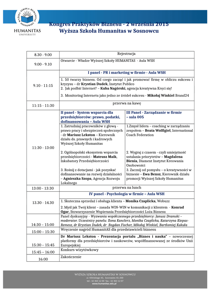 Kongres Praktyków Biznesu - 2 września 2015 Wyższa Szkoła Humanitas w Sosnowcu Rejestracja 8.30 - 9.00 9.00 - 9.10 Otwarcie - Władze Wyższej Szkoły HUMANITAS - Aula WSH I panel - PR i marketing w firmie - Aula WSH 9.10 - 11:15 1. 50 twarzy biznesu. Od czego zacząć i jak promować firmę w obliczu sukcesu i kryzysu – dr Krystian Dudek, Instytut Publico 2. Jak podbić Internet? – Kuba Nagórski, agencja kreatywna Kręci się! 3. Monitoring Internetu jako jedno ze źródeł sukcesu - Mikołaj Winkiel Brand24 przerwa na kawę 11:15 - 11:30 11:30 - 13:00 13:00 - 13:30 II panel - System wsparcia dla przedsiębiorców: prawo, podatki, dofinansowania – Aula WSH 1. Zatrudniaj pracowników z głową prawo pracy i ubezpieczeń społecznych - dr Mariusz Lekston – Kierownik działu ds. prawnych i kadrowych Wyższej Szkoły Humanitas III Panel - Zarządzanie w firmie – sala 005 2. Ogólnopolski ekosystem wsparcia przedsiębiorczości - Mateusz Maik, Inkubatory Przedsiębiorczości 2. Wygraj z czasem - czyli umiejętność ustalania priorytetów – Magdalena Bienia, Diament Instytut Kreowania Osobowości 3. Zacznij od pomysłu – o kreatywności w biznesie – Ewa Bensz, Kierownik działu promocji Wyższej Szkoły Humanitas 1.Zmysł lidera – coaching w zarządzaniu zespołem – Beata Wolfigiel, International Coach Federation 3. Rośnij z dotacjami - jak pozyskać dofinansowanie na rozwój działalności – Agnieszka Szopa, Agencja Rozwoju Lokalnego przerwa na lunch IV panel - Psychologia w firmie – Aula WSH 13.30 - 14.30 14:30 – 15:00 15:00 – 15:30 15:30 – 15:45 15:45 – 16:00 16:00 1. Skuteczna sprzedaż i obsługa klienta – Monika Czaplicka, Wobuzz 2. Myśl jak Twój klient – zasada WIN-WIN w komunikacji z klientem - Konrad Ogar, Stowarzyszenie Wspierania Przedsiębiorczości Loża Biznesu Panel dyskusyjny - Wyzwania współczesnego przedsiębiorcy: Janusz Dramski – moderator. Uczestnicy panelu: Ilona Kanclerz, Monika Czaplicka, Katarzyna KiepasRemesz, dr Krystian Dudek, dr Bogdan Fischer, Mikołaj Winkiel, Bartłomiej Kukuła Wręczenie nagród HumanitAS dla przedstawicieli biznesu Dr Mariusz Lekston - Prezentacja portalu „Biznes i nauka” – nowoczesnej platformy dla przedsiębiorców i naukowców, współfinansowanej ze środków Unii Europejskiej Konkurs wizytówkowy Zakończenie