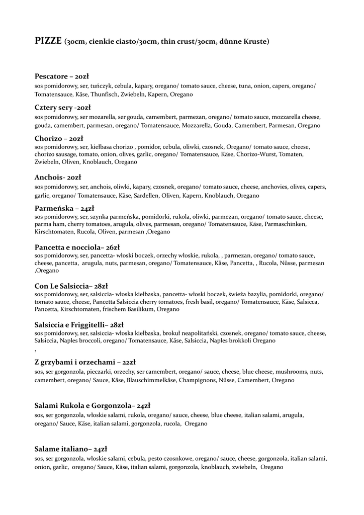 PIZZE (30cm, cienkie ciasto/30cm, thin crust/30cm, dünne Kruste) Pescatore – 20zł sos pomidorowy, ser, tuńczyk, cebula, kapary, oregano/ tomato sauce, cheese, tuna, onion, capers, oregano/ Tomatensauce, Käse, Thunfisch, Zwiebeln, Kapern, Oregano Cztery sery -20zł sos pomidorowy, ser mozarella, ser gouda, camembert, parmezan, oregano/ tomato sauce, mozzarella cheese, gouda, camembert, parmesan, oregano/ Tomatensauce, Mozzarella, Gouda, Camembert, Parmesan, Oregano Chorizo – 20zł sos pomidorowy, ser, kiełbasa chorizo , pomidor, cebula, oliwki, czosnek, Oregano/ tomato sauce, cheese, chorizo sausage, tomato, onion, olives, garlic, oregano/ Tomatensauce, Käse, Chorizo-Wurst, Tomaten, Zwiebeln, Oliven, Knoblauch, Oregano Anchois- 20zł sos pomidorowy, ser, anchois, oliwki, kapary, czosnek, oregano/ tomato sauce, cheese, anchovies, olives, capers, garlic, oregano/ Tomatensauce, Käse, Sardellen, Oliven, Kapern, Knoblauch, Oregano Parmeńska – 24zł sos pomidorowy, ser, szynka parmeńska, pomidorki, rukola, oliwki, parmezan, oregano/ tomato sauce, cheese, parma ham, cherry tomatoes, arugula, olives, parmesan, oregano/ Tomatensauce, Käse, Parmaschinken, Kirschtomaten, Rucola, Oliven, parmesan ,Oregano Pancetta e nocciola– 26zł sos pomidorowy, ser, pancetta- włoski boczek, orzechy włoskie, rukola, , parmezan, oregano/ tomato sauce, cheese, pancetta, arugula, nuts, parmesan, oregano/ Tomatensauce, Käse, Pancetta, , Rucola, Nüsse, parmesan ,Oregano Con Le Salsiccia– 28zł sos pomidorowy, ser, salsiccia- włoska kiełbaska, pancetta- włoski boczek, świeża bazylia, pomidorki, oregano/ tomato sauce, cheese, Pancetta Salsiccia cherry tomatoes, fresh basil, oregano/ Tomatensauce, Käse, Salsicca, Pancetta, Kirschtomaten, frischem Basilikum, Oregano Salsiccia e Friggitelli– 28zł sos pomidorowy, ser, salsiccia- włoska kiełbaska, brokuł neapolitański, czosnek, oregano/ tomato sauce, cheese, Salsiccia, Naples broccoli, oregano/ Tomatensauce, Käse, Salsiccia, Naples brokkoli Oregano , Z grzybami i orzechami – 22zł sos, ser gorgonzola, pieczarki, orzechy, ser camembert, oregano/ sauce, cheese, blue cheese, mushrooms, nuts, camembert, oregano/ Sauce, Käse, Blauschimmelkäse, Champignons, Nüsse, Camembert, Oregano Salami Rukola e Gorgonzola– 24zł sos, ser gorgonzola, włoskie salami, rukola, oregano/ sauce, cheese, blue cheese, italian salami, arugula, oregano/ Sauce, Käse, italian salami, gorgonzola, rucola, Oregano Salame italiano– 24zł sos, ser gorgonzola, włoskie salami, cebula, pesto czosnkowe, oregano/ sauce, cheese, gorgonzola, italian salami, onion, garlic, oregano/ Sauce, Käse, italian salami, gorgonzola, knoblauch, zwiebeln, Oregano Kurczak na białym sosie - 20zł Biały sos, ser, kurczak, cebula, rukola, pomidorki koktajlowe/ White sauce, cheese , chicken, onions , arugula , cherry tomatoes/ Weißer Soße , Käse , Zwiebeln, Huhn, Rucola , Kirschtomaten Alla carbonara - 22zł Biały sos, pancetta-włoski boczek, ser, cebula, rukola, / White sauce, cheese , pancetta , onions , arugula , / Weißer Soße , Käse , Zwiebeln, pancetta, Rucola , Pomidory z mascarpone – 25zł sos pomidorowy, ser, mascarpone, pomidorki, suszone pomidory, rukola, oregano, balsamico/ tomato sauce, cheese, mascarpone, cherry tomatoes, arugula, sun-dried tomatoes, oregano, balsamico/ Tomatensauce, Käse, mascarpone, Kirschtomaten, Rucola, getrockneten Tomaten ,Oregano Rucola e Pesto – 28zł sos pomidorowy, ser, pesto bazyliowe, pomidorki, suszone pomidory, oregano, balsamico/ tomato sauce, cheese, Basil pesto, cherry tomatoes, arugula, sun-dried tomatoes, oregano, balsamico/ Tomatensauce, Käse, BasilikumPesto, Kirschtomaten, Rucola, getrockneten Tomaten ,Oregano Neapolitana – 20zł sos pomidorowy, ser , ser mozzarella miękka, pomidorki, świeża bazylia, oregano/ tomato sauce, cheese, sliced mozzarella, cherry tomatoes, fresh basil, oregano/ Tomatensauce, Käse, Aufschnitt, Mozzarella, Kirschtomaten, frischem Basilikum, Oregano Frutti di mare– 34zł sos pomidorowy, ser, krewetki tiger, małże, tuńczyk, cebula, czosnek, kaparym, oregano/ tomato sauce, cheese,shrimp tuna, garlic, onion, clams, capers, oregano/ Tomatensauce, Käse, garnele,Thunfisch, Zwiebeln, venusmuscheln, knoblauch, Kapern , Oregano Frutti di mare e basilico– 32zł sos pomidorowy, ser, krewetki tiger, małże, pomidorki, mascarpone, świeża bazylia, balsamico, oregano/ tomato sauce, cheese,shrimp, clams, cherry tomatoes, mascarpone, balsamico, resh basil,oregano/ Tomatensauce, Käse, garnele , Kirschtomaten,mascarpone , venusmuscheln knoblauch , frischem Basilikum,balsamico, Oregano Frutti di mare bianco– 32zł biały sos, ser, krewetki tiger, małże, rukola, pomidorki, oregano/ white sauce, cheese,shrimp, clams, cherry tomatoes, arugula,oregano/ Weißer Soße, Käse, garnele , Kirschtomaten, rucola, venusmuscheln, Oregano Mista – 26zł sos pomidorowy, ser, grilowana cukinia, grilowany bakłażan, grilowana papryka, pieczarki, oregano/ tomato sauce, grilled zucchini, grilled peppers, grilled eggplant, mushrooms, cheese, oregano/ Tomatensauce, gegrillten Zucchin, gegrillte Auberginen,Käse,gegrillte Paprika, Champignons, Oregano Tartufo– 30zł sos pomidorowy, ser, pasta z czarnych trufli, gorgonzola, oregano/ tomato sauce, cheese, truffles,gorgonzola, oregano/ Tomatensauce, Käse, gorgonzola, Trüffel, Oregano Salame e Tartufo– 30zł sos pomidorowy, ser, pasta z czarnych trufli, włoskie salami, mascarpone, oregano/ tomato sauce, cheese, truffles, italian salami, mascarpone, oregano/ Tomatensauce, Käse, italian salami, mascarpone, Trüffel, Oregano Carne– 24zł sos pomidorowy, ser, włoskie salami, pancetta- włoski boczek, włoska gotowana szynka, pieczarki,oregano/ tomato sauce, cheese, ham,Pancetta, salami, mushrooms, oregano/ Tomatensauce, Käse, Salsicca, Pancetta, salami,schinken, Champignons, Oregano Lubiane przez dzieci PIZZE (30cm, cienkie ciasto/30cm, thin crust/30cm, dünne Kr