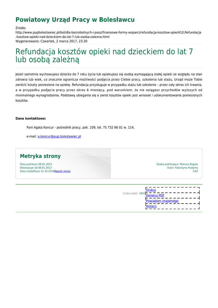 Powiatowy Urząd Pracy w Bolesławcu Źródło: http://www.pupboleslawiec.pl/bol/dla-bezrobotnych-i-posz/finansowe-formy-wsparci/refundacja-kosztow-opie/410,Refundacja -kosztow-opieki-nad-dzieckiem-do-lat-7-lub-osoba-zalezna.html Wygenerowano: Czwartek, 2 marca 2017, 23:30 Refundacja kosztów opieki nad dzieckiem do lat 7 lub osobą zależną Jeżeli samotnie wychowujesz dziecko do 7 roku życia lub opiekujesz się osobą wymagającą stałej opieki ze względu na stan zdrowia lub wiek, co znacznie ogranicza możliwości podjęcia przez Ciebie pracy, szkolenia lub stażu, Urząd może Tobie zwrócić koszty poniesione na opiekę. Refundacja przysługuje w przypadku stażu lub szkolenia – przez cały okres ich trwania, a w przypadku podjęcia pracy przez okres 6 miesięcy, pod warunkiem, że nie osiągasz przychodów wyższych od minimalnego wynagrodzenia. Podstawą ubiegania się o zwrot kosztów opieki jest wniosek i udokumentowanie poniesionych kosztów. Dane kontaktowe: Pani Agata Koncur - pośrednik pracy, pok. 109, tel. 75 732 66 01 w. 114, e-mail: [email protected] Metryka strony Data publikacji 08.01.2013 Obowiązuje od 08.01.2013 Data modyfikacji 12.10.2016Rejestr zmian Osoba publikująca: Mariusz Rogala Autor: Katarzyna Hudyma CAZ Liczba wejść: 1843 Drukuj Generuj PDF Powiadom znajomego Wstecz